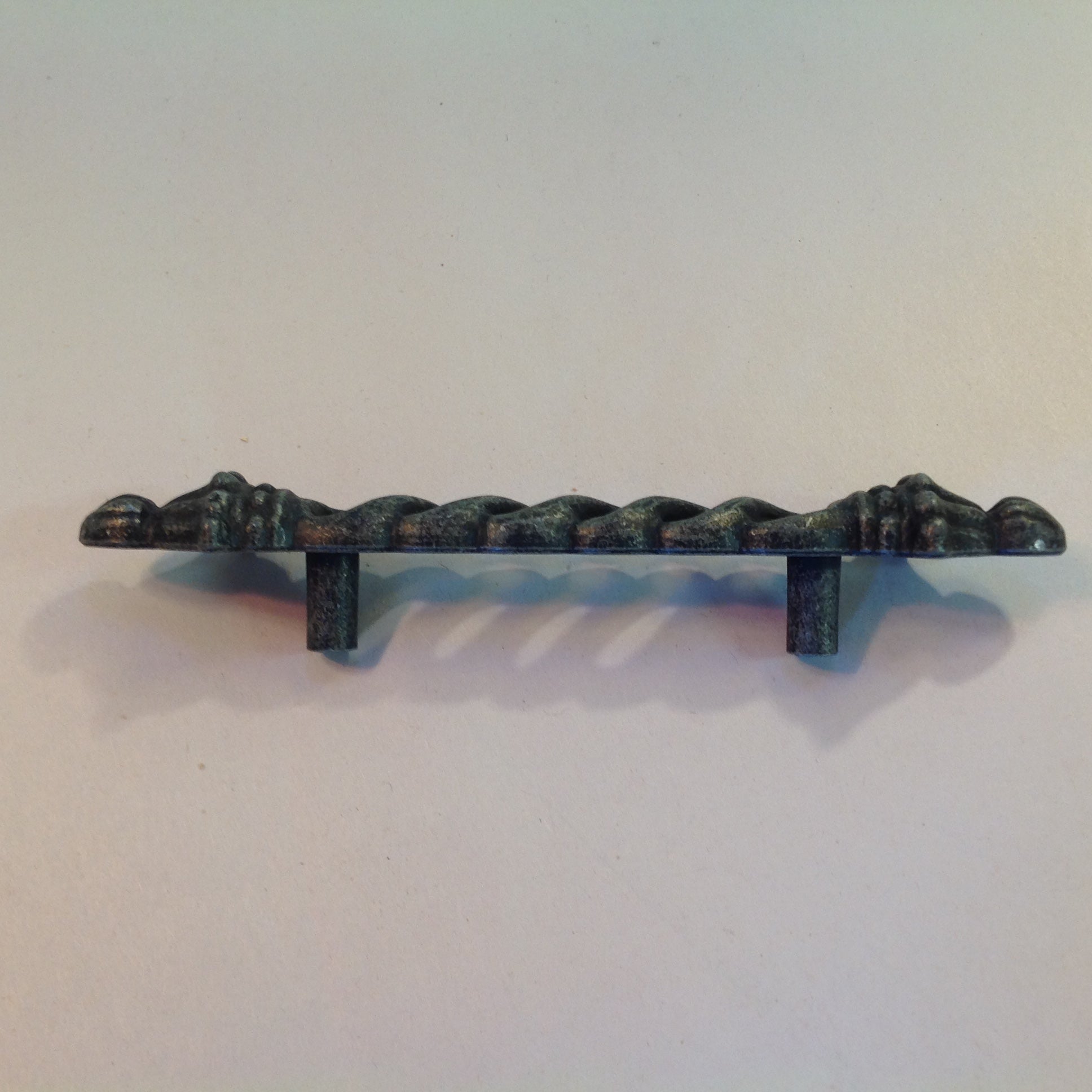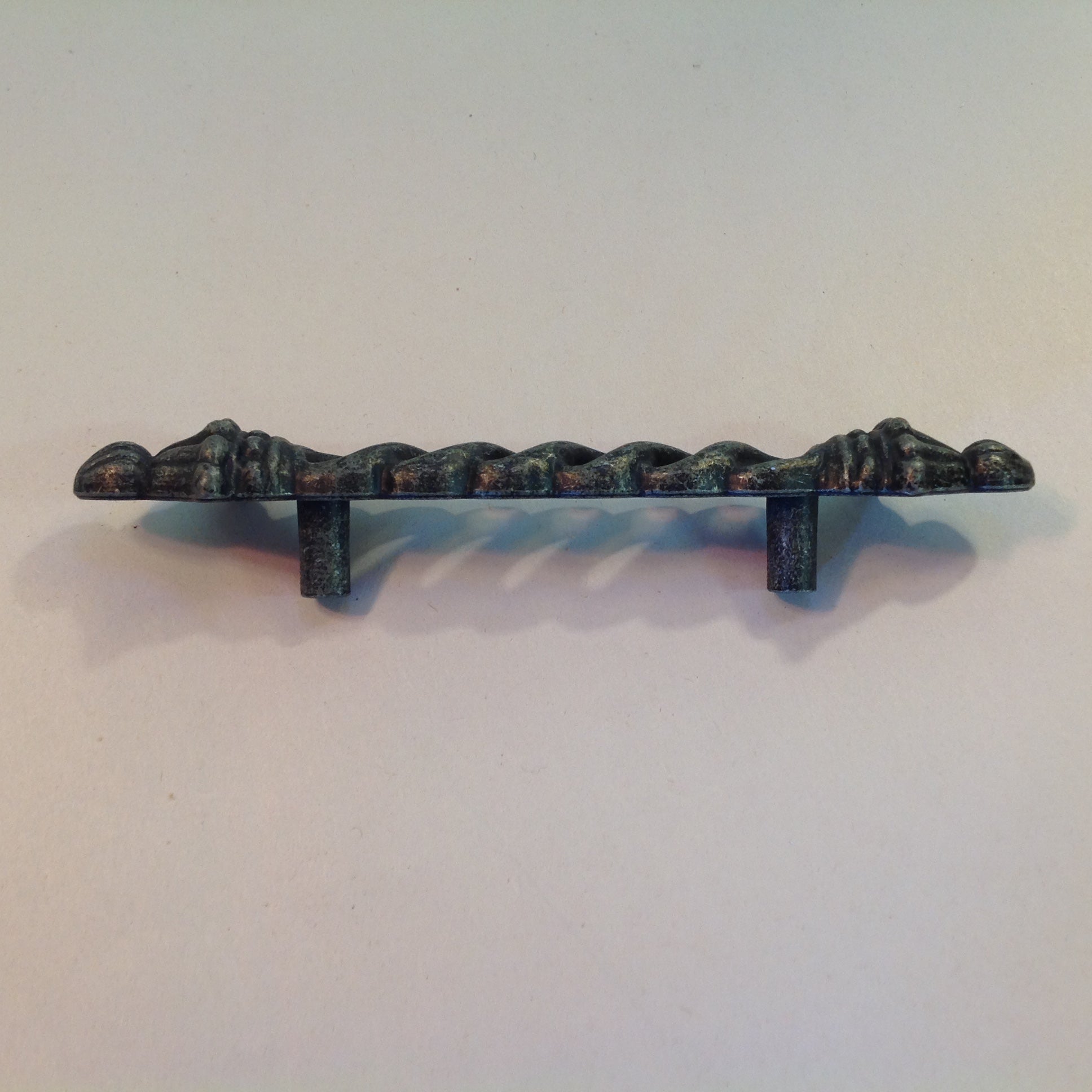 This is a vintage used item, in good used condition, with light signs of age/wear; there is mild rubbing to surface of pewter, mild wear along/about rear face near screw wells. Overall metal quality is good; clean/smooth, with excellent preservation of color/sheen and figural embellishments still bold/clear. There are no excessive nicks, chips, dents, divots, scrapes, scratches, scuffs, cracks, breaks, stains, residue or repairs. Each drawer pull measures approx 6" x 1" at widest point and includes mounting bolts.