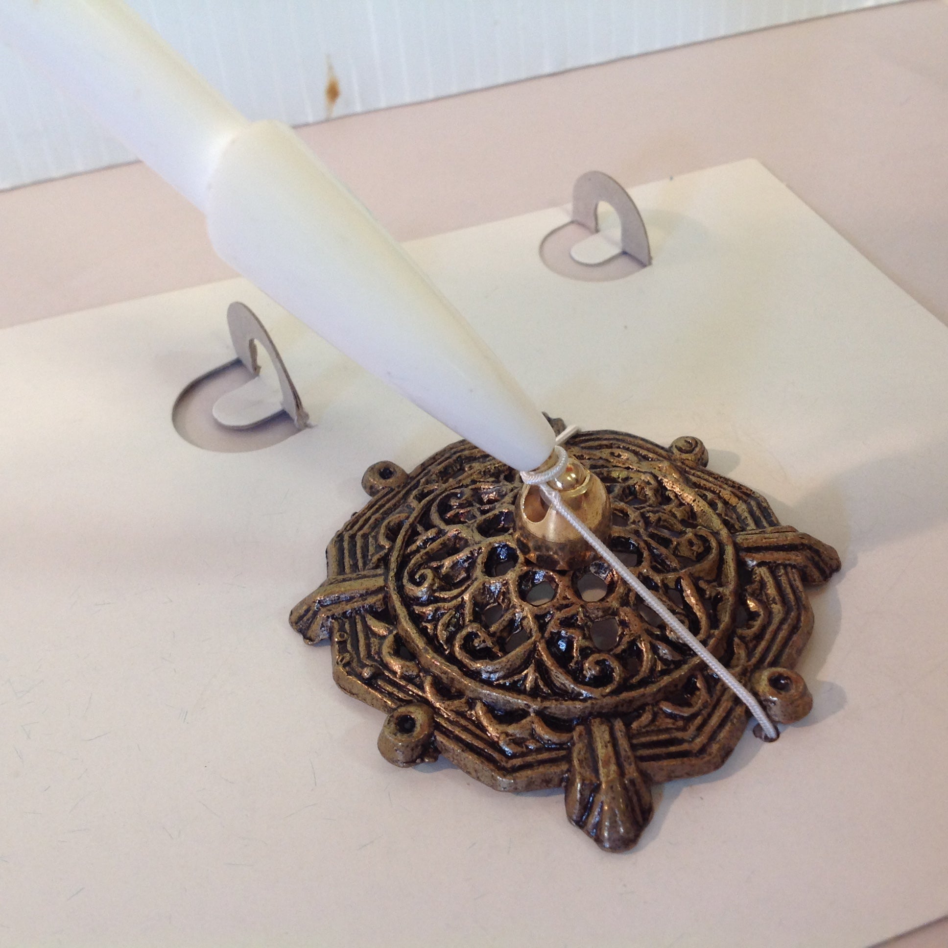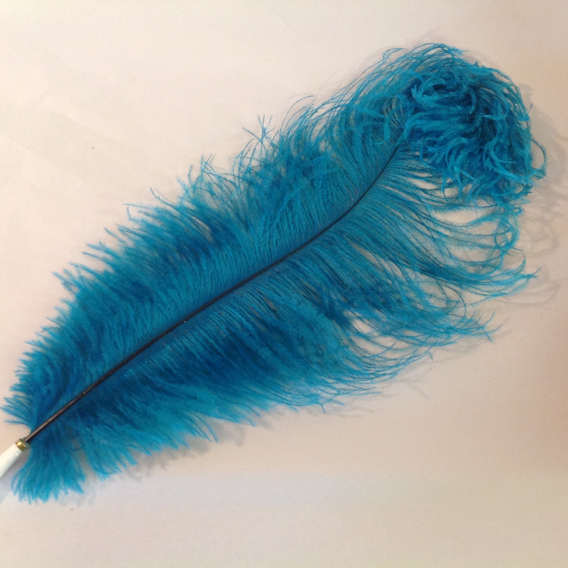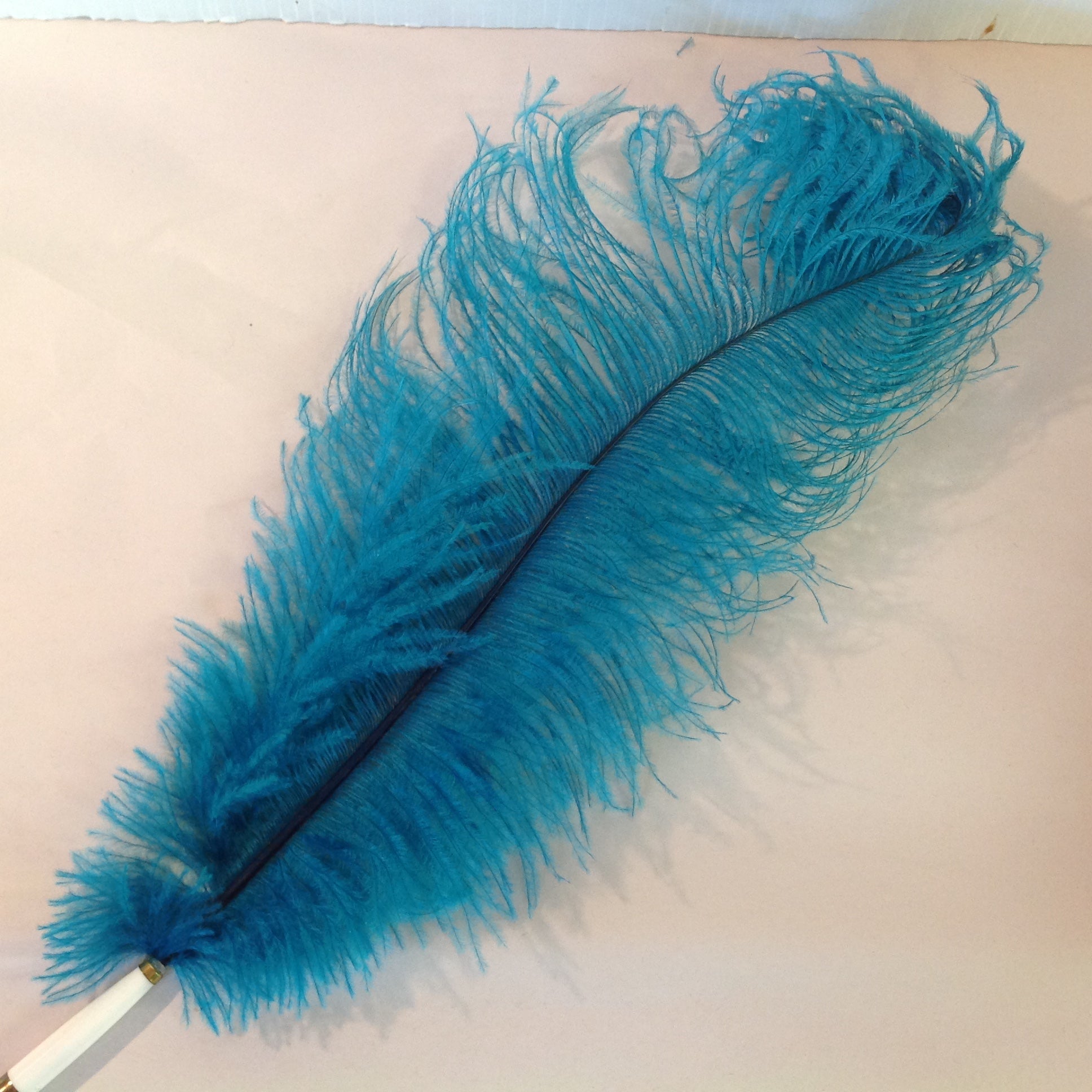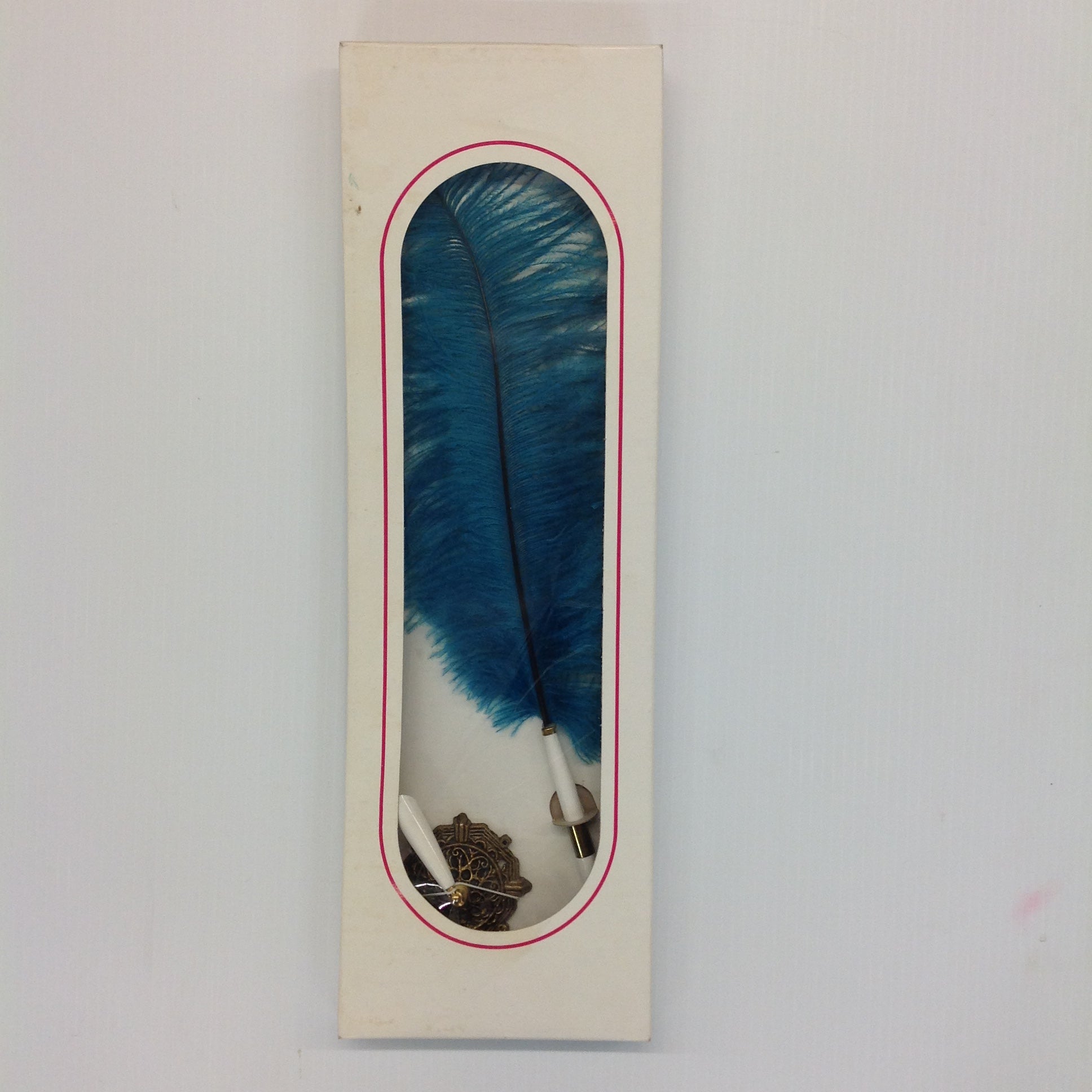 This is a vintage used item, in good used condition, with light signs of age/wear; pen and base are still in their original packaging, which has been opened and shows light wear; there is minor rubbing to surface of brass base, minor wear to plastic sleeve and feather quill of pen. Overall quality is good; smooth/glossy, with excellent retention of sheen and color; brass finial embellishments remain sharp/clear. There are no excessive nicks, chips, dents, divots, scrapes, scratches, scuffs, cracks, breaks, stains, residue or repairs. The quill pen measures approx 18" long, while base is approx 2.25" round.
