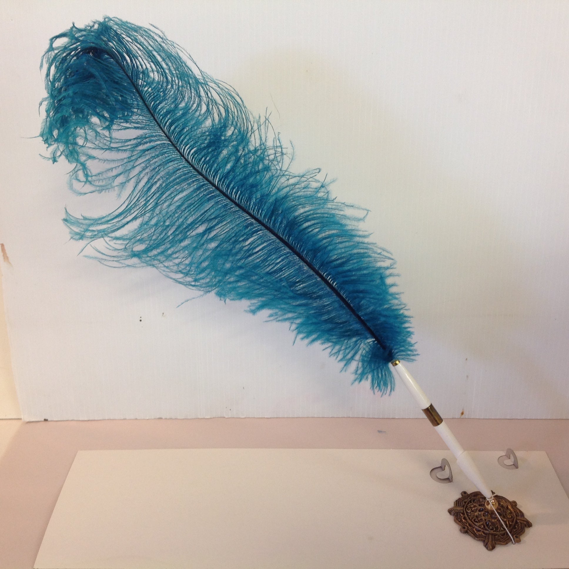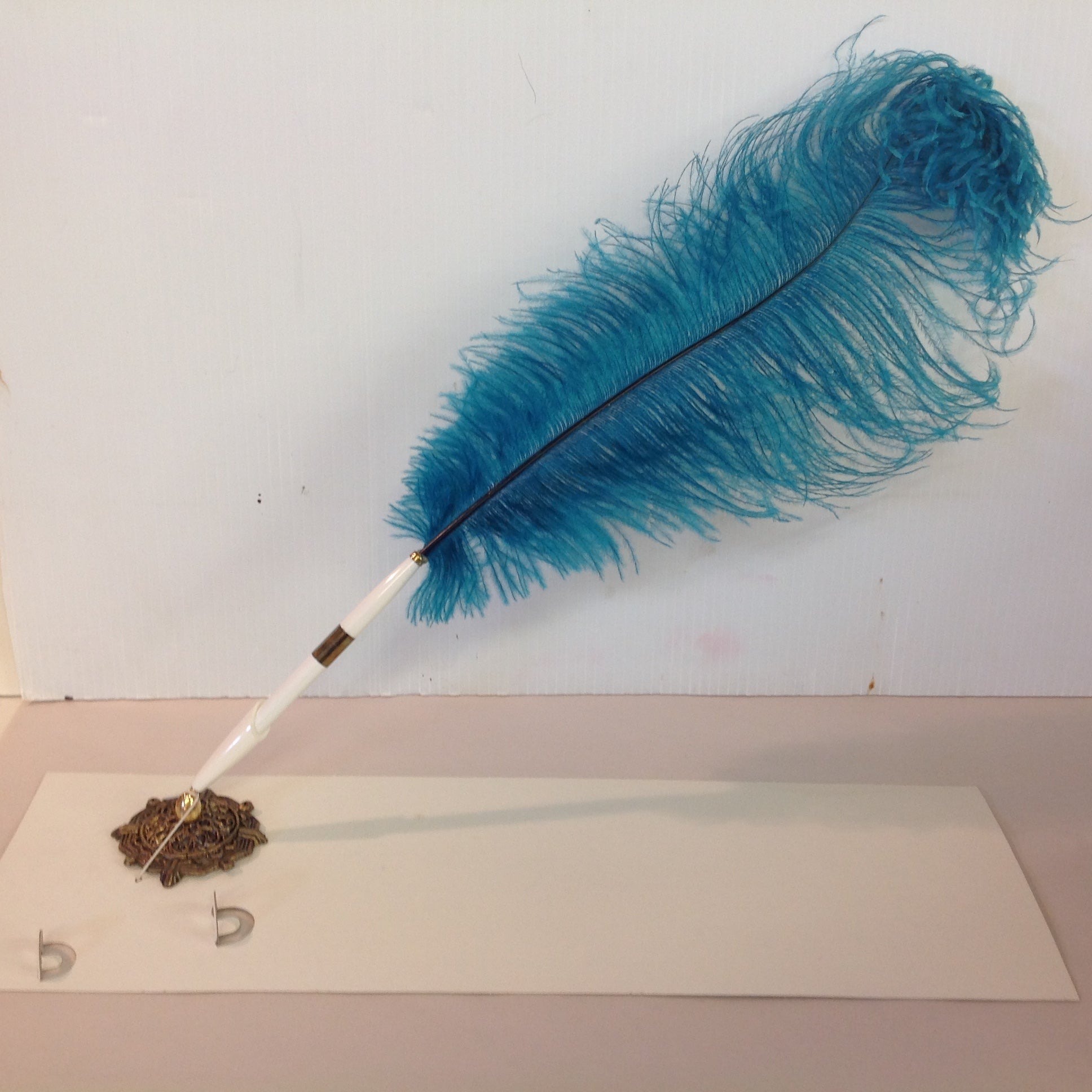 Vintage Aqua Blue Feather Quill Pen Set with Octagonal Brass Filigree Base in Box
