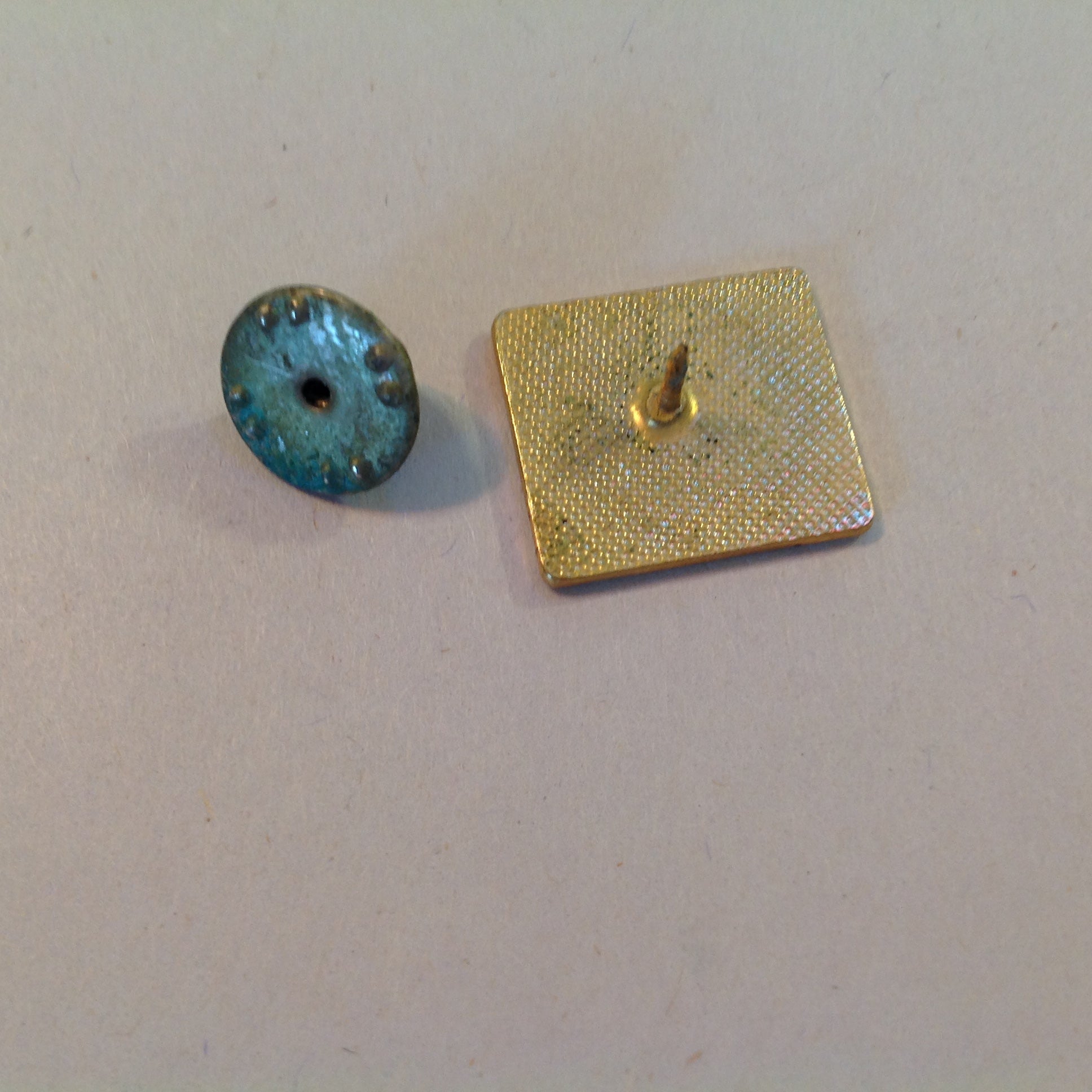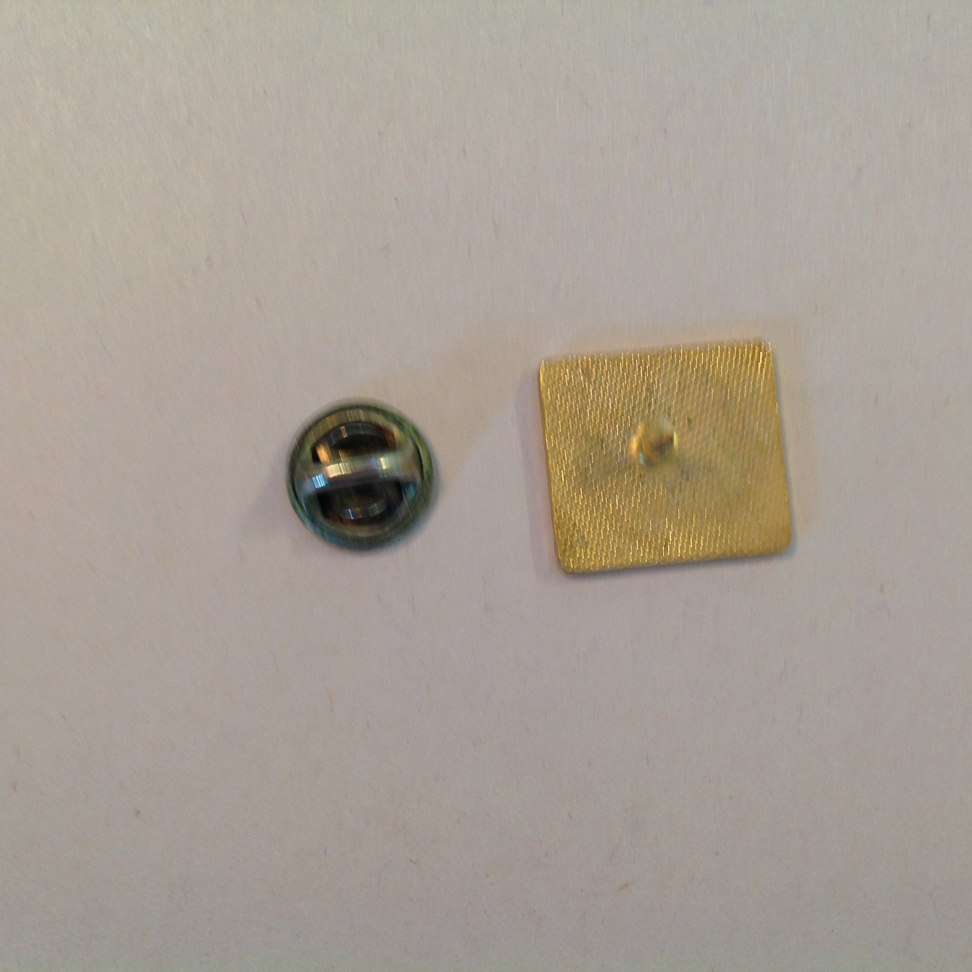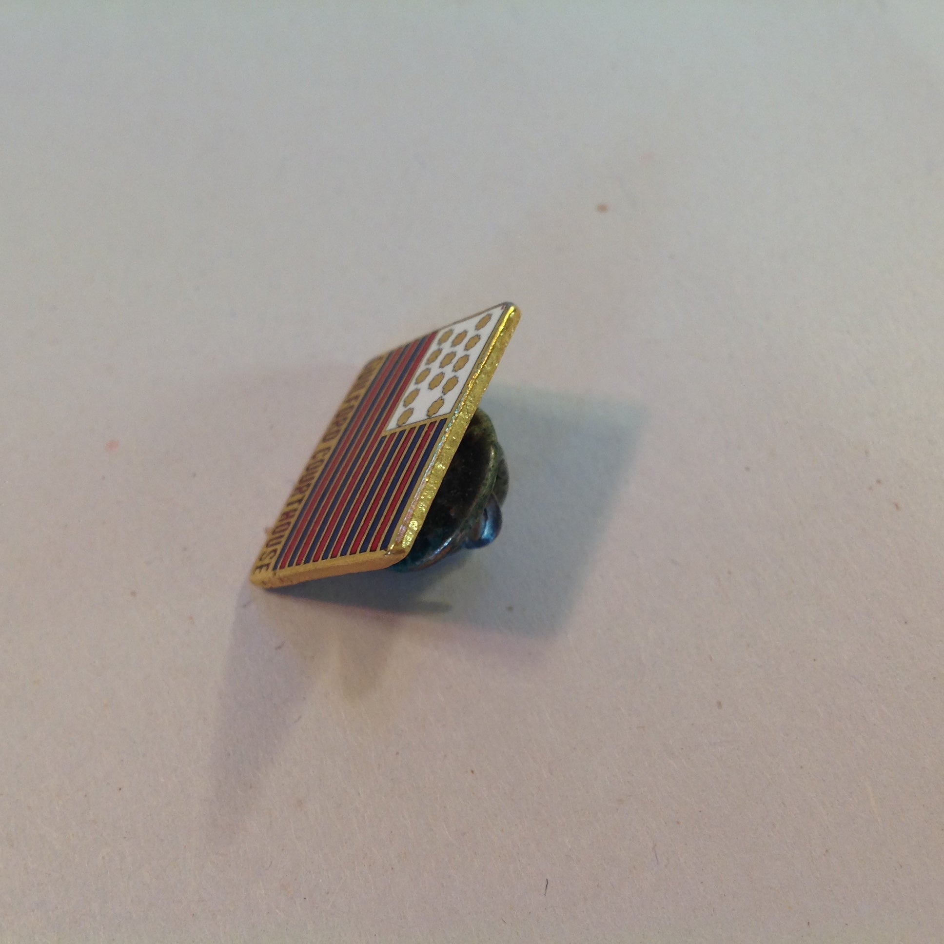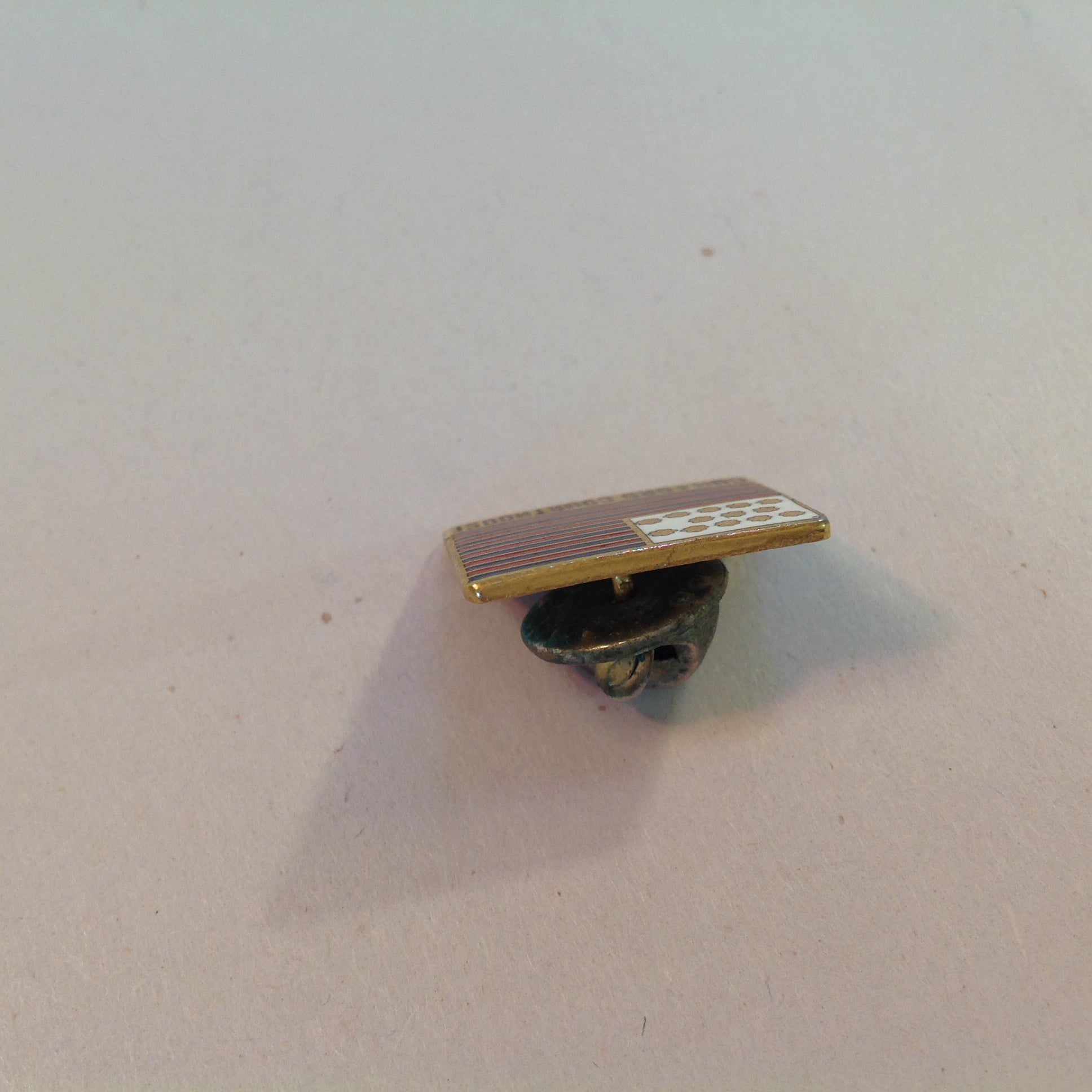 This is a vintage used item, in good used condition, with light signs of age/wear; there is mild rubbing to surface of metal/enamel, light wear along/about pin and squeeze cap closure. Overall quality is good; clean, smooth/glossy, with excellent preservation of color/sheen and graphics still bold/vivid. There are no excessive nicks, chips, dents, divots, scrapes, scratches, scuffs, cracks, breaks, stains, residue or repairs. The pin measures approx .75" x .5".