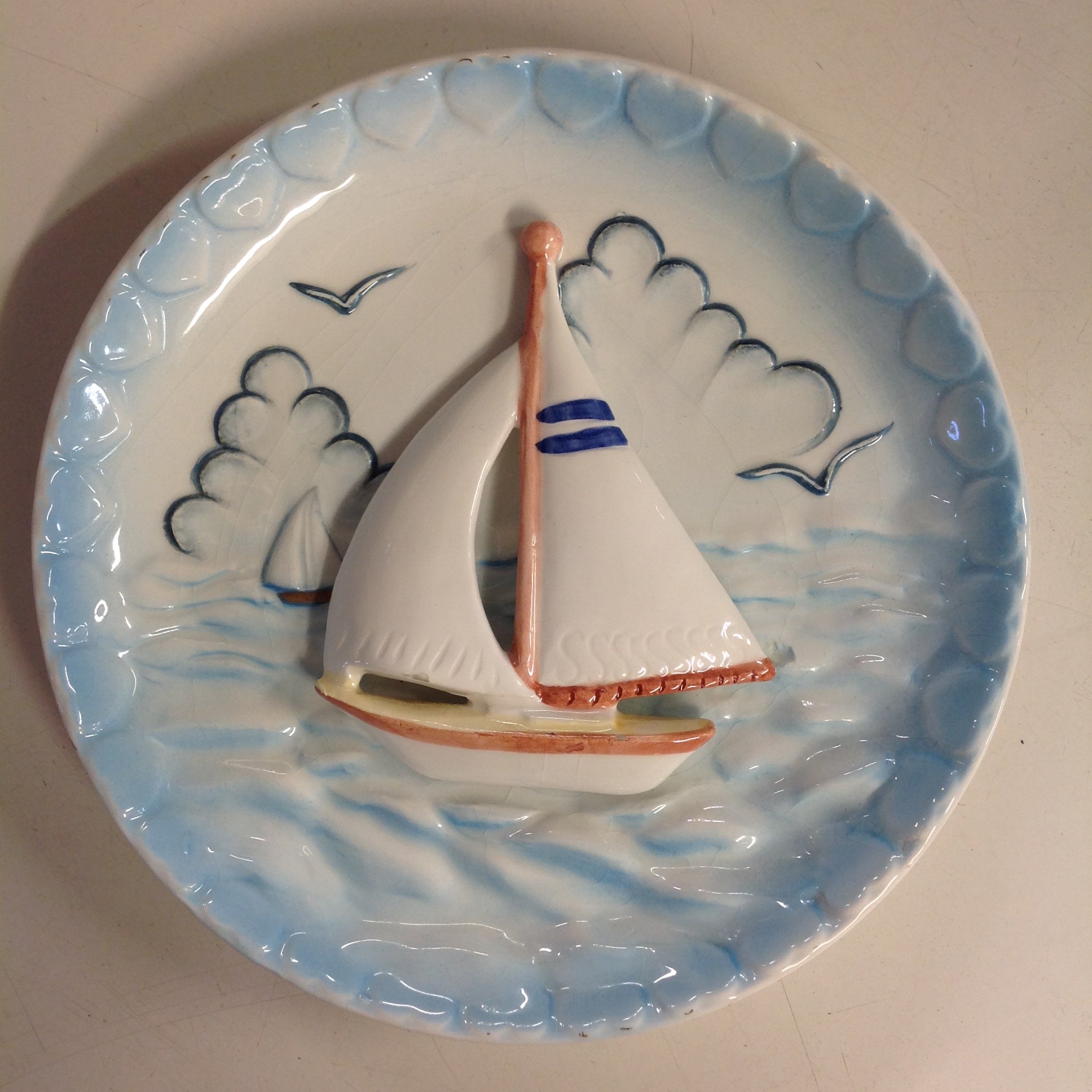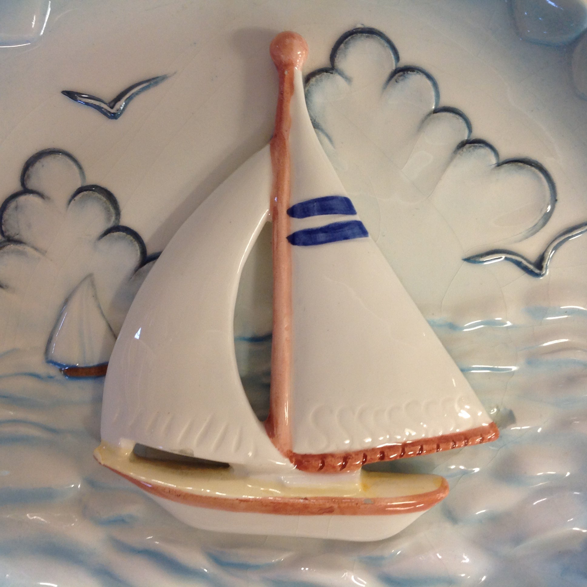 Here is a whimsical ceramic plate featuring a simple sailboat on an ocean of sculpted light blue and white waves, with painted clouds and seagulls. This is a vintage used item in good used condition, with light crazing, but no excessive chips, cracks, nicks, breaks, stains or repairs; plate retains sheen, and colors are still bright and airy. The plate measures approx 8" round.