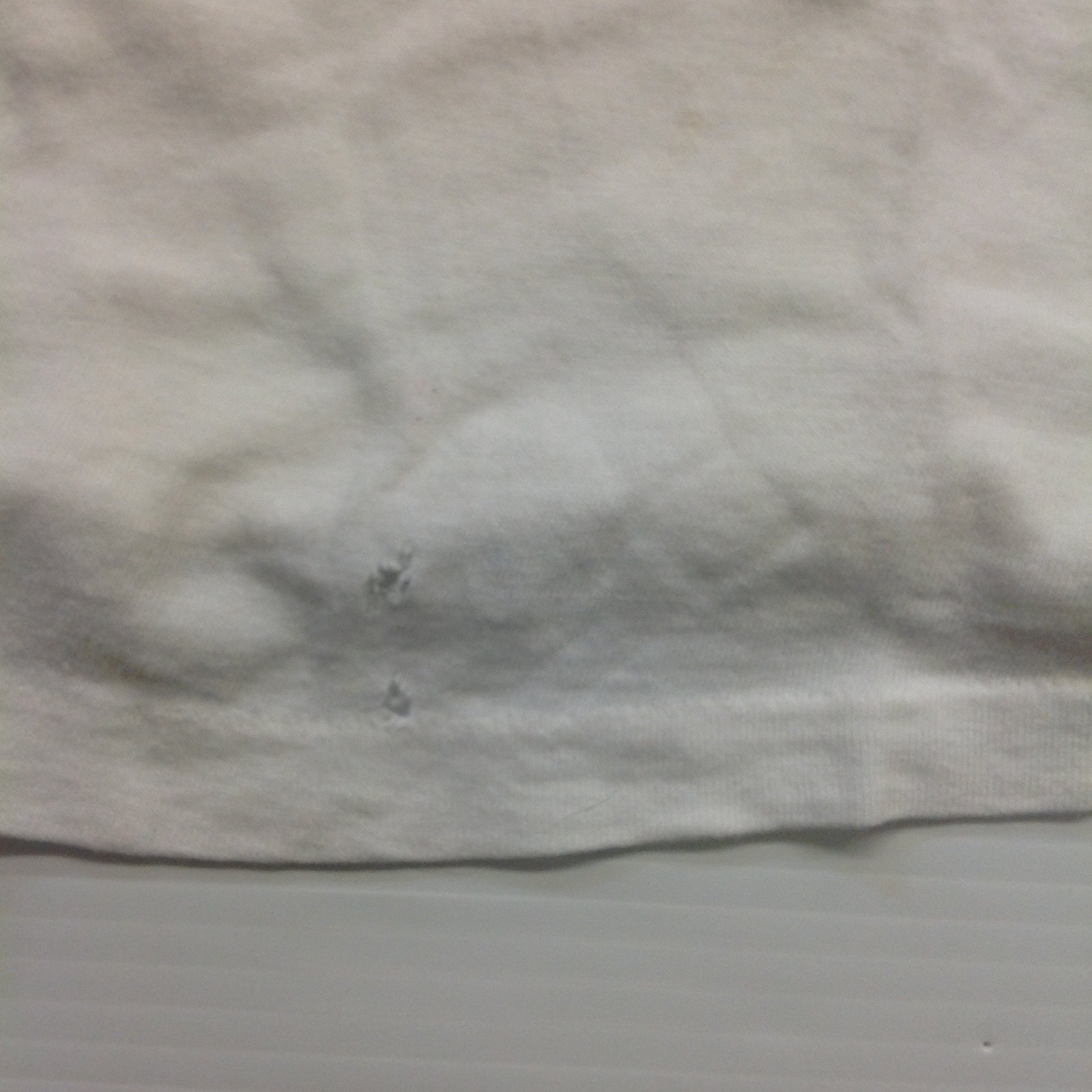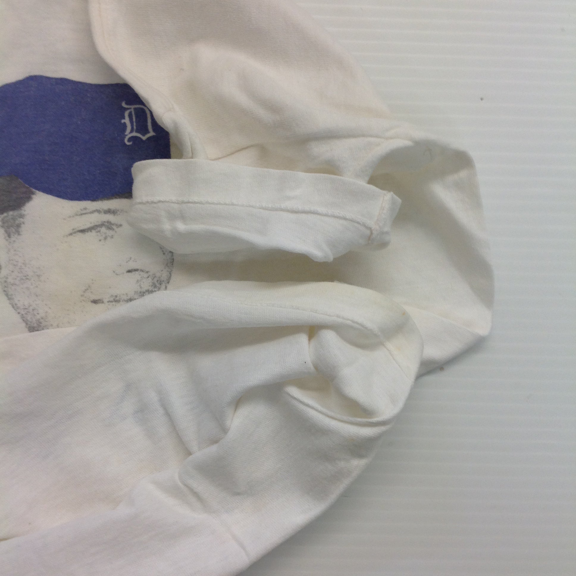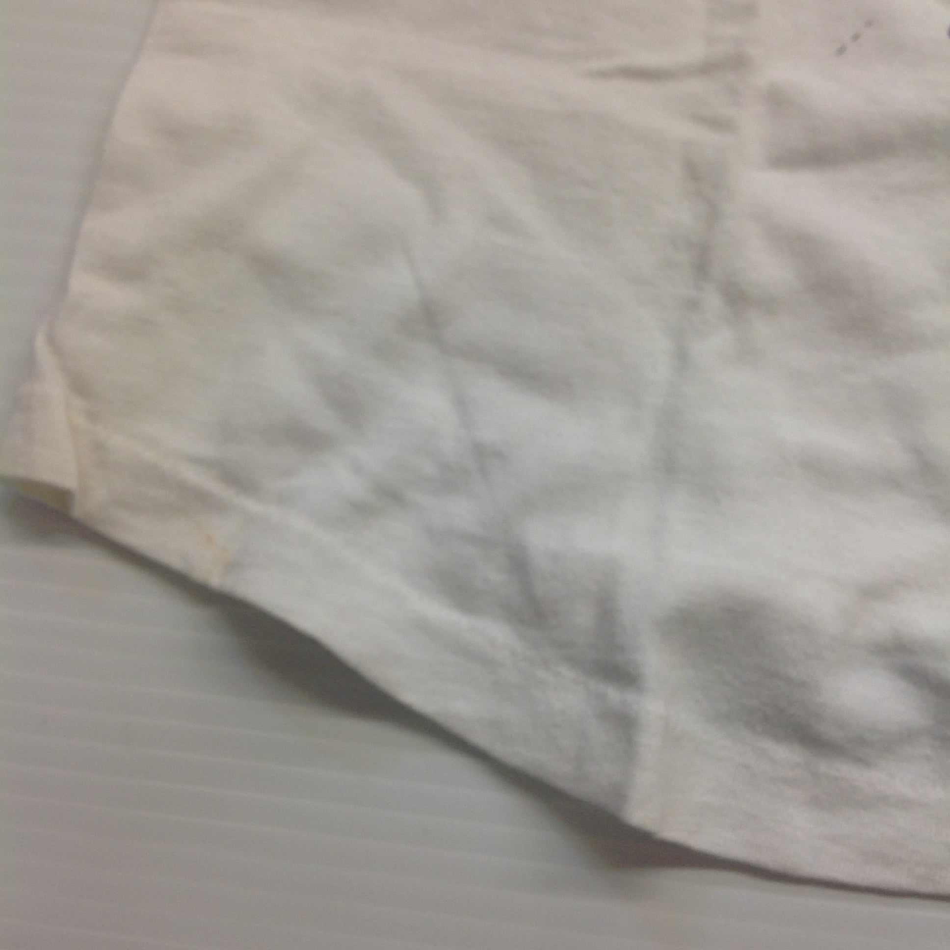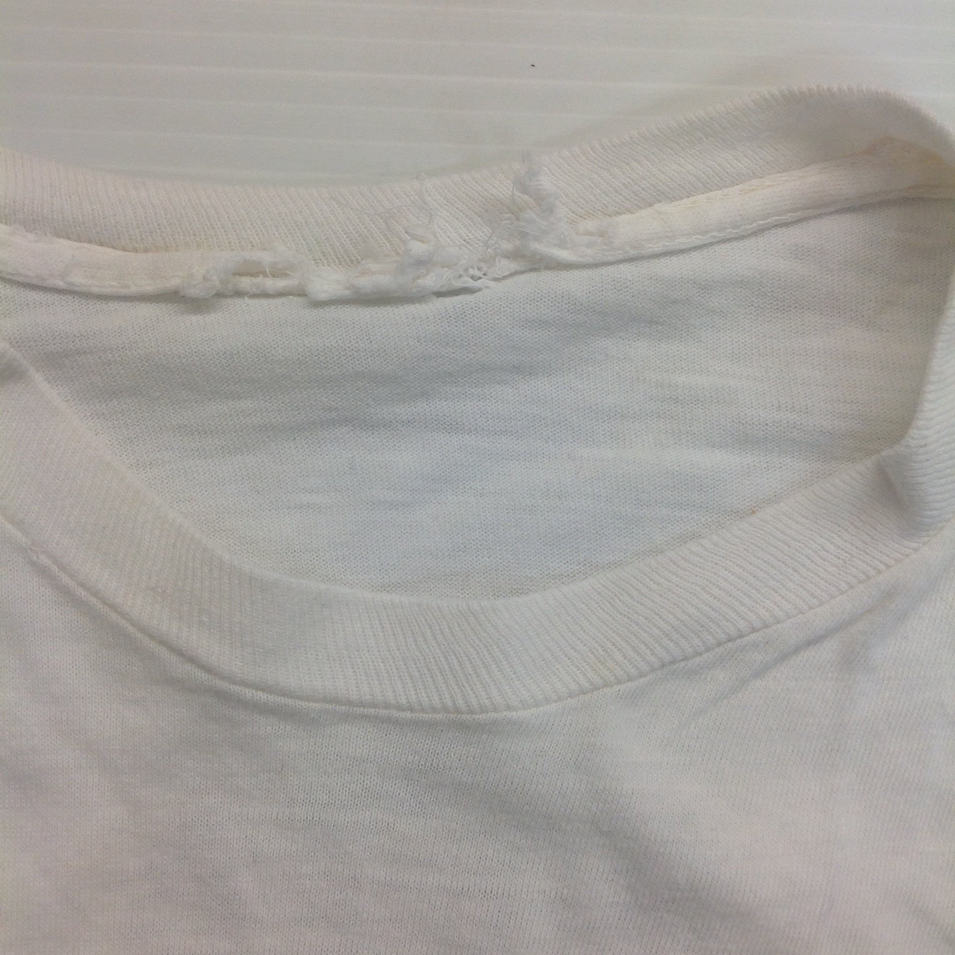 This is a vintage used item, in good used condition, with some signs of age/wear; there is light rubbing to surface of fabric (appears to be cotton/polycotton), small pattern of holes at front base, minor dotting at front below graphics, light fading to whites, manufacturer tag has been removed with distress/hole at collar rear. Overall fabric quality is good; soft/supple, clean/smooth, with good preservation of color/sheen and graphics still sharp/clear. There are no excessive nicks, rips, tears, perforations, stains, residue or repairs. Overall shirt measurements are approx: Shoulder-to-Shoulder: 14" Shoulder-to-Sleeve: 4" Chest: 28" Overall length: 18".