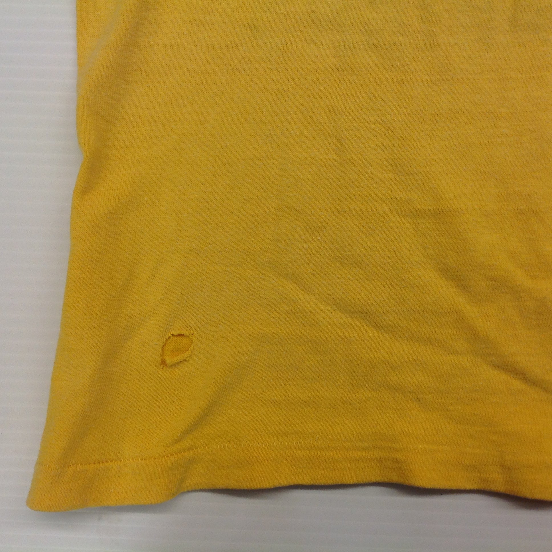 This is a vintage used item, in good used condition, with light signs of age/wear; there is mild rubbing to surface of fabric, minor points of stain below graphics, hole at rear hem left. Overall fabric quality is good; clean/smooth, soft/supple, with good preservation of color/sheen and graphics still bold/clear. There are no excessive nicks, rips, tears, perforations, stains, residue or repairs. The shirt is labeled as a M(edium), with manufacturer tag blank/worn. Overall shirt measurements are approx: Shoulder-to-Shoulder: 12" Shoulder-to-Sleeve: 6", Chest: 24" Overall length: 19".