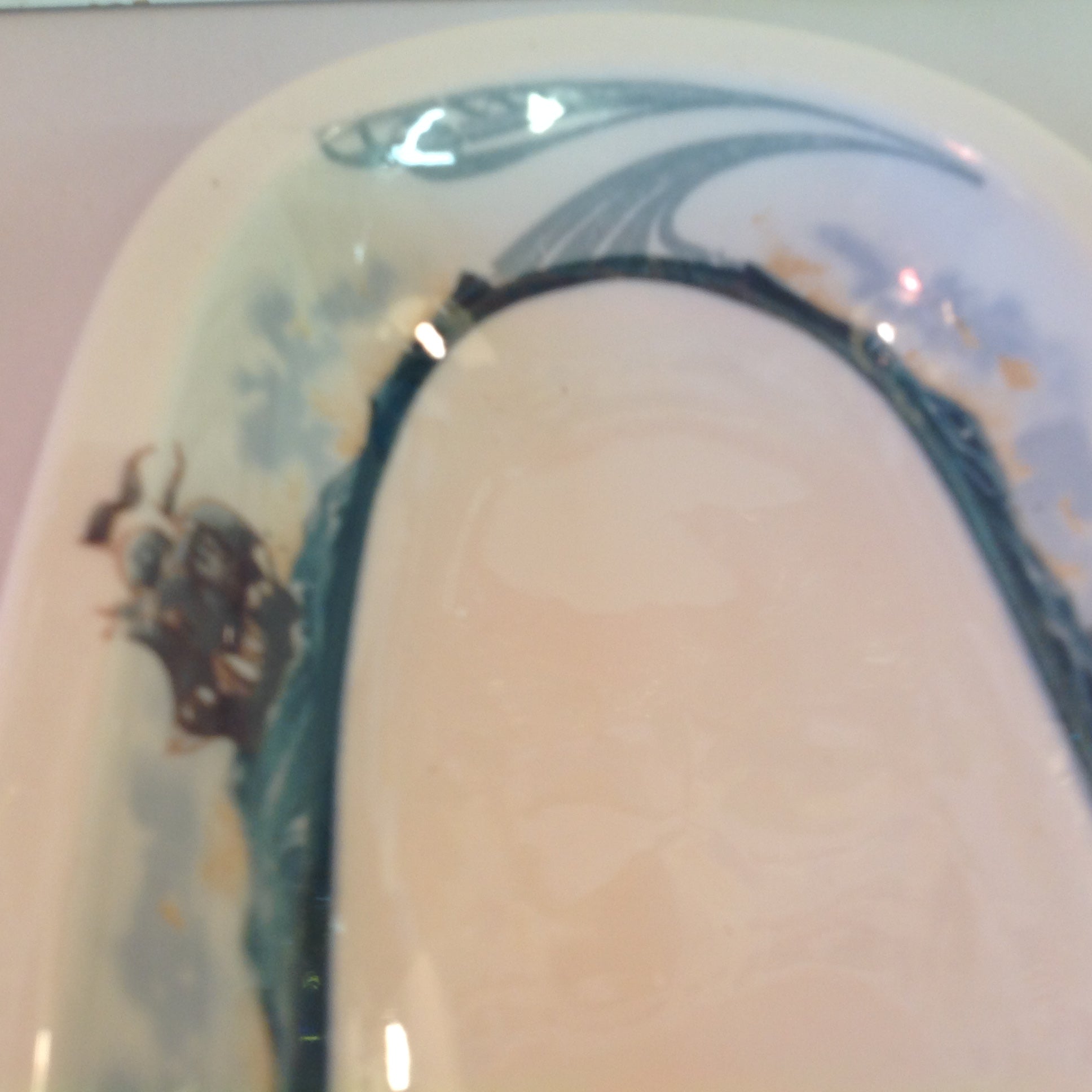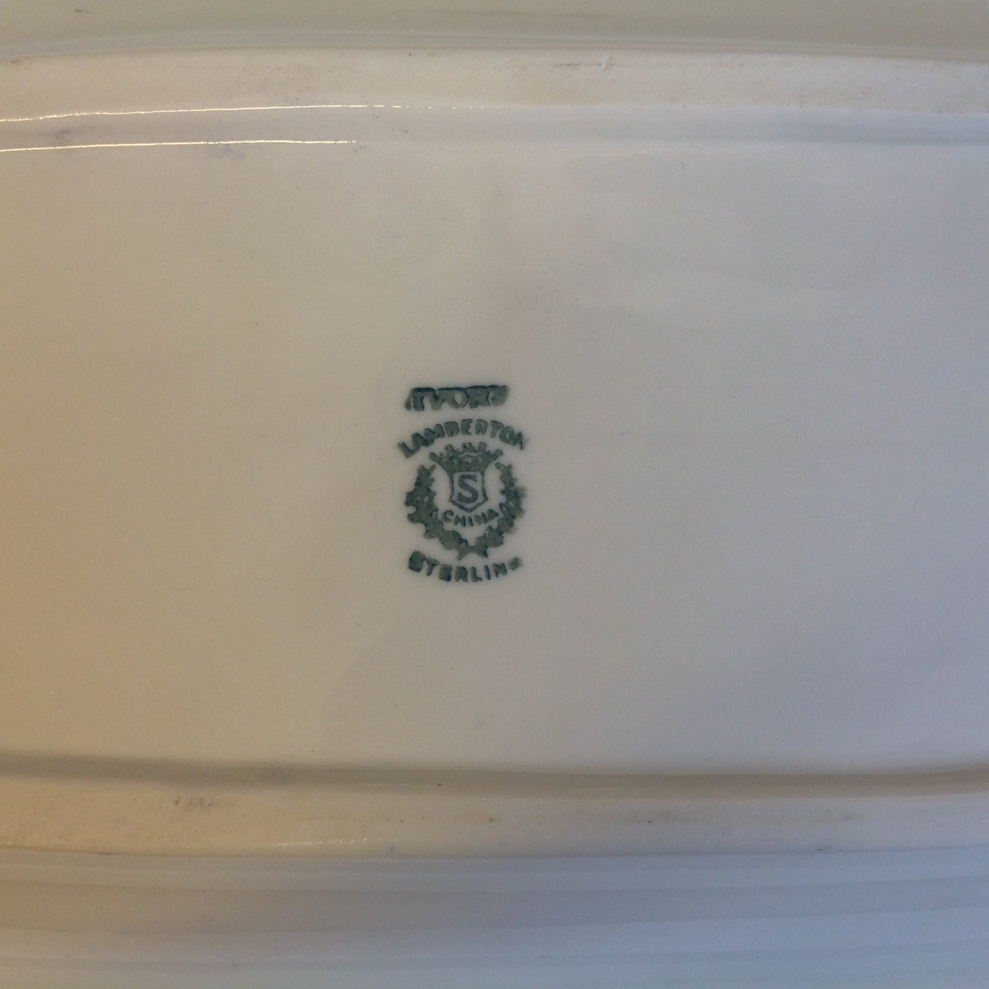 This is a vintage used item, in good used condition, with light signs of age/wear; there is mild rubbing to surface of porcelain, light wear along/about base and rim. Overall quality is good; smooth/glossy, with excellent preservation of color/sheen and graphics still sharp/bright. There are no excessive nicks, chips, dents, divots, scrapes, scratches, scuffs, cracks, breaks, stains, residue or repairs. The celery dish is stamped "Ivory Lamberton China Sterling" and measures approx 12" x 6" with a 1.5" lift and was part of the restaurant dishware at the historic Detroit Yacht Club.
