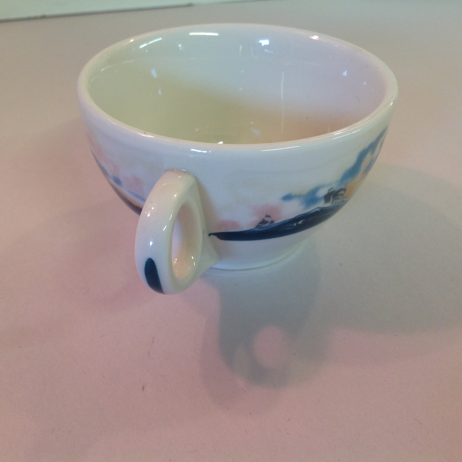 This is a vintage used item, in good used condition, with light signs of age/wear; there is mild rubbing to surface of porcelain, light wear along/about base and rim. Overall quality is good; smooth/glossy, with excellent preservation of color/sheen and graphics still sharp/bright. There are no excessive nicks, chips, dents, divots, scrapes, scratches, scuffs, cracks, breaks, stains, residue or repairs. The cup measures approx 2.5" x 4.5" (to handle) with a 3.75" wide mouth and 2" round base, and is stamped "Jackson China Falls Creek PA" and was part of the restaurant dishware at the historic Detroit Yacht Club.