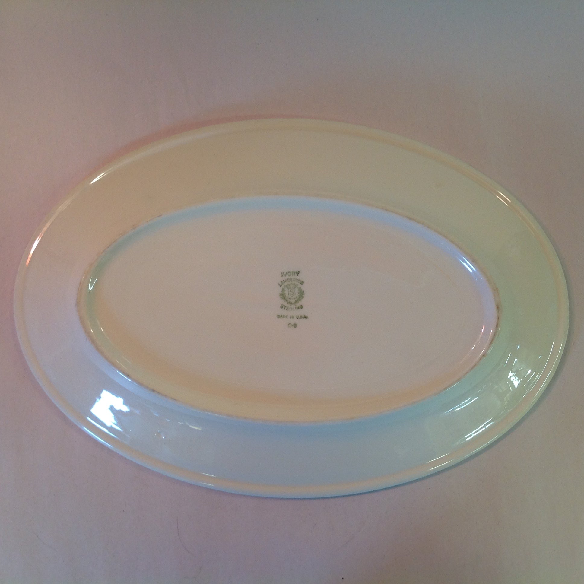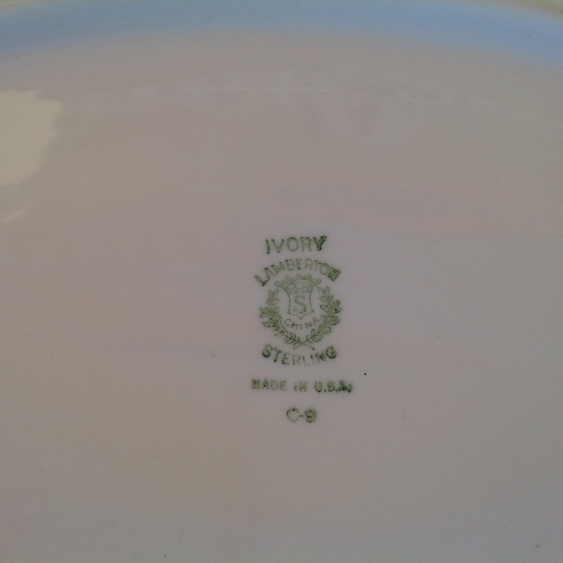 This is a vintage used item, in good used condition, with light signs of age/wear; there is mild rubbing to surface of porcelain, light wear along/about base and rim. Overall quality is good; smooth/glossy, with excellent preservation of color/sheen and graphics still sharp/bright. There are no excessive nicks, chips, dents, divots, scrapes, scratches, scuffs, cracks, breaks, stains, residue or repairs. The dinner plate is stamped "Ivory Lamberton China Sterling" and measures approx 12.756" x 8.75" with a 1.5" lift and was part of the restaurant dishware at the historic Detroit Yacht Club.