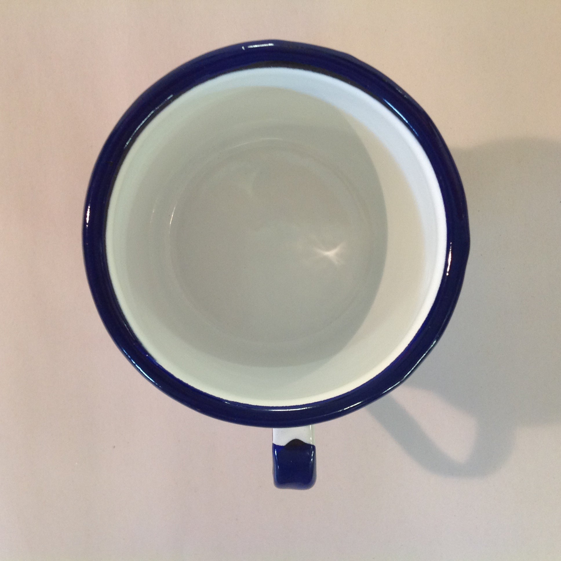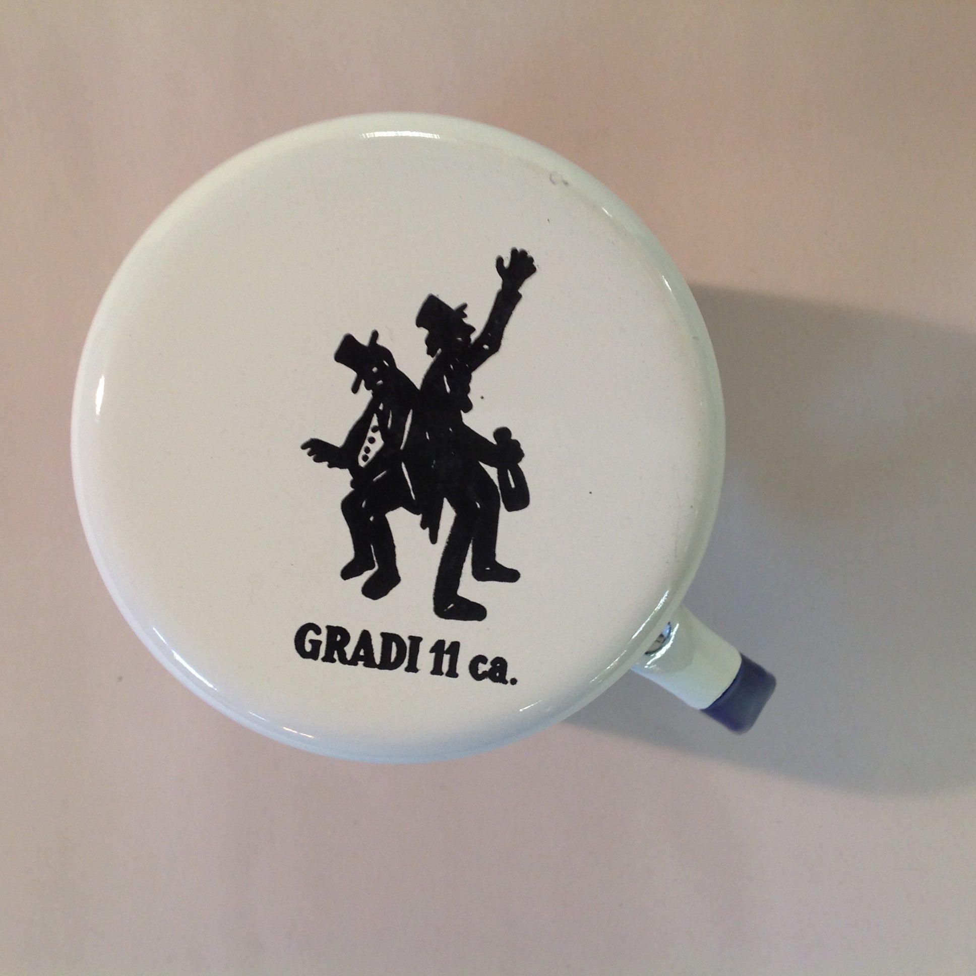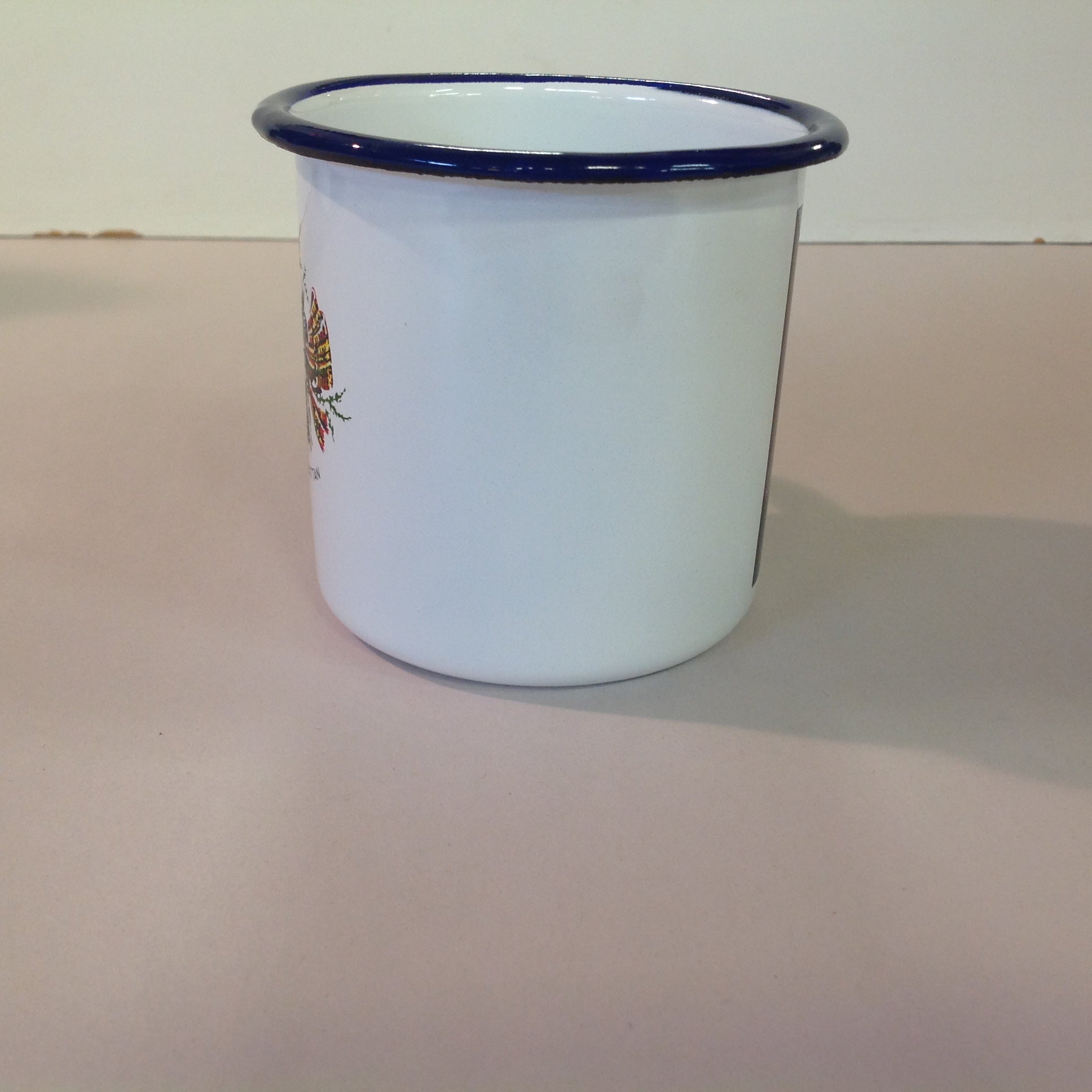 This is a vintage used item, in good used condition, with light signs of age/wear; there is faint rubbing/scuffing to surface of mug, light wear to base along/about handle. Overall enamelware quality is good; smooth/glossy, with excellent preservation of color/sheen and graphics still sharp/bright. There are no excessive nicks, chips, dents, divots, scrapes, scratches, scuffs, cracks, breaks, stains, residue or repairs. The mug measures approx 3.5" tall, 4.5" wide (to handle), with a 3" wide mouth and base,