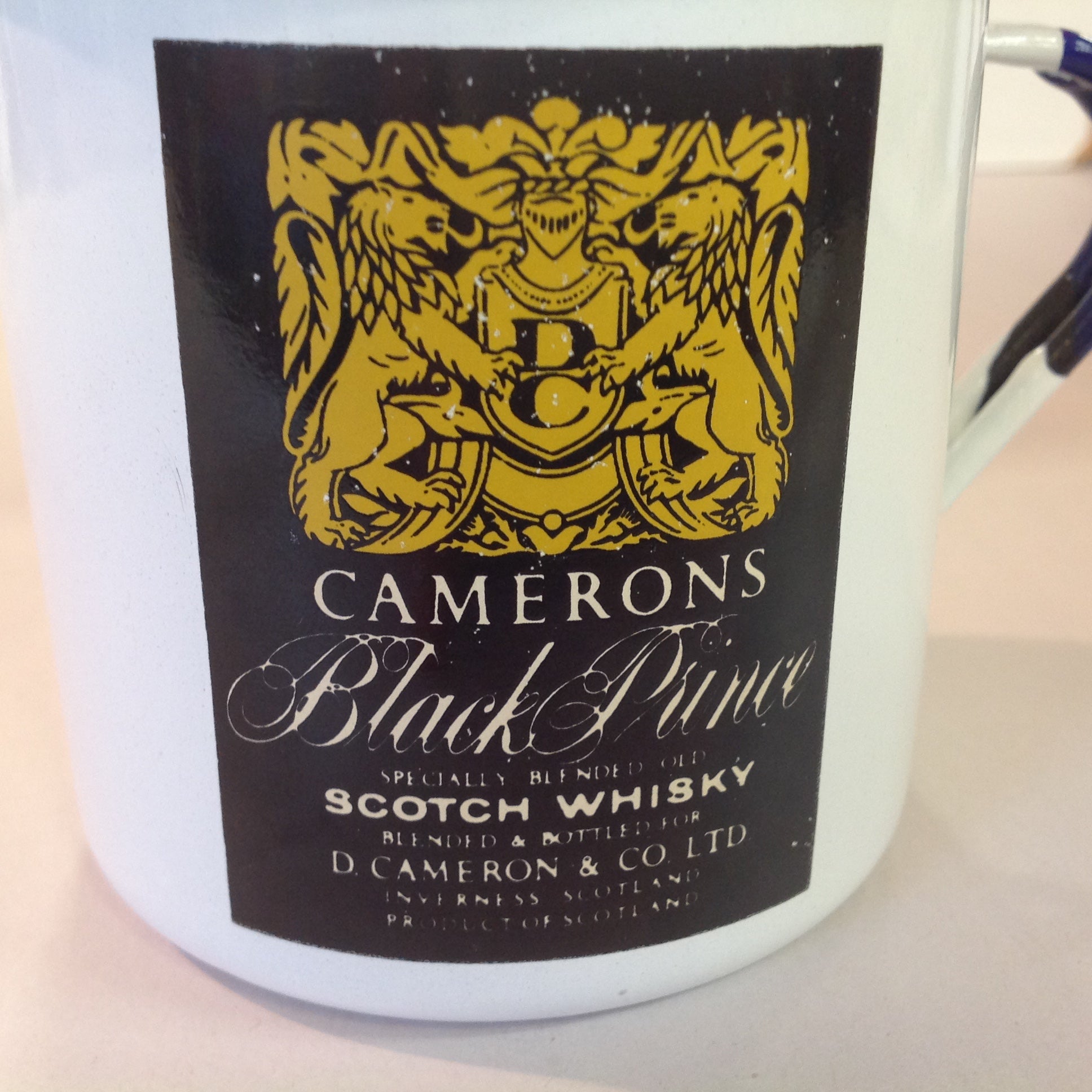 Vintage Gradi 11 ca Enamelware Whiskey Mug Scottish Clan Chattan Cameron's Black Prince Scotch Whisky