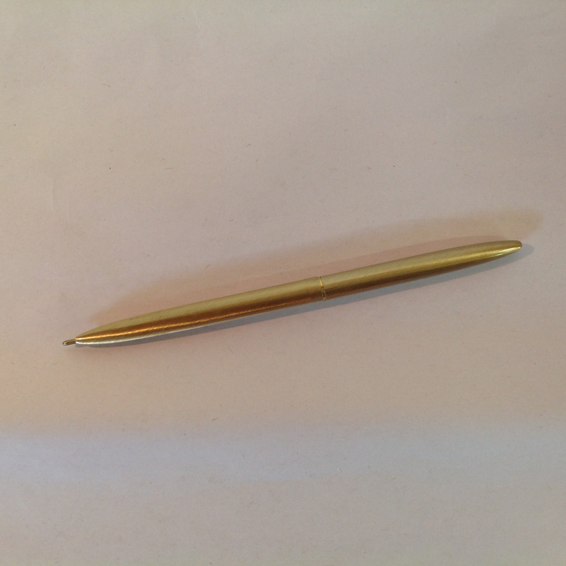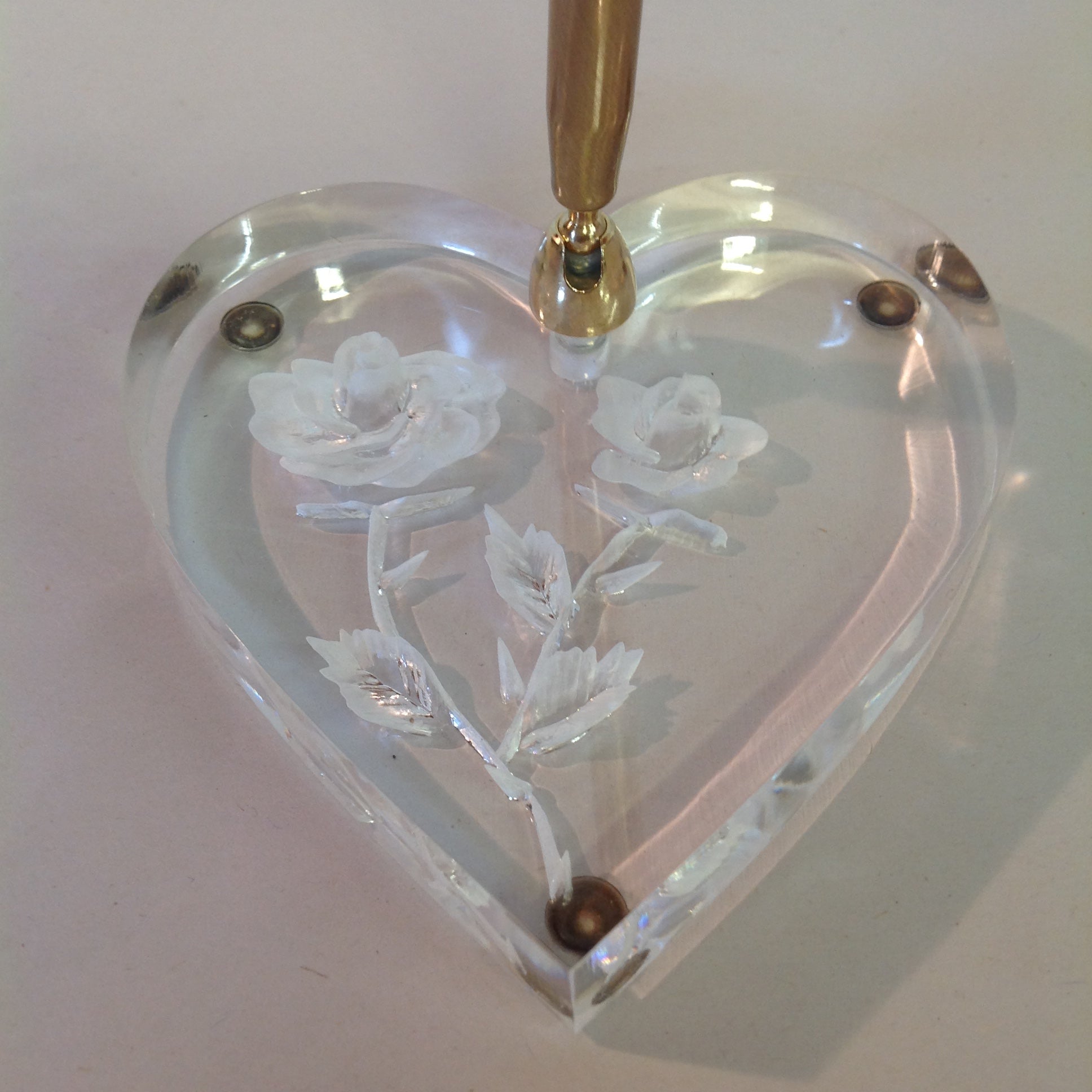 This is a vintage used item, in good used condition, with light signs of age/wear; pen and base are still in their original packaging, which has been opened and shows light wear; there is minor rubbing to surface of lucite base, minor wear to brass sleeve of pen. Overall quality is good; smooth/glossy, with excellent retention of sheen and sculptural embedded rose figurals remain sharp/clear. There are no excessive nicks, chips, dents, divots, scrapes, scratches, scuffs, cracks, breaks, stains, residue or repairs. The heart-shaped base measures approx 4" x 4", while accompanying pen measures 6" long.