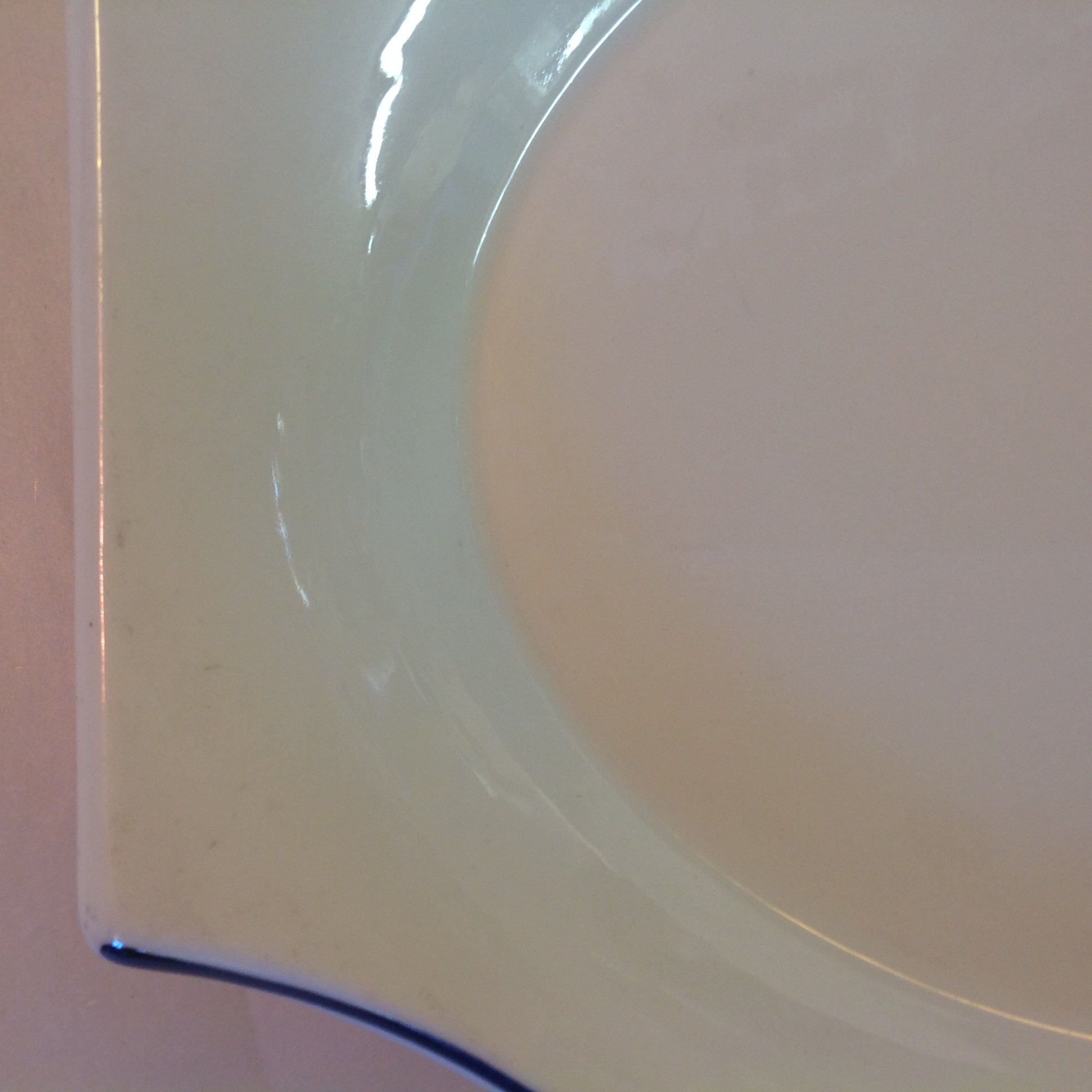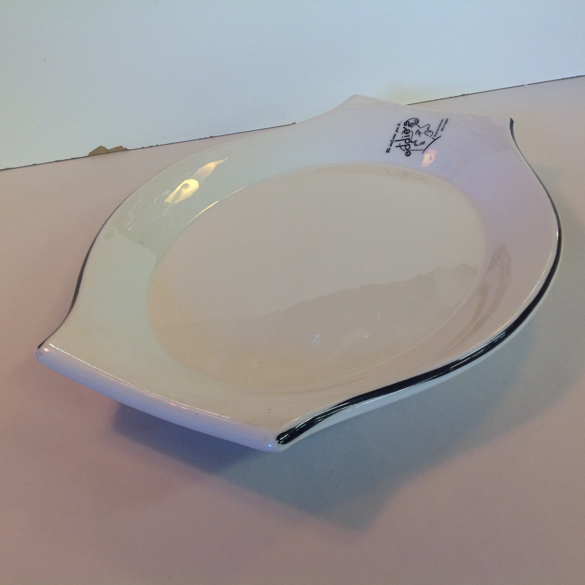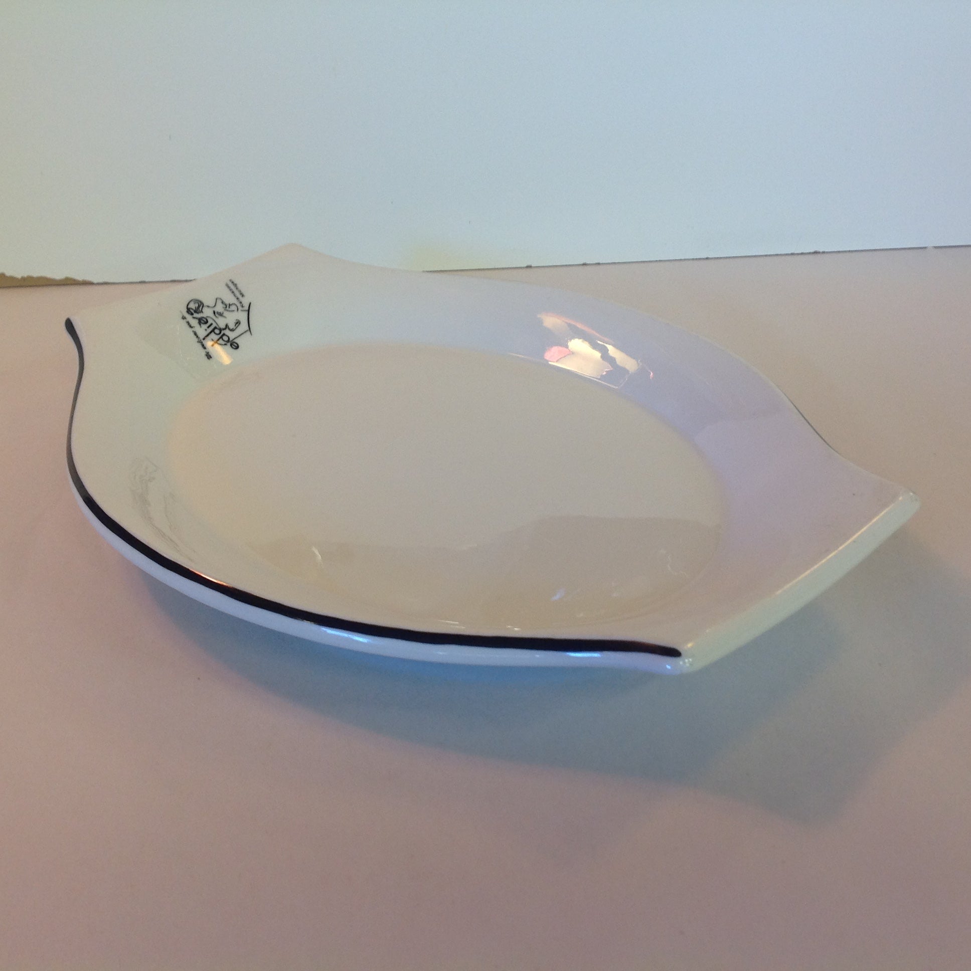 This is a vintage used item, in good used condition, with light signs of age/wear; there is mild rubbing to surface of porcelain, light wear along/about base, minuscule points of blemish from use. Overall quality is good; clean, smooth/glossy, with excellent preservation of color/sheen and graphics still sharp/vivid. There are no excessive nicks, chips, dents, divots, scrapes, scratches, scuffs, cracks, breaks, stains, residue or repairs. The platter measures approx 12.75" x 9.5", with approx depth 1.5" and base 9.25" x 6.75".