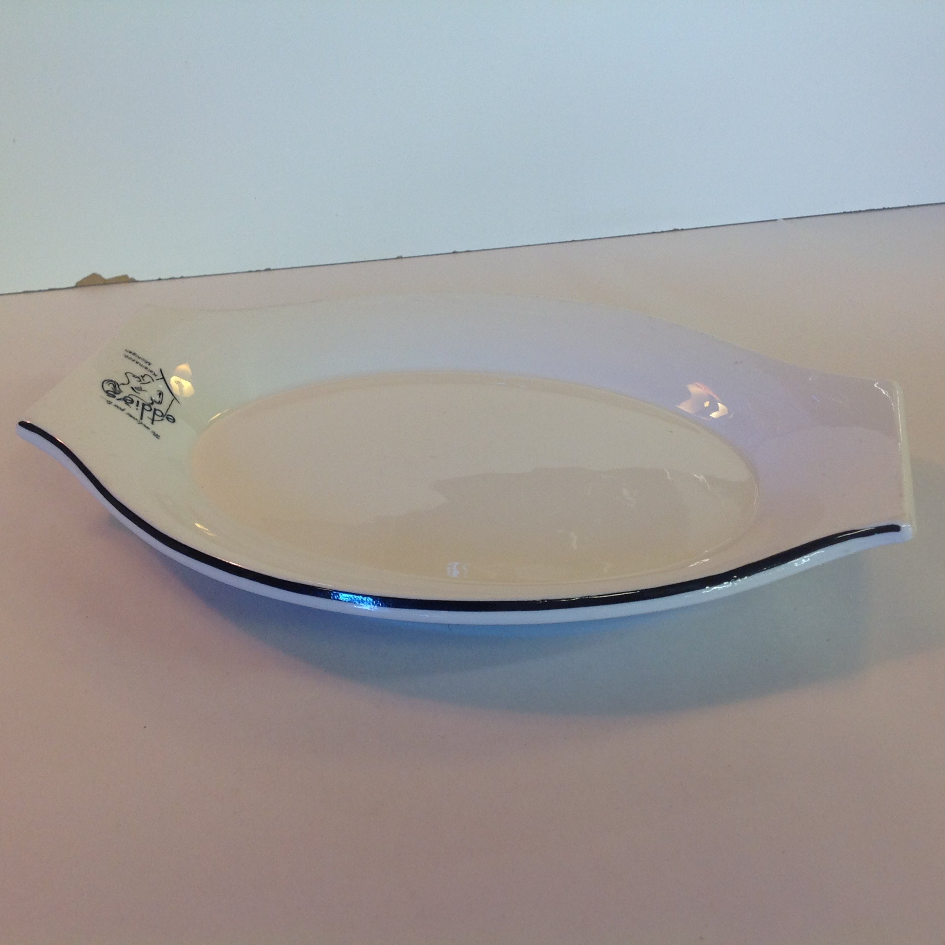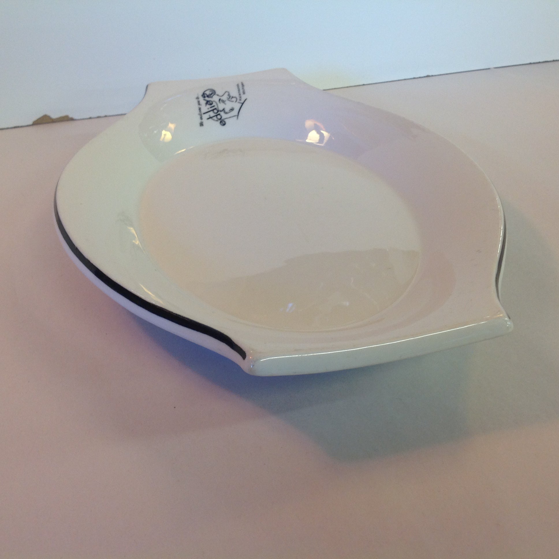 This is a vintage used item, in good used condition, with light signs of age/wear; there is mild rubbing to surface of porcelain, light wear along/about base, minuscule points of blemish at edges from use. Overall porcelain quality is good; clean, smooth/glossy, with excellent preservation of color/sheen and graphics still sharp/vivid. There are no excessive nicks, chips, dents, divots, scrapes, scratches, scuffs, cracks, breaks, stains, residue or repairs. The platter measures approx 11.75" x 8.5", with depth approx 1.25" and base 8.25" x 5.25".