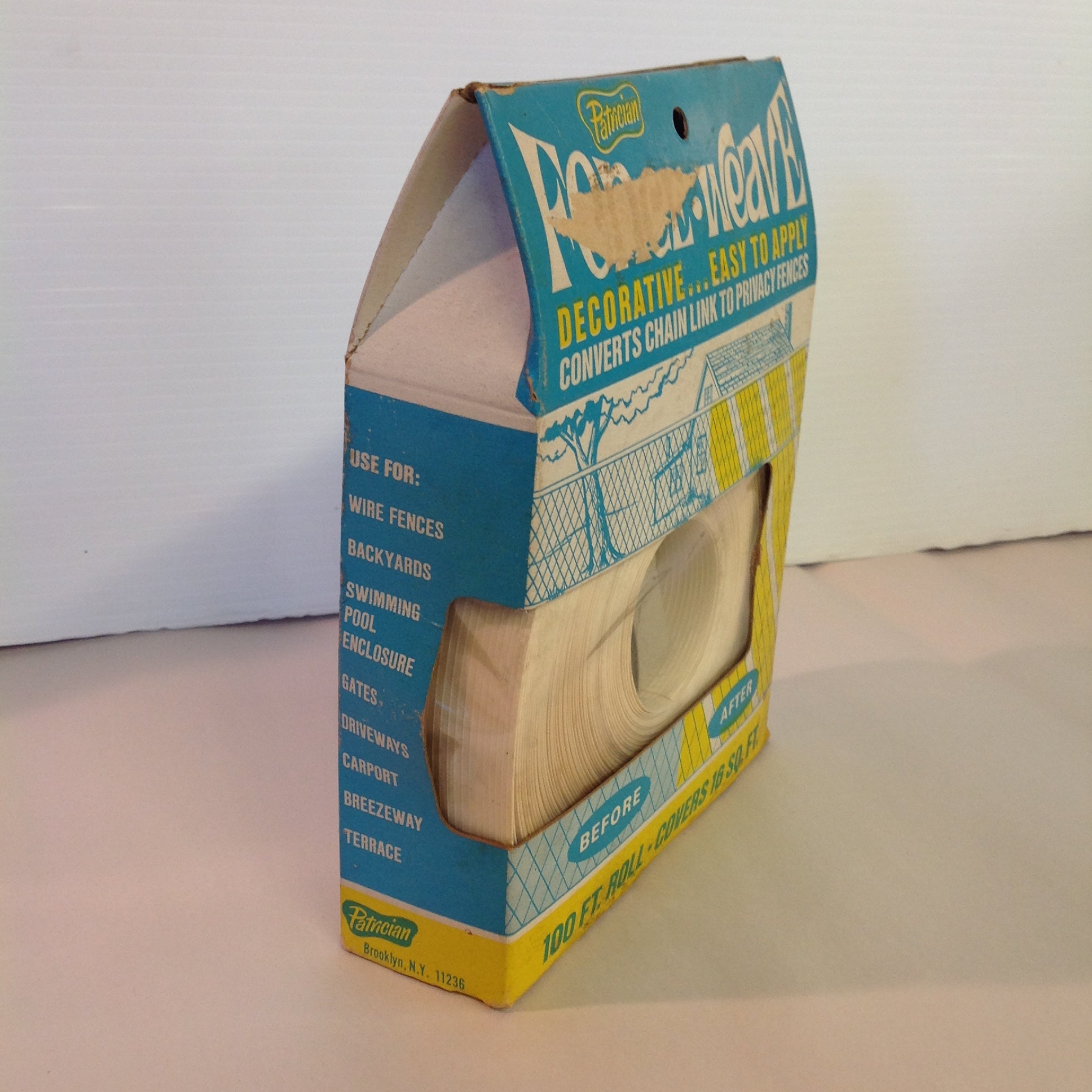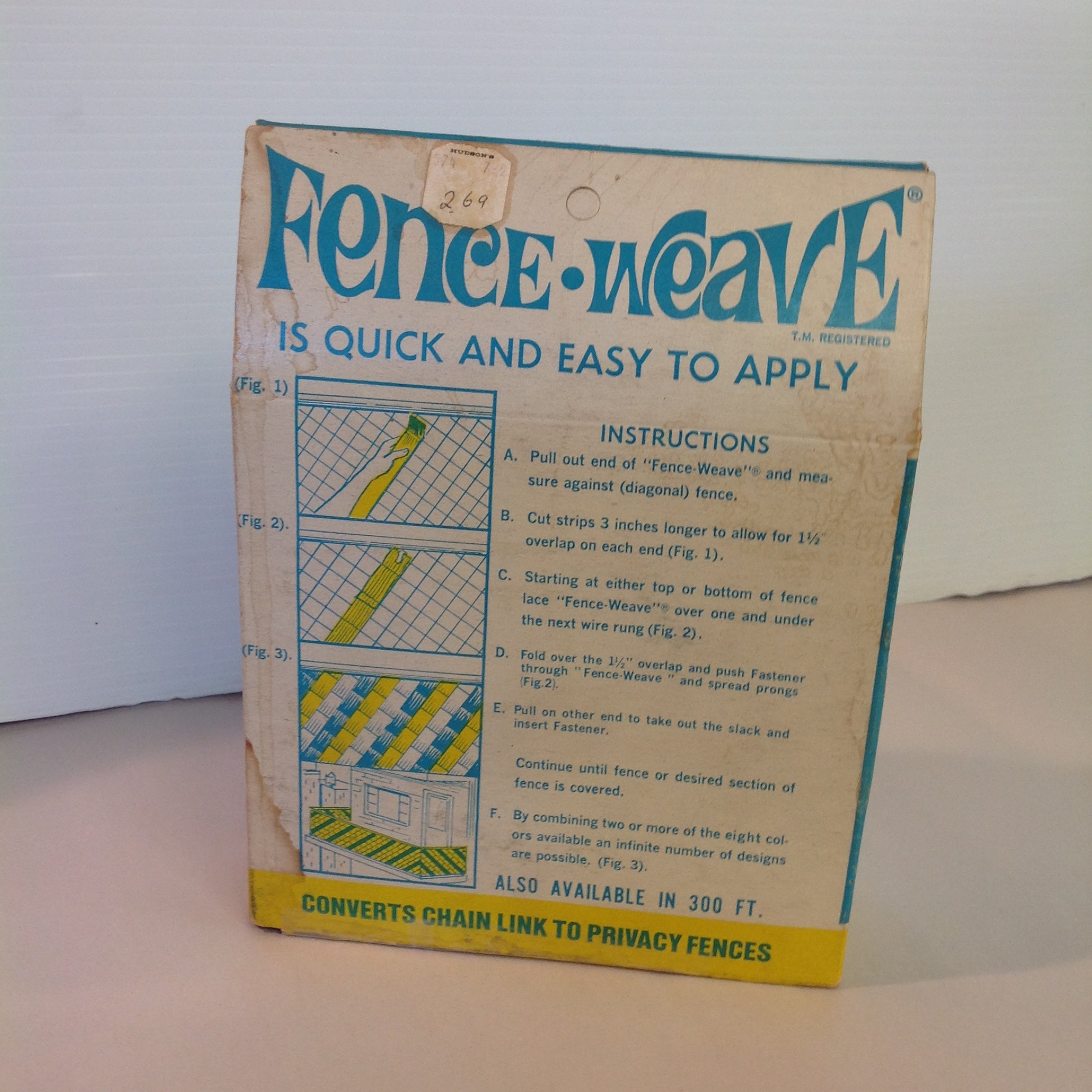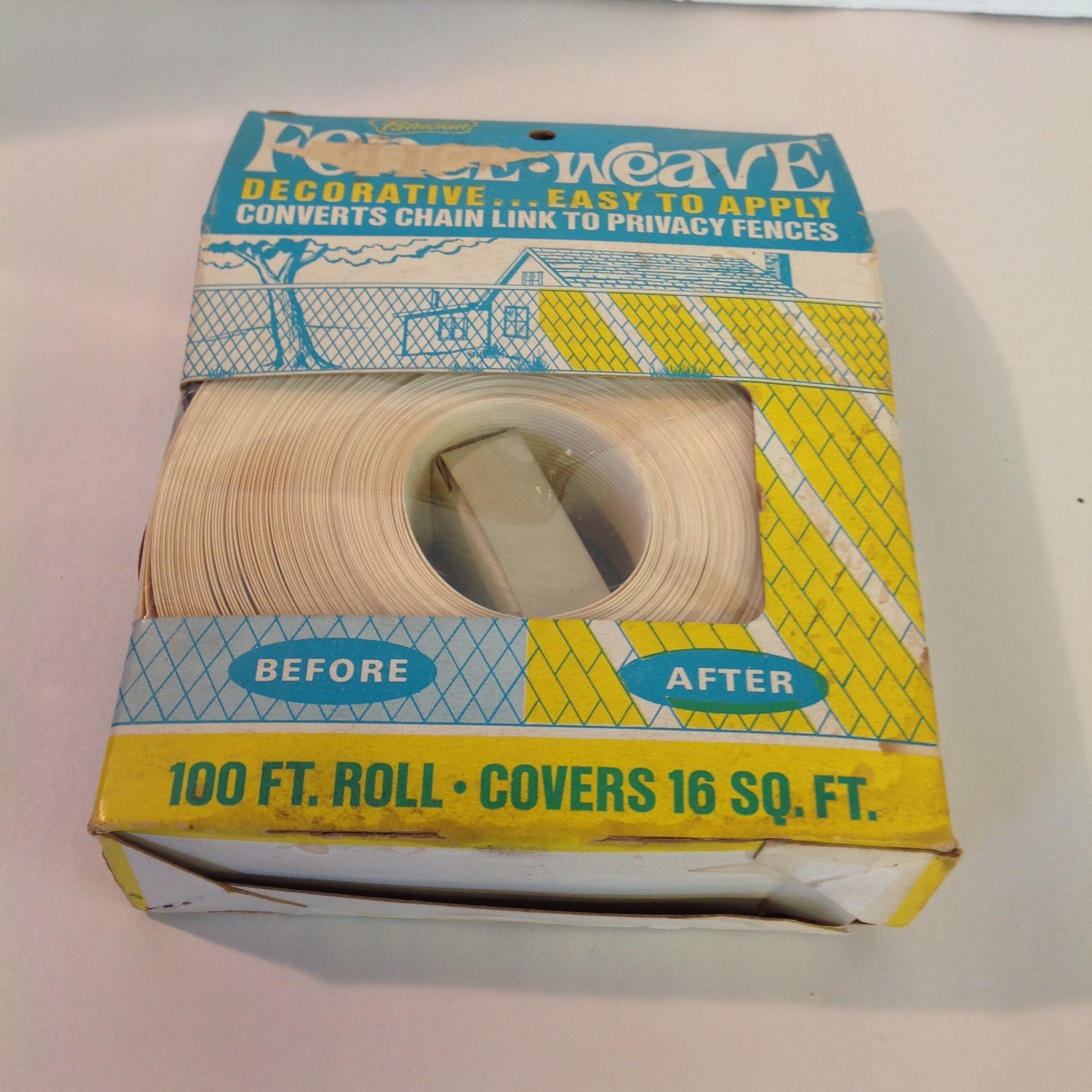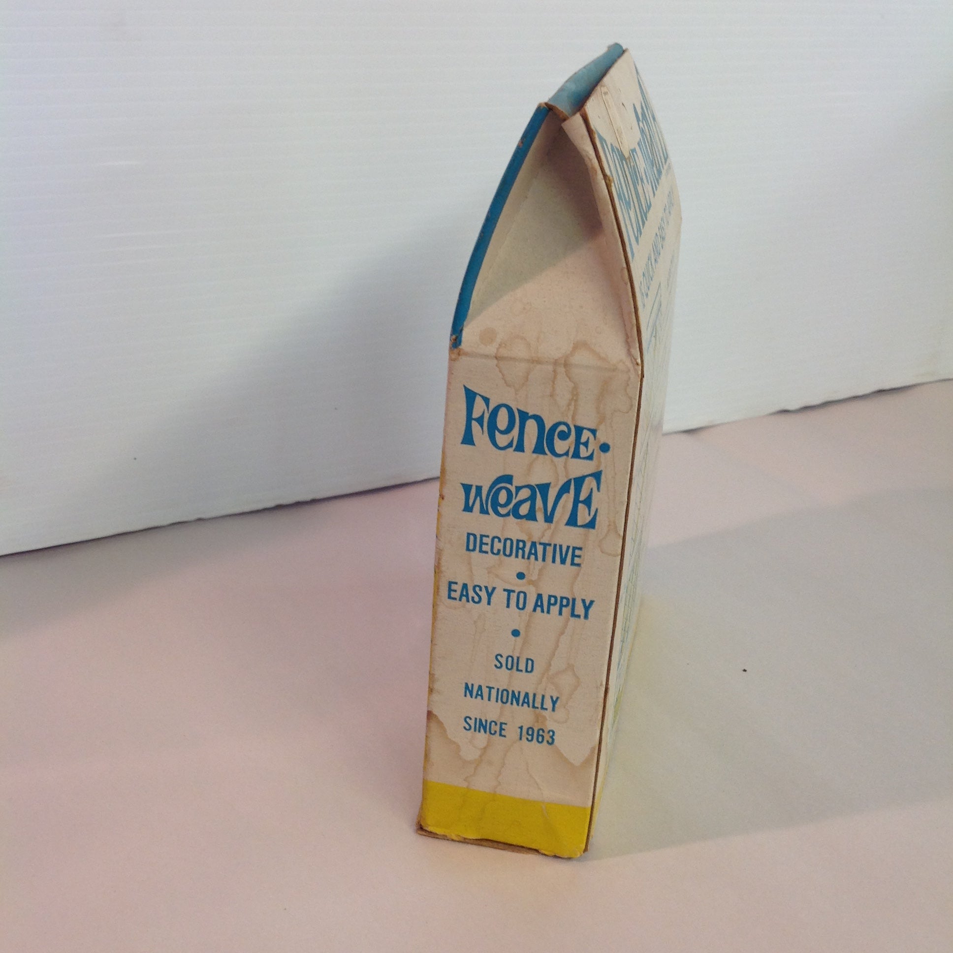 This is a vintage N(ew) O(ld) S(tock) item, in good used condition, with some signs of age/wear; Fence-Weave is still in its original packaging, which has not been opened and shows heavy rubbing/scuffing, edgewear and associated corner wear, numerous blemishes/discoloration, various points of distress, and wear to cellophane liner. Interior Fence-Weave condition appears good, smooth/clean, light/supple, with little evident wear. There are no excessive nicks, chips, rips, tears, perforations, cracks, breaks, stains, residue or repairs. The Fence-Weave is tagged as 100 foot roll, covering 16 square feet, and is made in the USA. Fence-Weave in box measures approx 8.5" x 2" x 6.5".