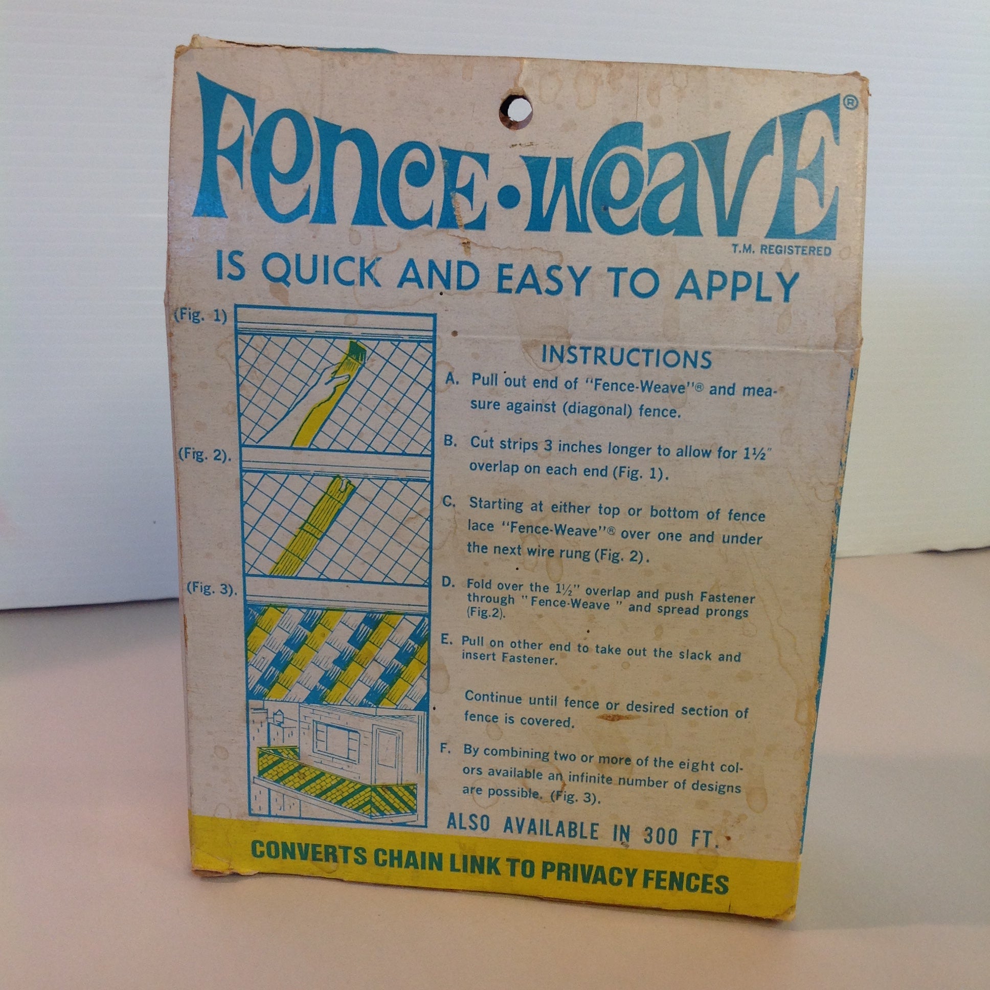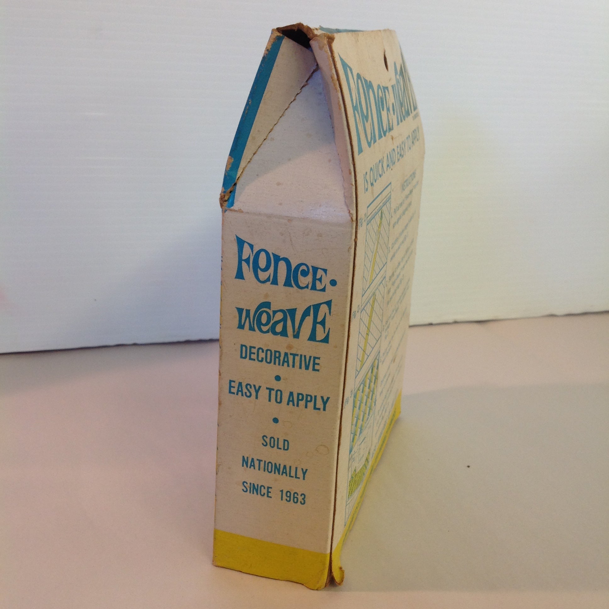 This is a vintage N(ew) O(ld) S(tock) item, in good used condition, with some signs of age/wear; Fence-Weave is still in its original packaging, which has not been opened and shows heavy rubbing/scuffing, edgewear and associated corner wear, numerous blemishes/discoloration, various points of distress, and wear to cellophane liner. Interior Fence-Weave condition appears good, smooth/clean, light/supple, with little evident wear. There are no excessive nicks, chips, rips, tears, perforations, cracks, breaks, stains, residue or repairs. The Fence-Weave is tagged as 100 foot roll, covering 16 square feet, and is made in the USA. Fence-Weave in box measures approx 8.5" x 2" x 6.5".