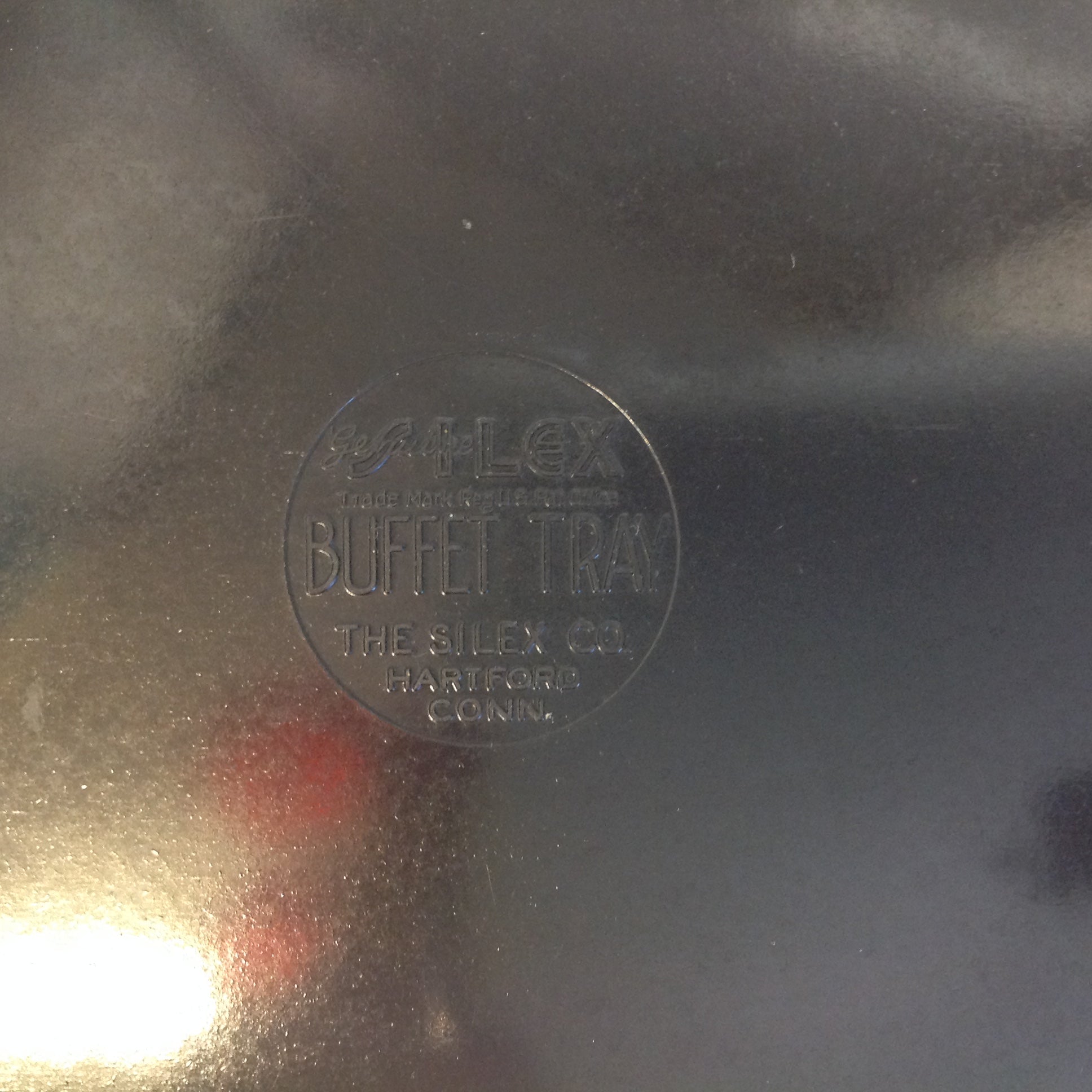 This is a vintage used item, in good used condition, with little sign of age/wear; there is mild rubbing to surface of tray, hint of wear to base and rim. Overall acrylic quality is good, smooth/glossy, with excellent preservation of color/sheen. There are no excessive nicks, chips, dents, divots, cracks, breaks, stains, residue or repairs. The tray measures approx 15" (handle-to-handle) by 6.75". The tray is stamped "Genuine Silex Buffet Tray" and is made in the USA.