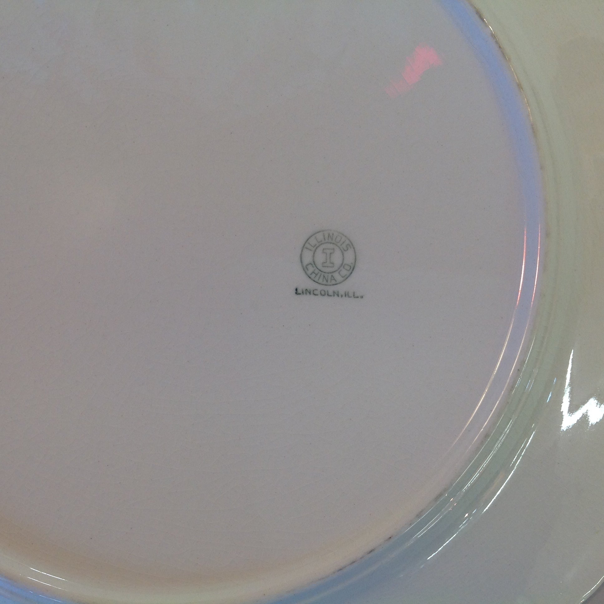 This is a vintage used item, in good used condition, with light signs of age/wear; there is mild rubbing to surface of porcelain, light wear along/about base. Overall quality is good; clean, smooth/glossy, with excellent preservation of color/sheen and typography still sharp/bold. There are no excessive nicks, chips, dents, divots, scrapes, scuffs, scratches, cracks, breaks, stains, residue or repairs. The plate measures approx 10.25" wide, with a 6.5" wide base and .5" lift and is stamped "Illinois China Company."