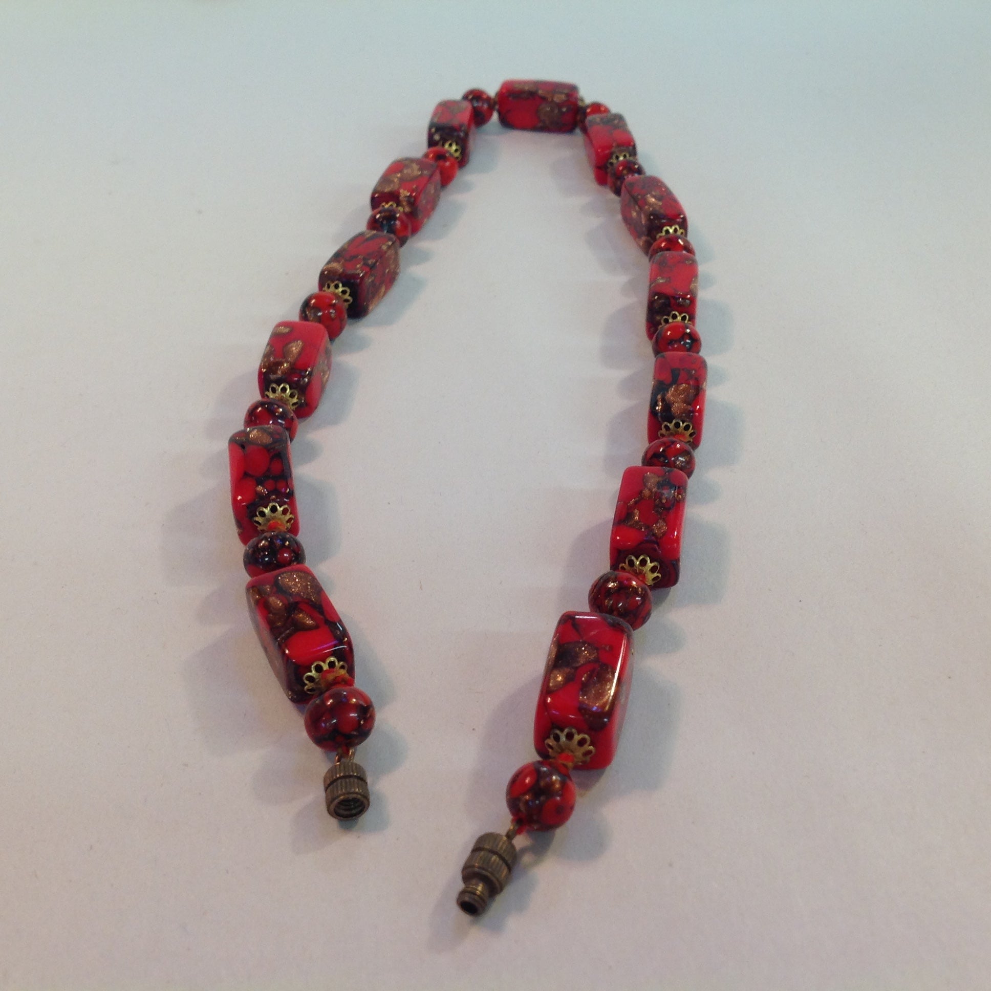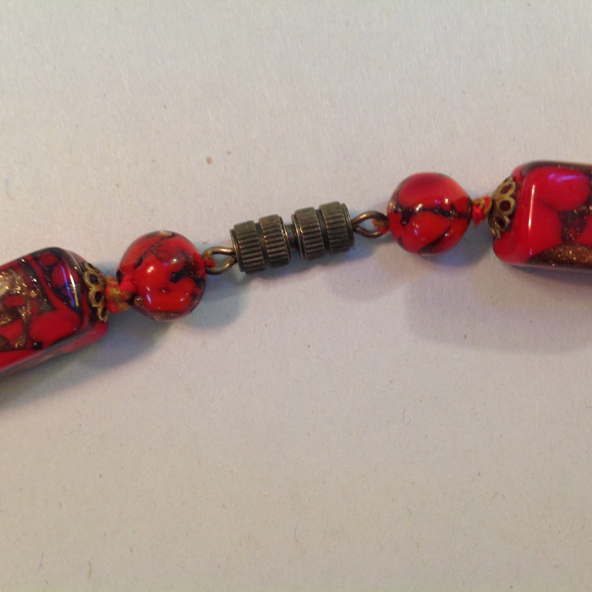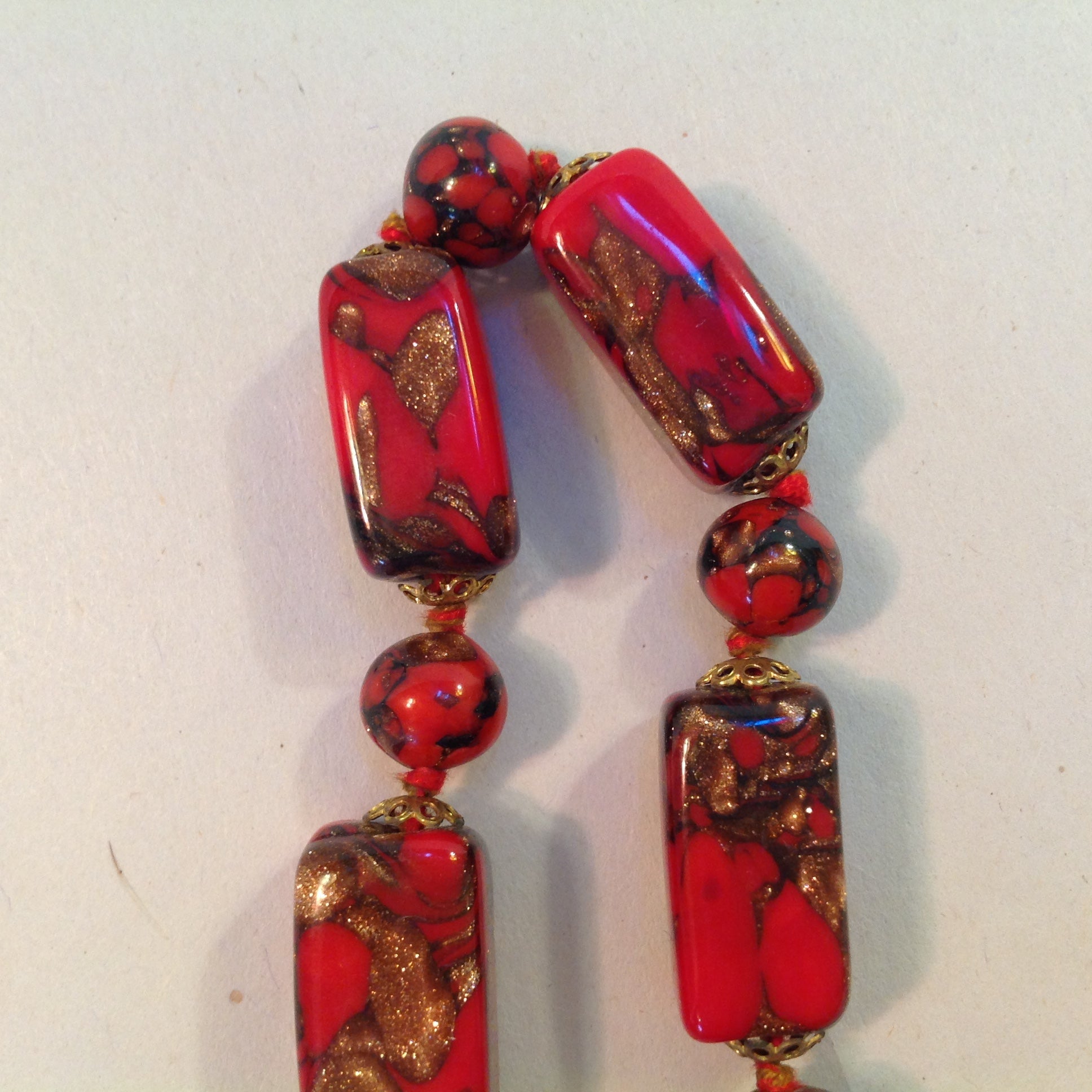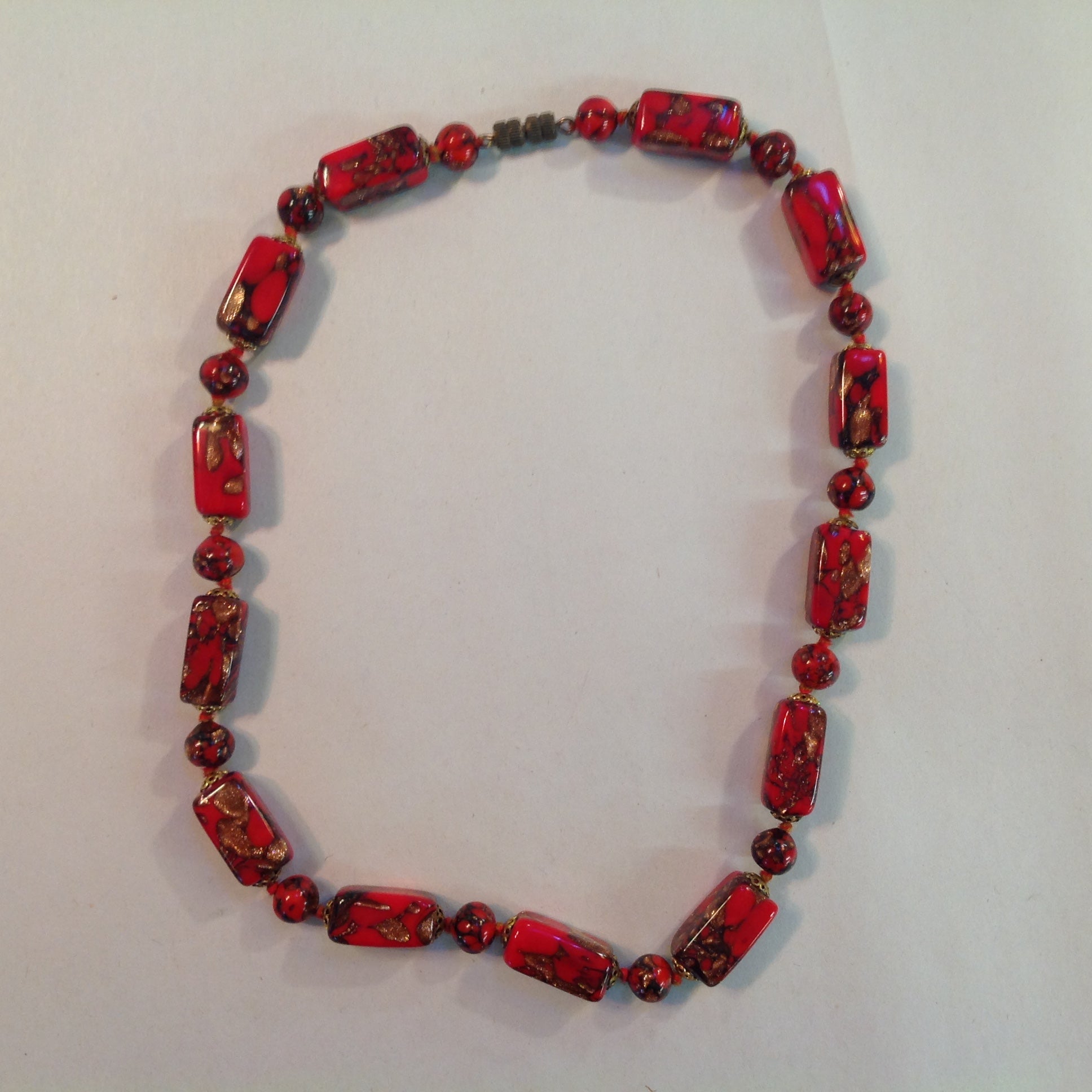 This is a vintage used item, in good used condition, with light signs of age/wear; there is mild rubbing to surface of glass, light wear along/about barrel screw clasp. Overall quality is good; clean, smooth/glossy, with excellent preservation of color/sheen; clasp remains in good working order. There are no excessive nicks, chips, dents, divots, scrapes, scratches, scuffs, cracks, breaks, stains, residue or repairs. The necklace is hand-knotted and measures approx 17.5" long.