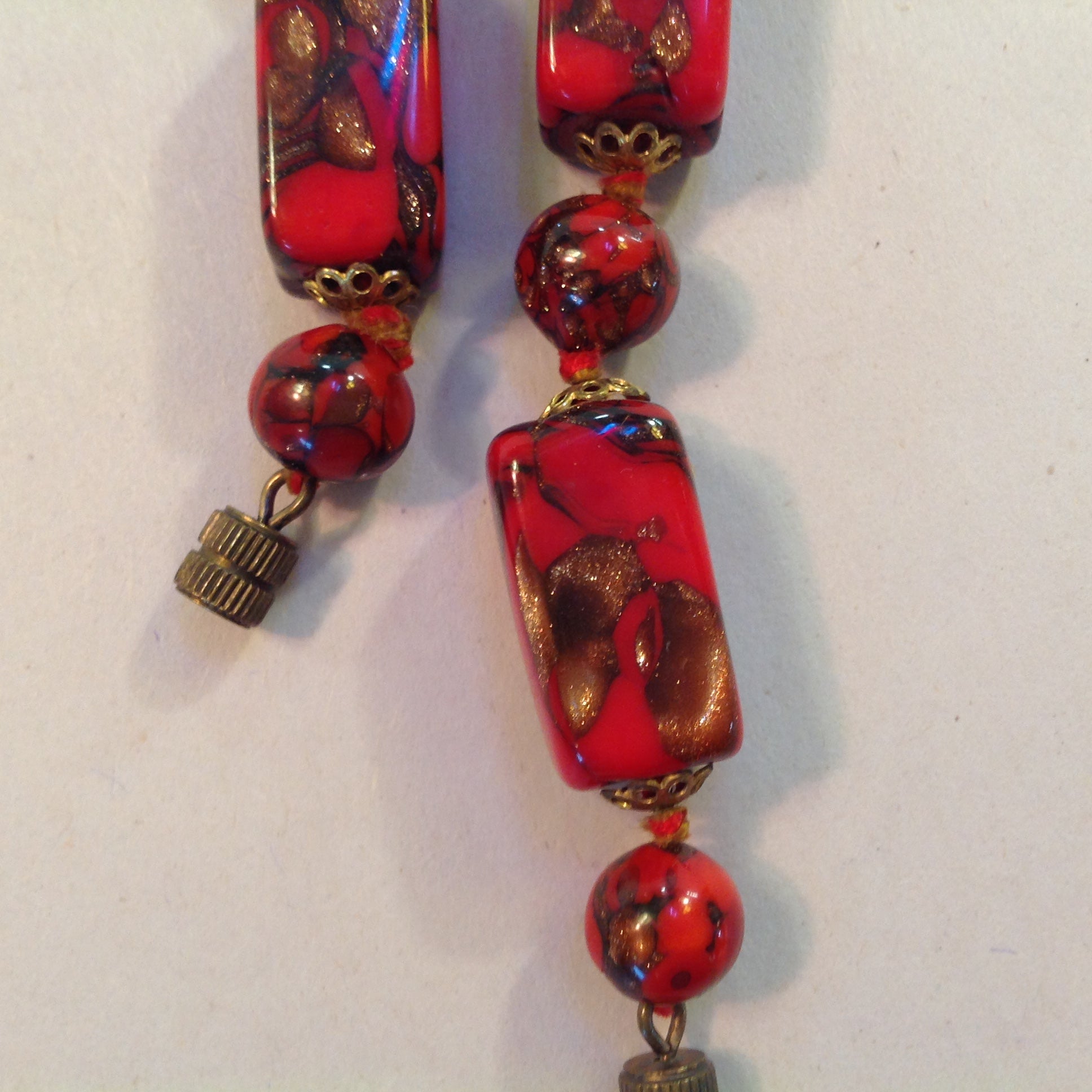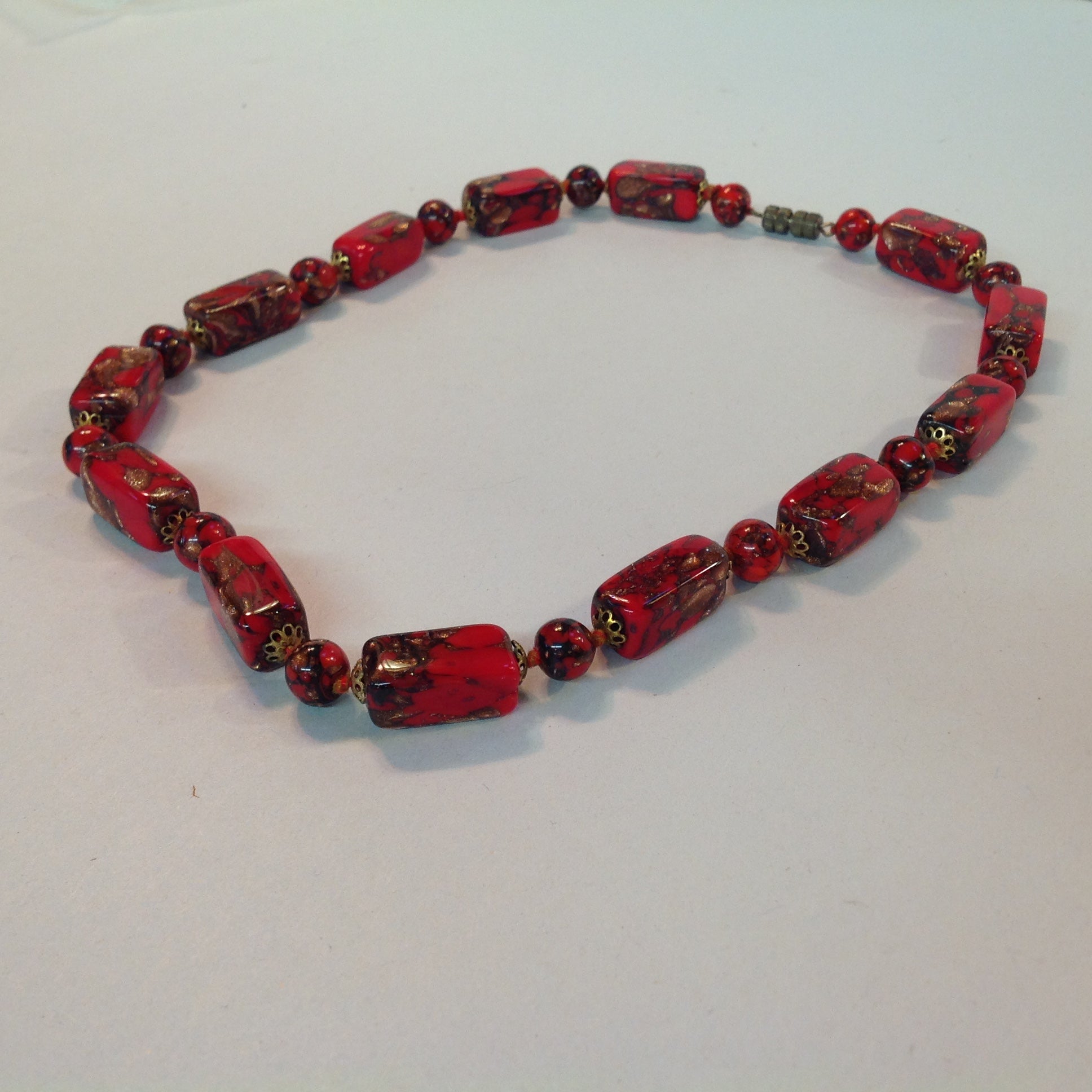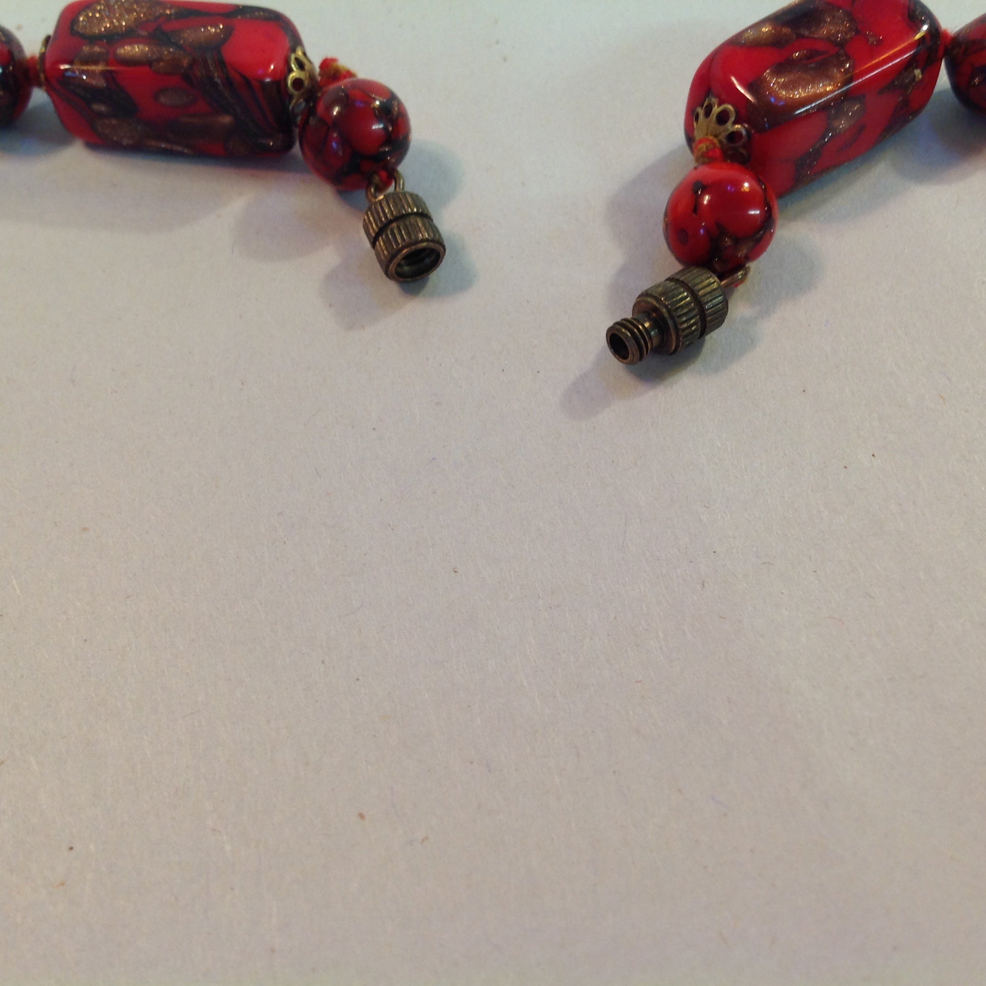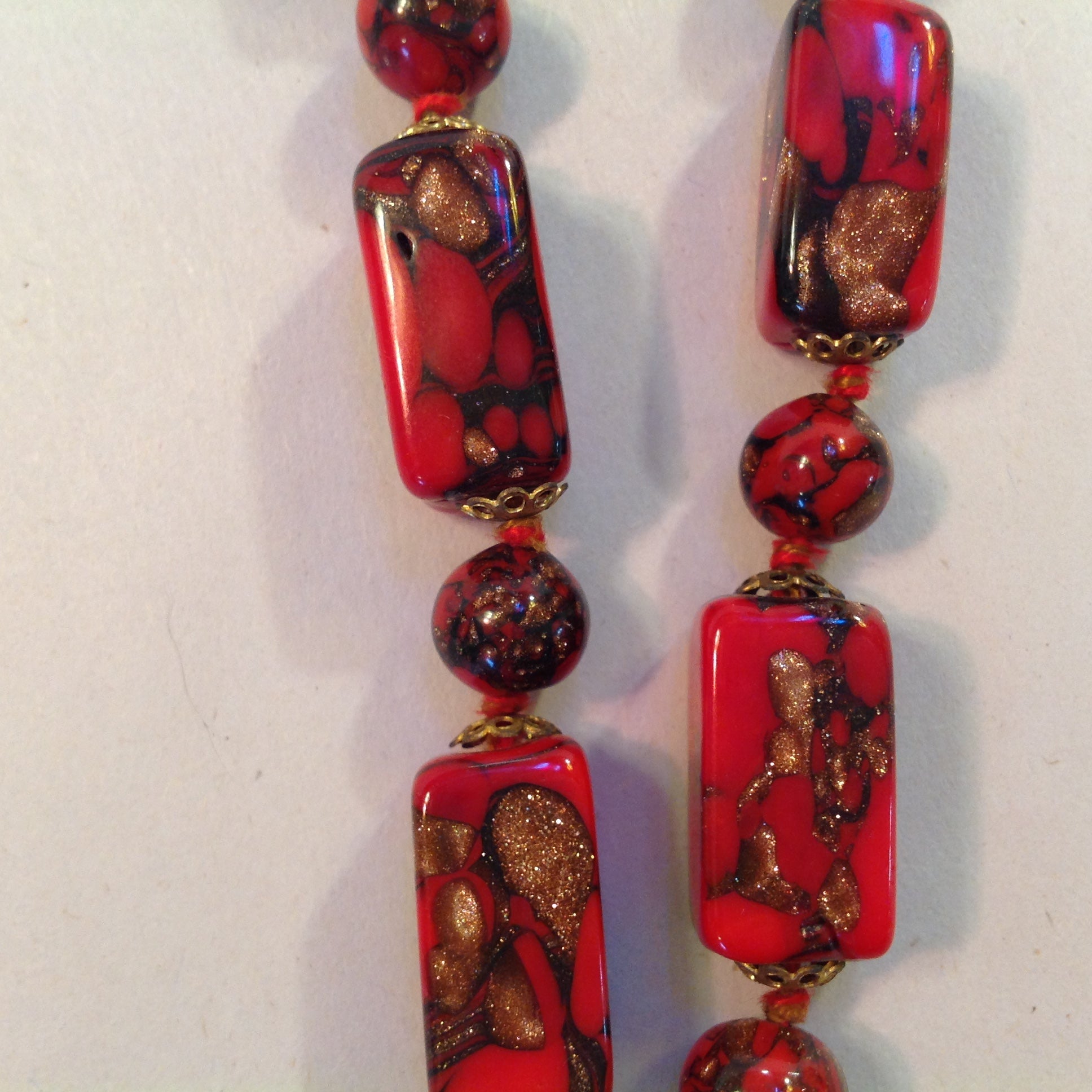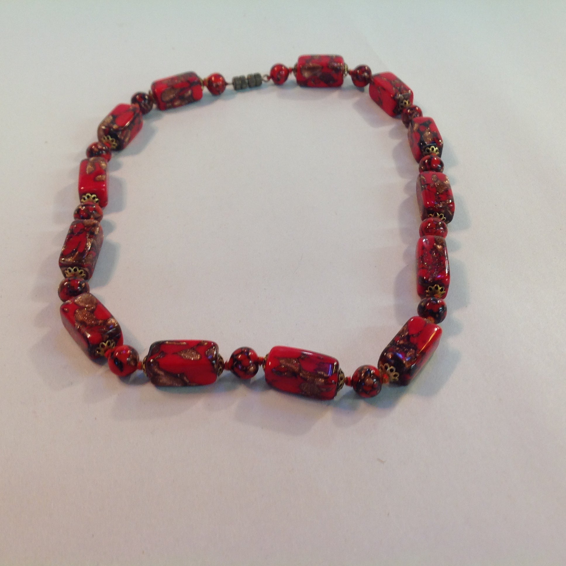 This is a vintage used item, in good used condition, with light signs of age/wear; there is mild rubbing to surface of glass, light wear along/about barrel screw clasp. Overall quality is good; clean, smooth/glossy, with excellent preservation of color/sheen; clasp remains in good working order. There are no excessive nicks, chips, dents, divots, scrapes, scratches, scuffs, cracks, breaks, stains, residue or repairs. The necklace is hand-knotted and measures approx 17.5" long.