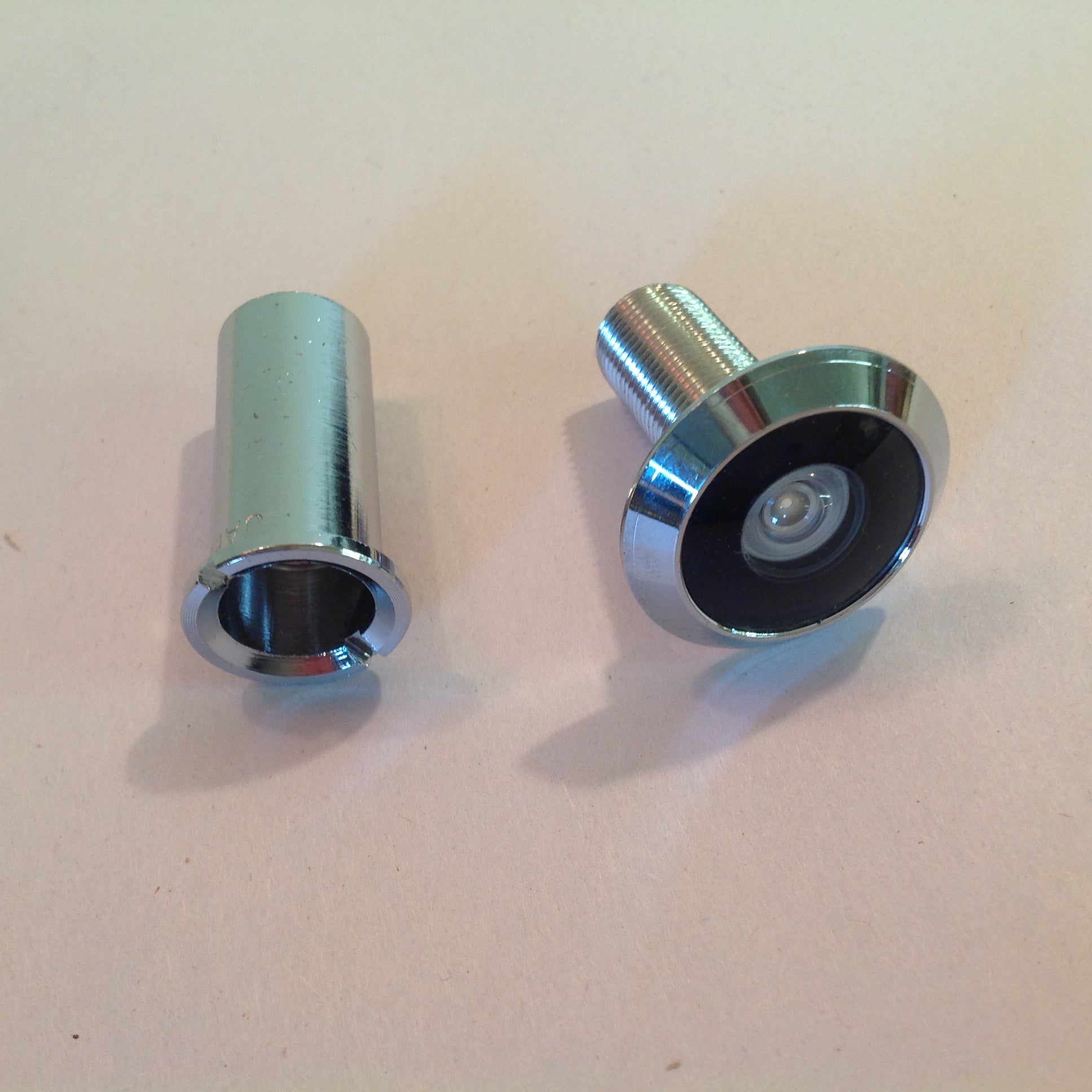 This is a vintage N(ew) O(ld) S(tock) item, in good NOS condition, with little signs of age/wear; there is light rubbing to surface of chromed metal, minor points of blemish. Overall quality is good; smooth/glossy, with good preservation of color/sheen and lens in good working order. There are no excessive nicks, chips, dents, divots, scrapes, scratches, scuffs, cracks, breaks, stains, residue or repairs. The peephole measures approx 2" long, with lens approx 1" round and base .75" round.
