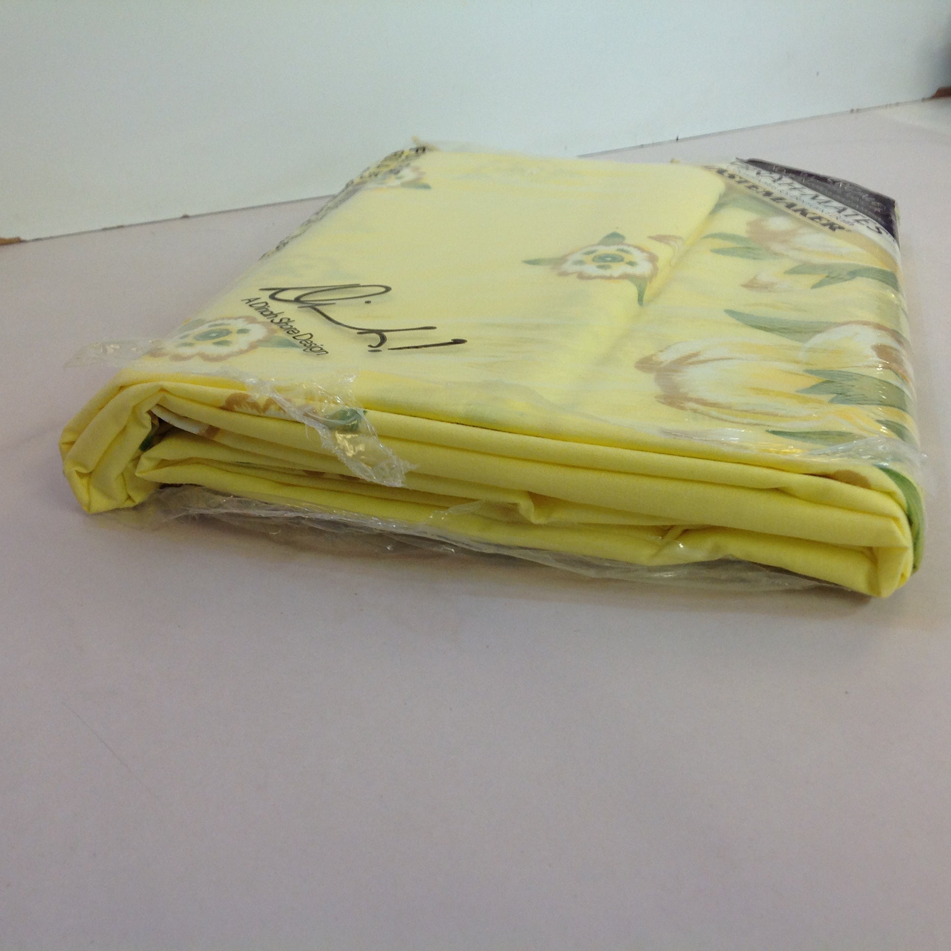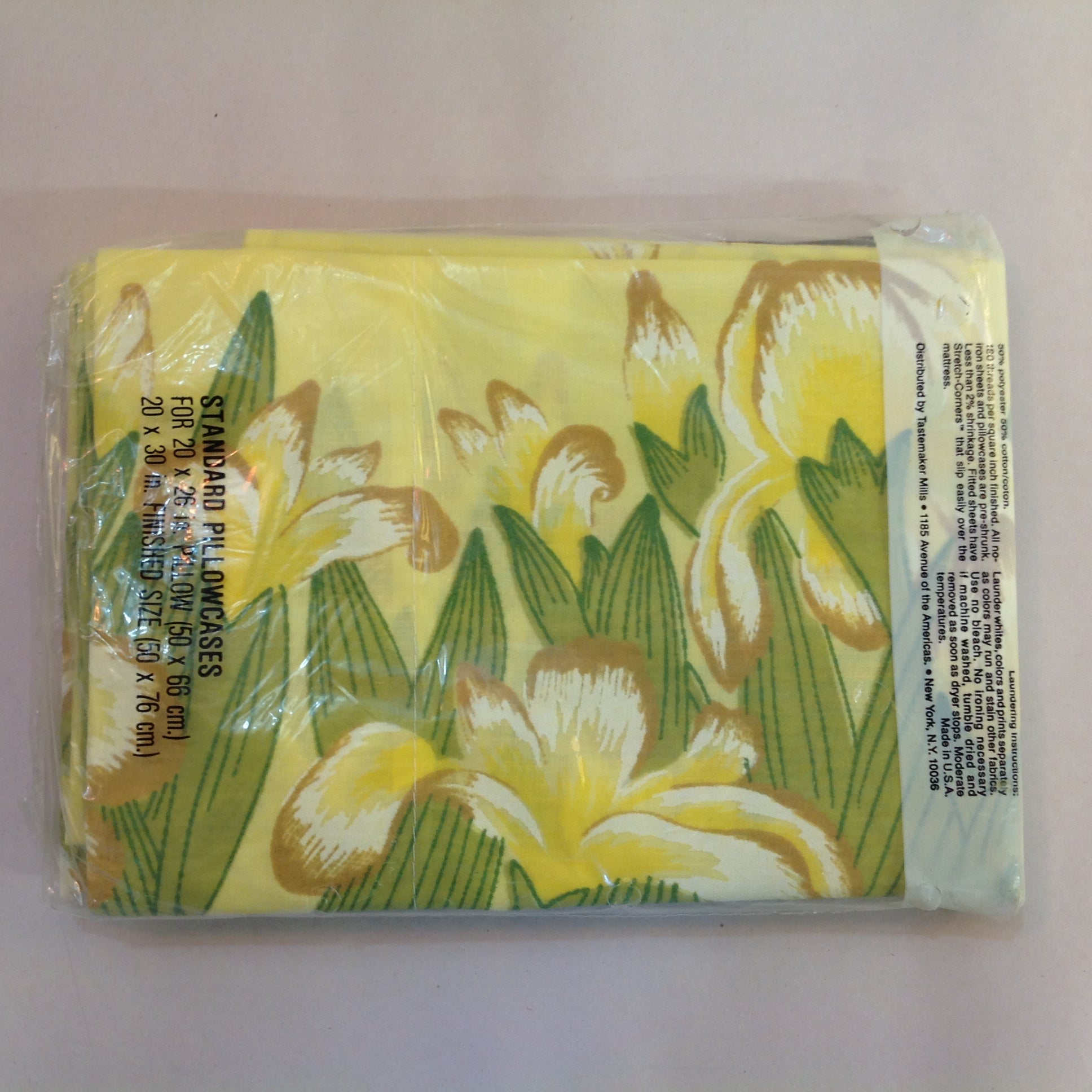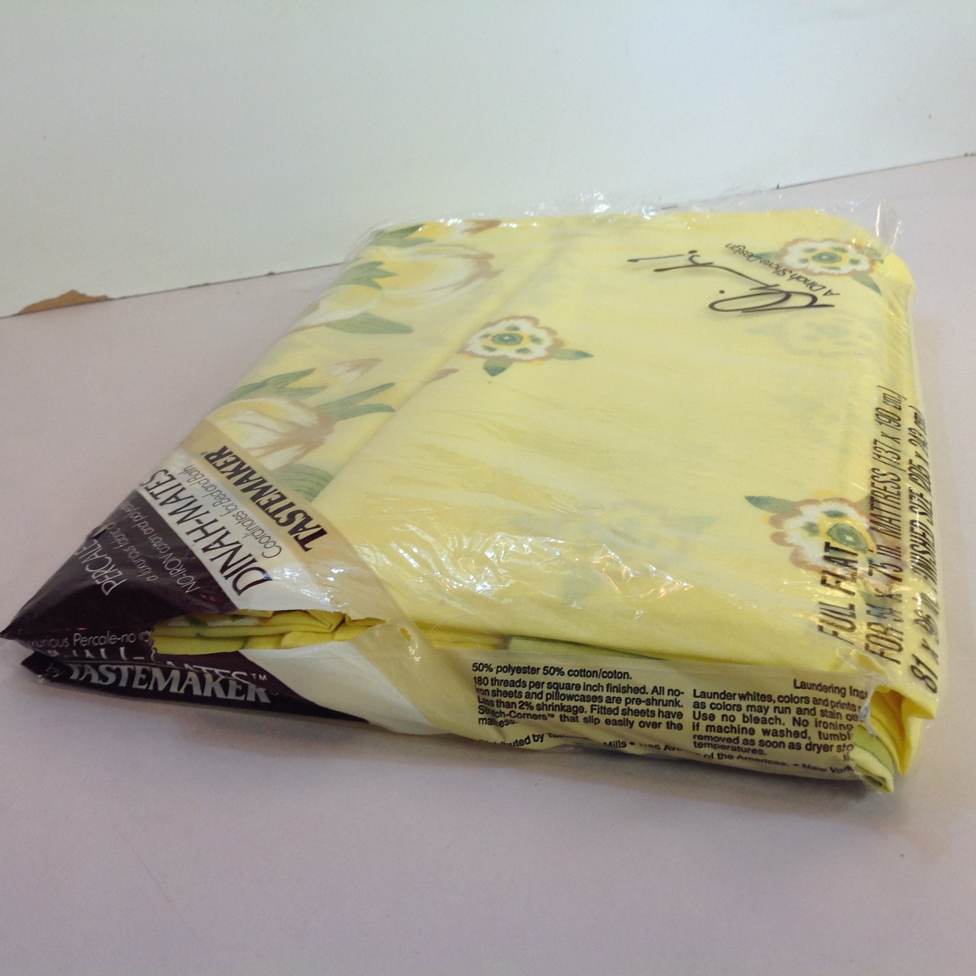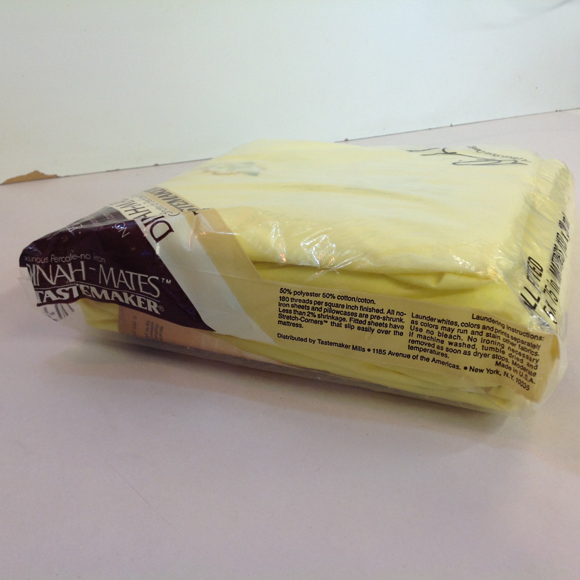 These are vintage N(ew) O(ld) S(tock) items, in good NOS condition, with light signs of age/wear; the bedding linens are still in their original packaging, which has not been opened, but has split at ends; plastic wrap shows light rubbing, some fading. Interior linens appear unused; clean/smooth, soft/supple, with excellent preservation of color/sheen and graphics still sharp/vivid. There are no excessive nicks, rips, tears, perforations, stains, residue or repairs. This set includes two standard pillowcases (20" x 26"), Full Fitted Sheet (54" x 75") and Full Flat Sheet (54" x 75"). The linens are labeled as 50/50 polyester/cotton from Tastemaker and are made in the USA.
