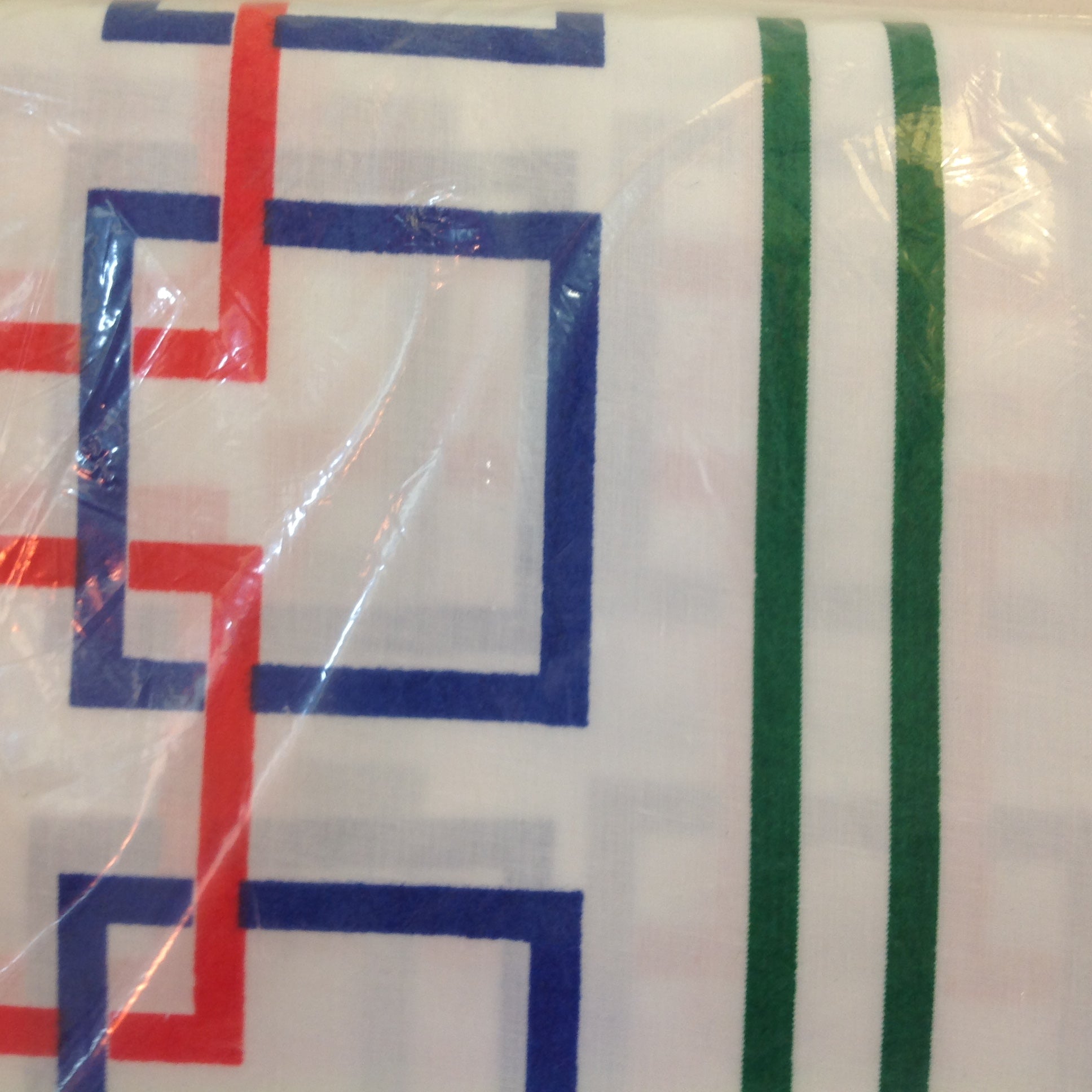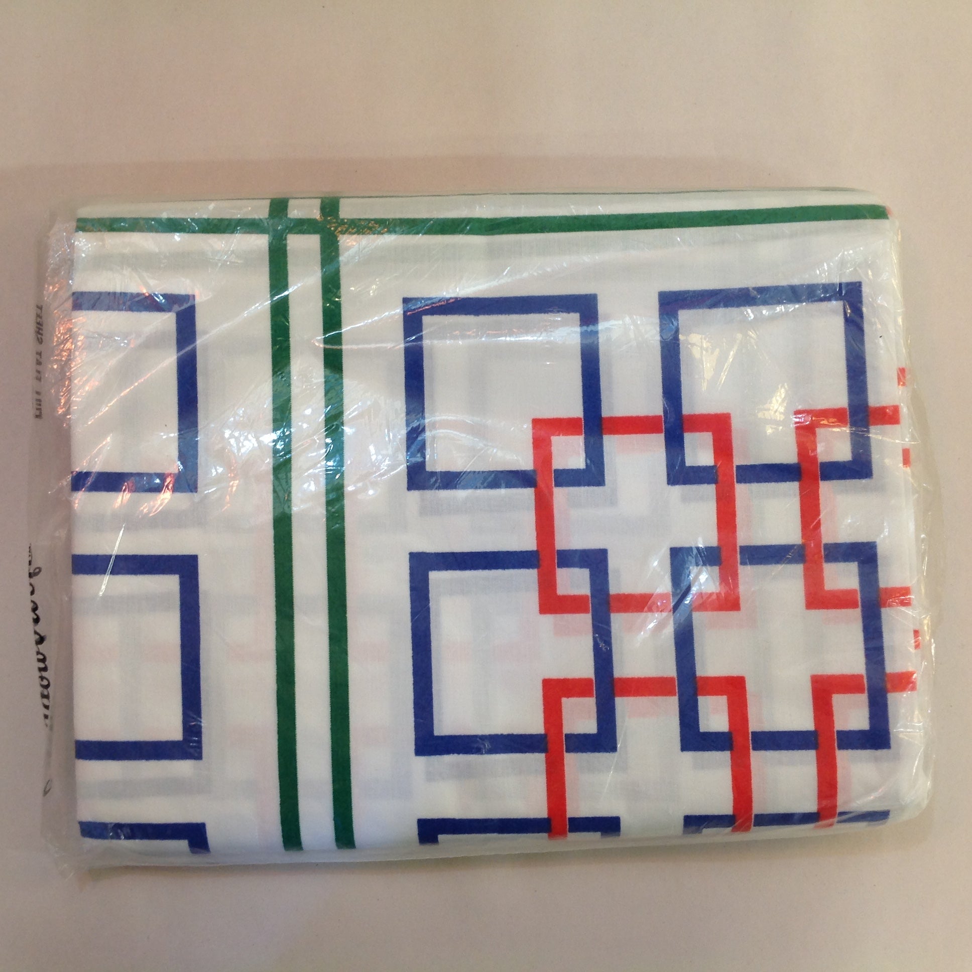 This is a vintage N(ew) O(ld) S(tock) item, in good NOS condition, with little sign of age/wear; the sheet is still in its original packaging, which has not been opened, and shows light rubbing to plastic wrap. Interior full flat sheet appears unused; clean/smooth, soft/supple, with excellent preservation of color/sheen and geometric design still sharp/bold. There are no excessive nicks, rips, tears, perforations, stains, residue or repairs. The sheet is labeled as a Full Flat Sheet (54" x 75") from Meadowbrook of 50/50 cotton/polyester and is made in the USA.