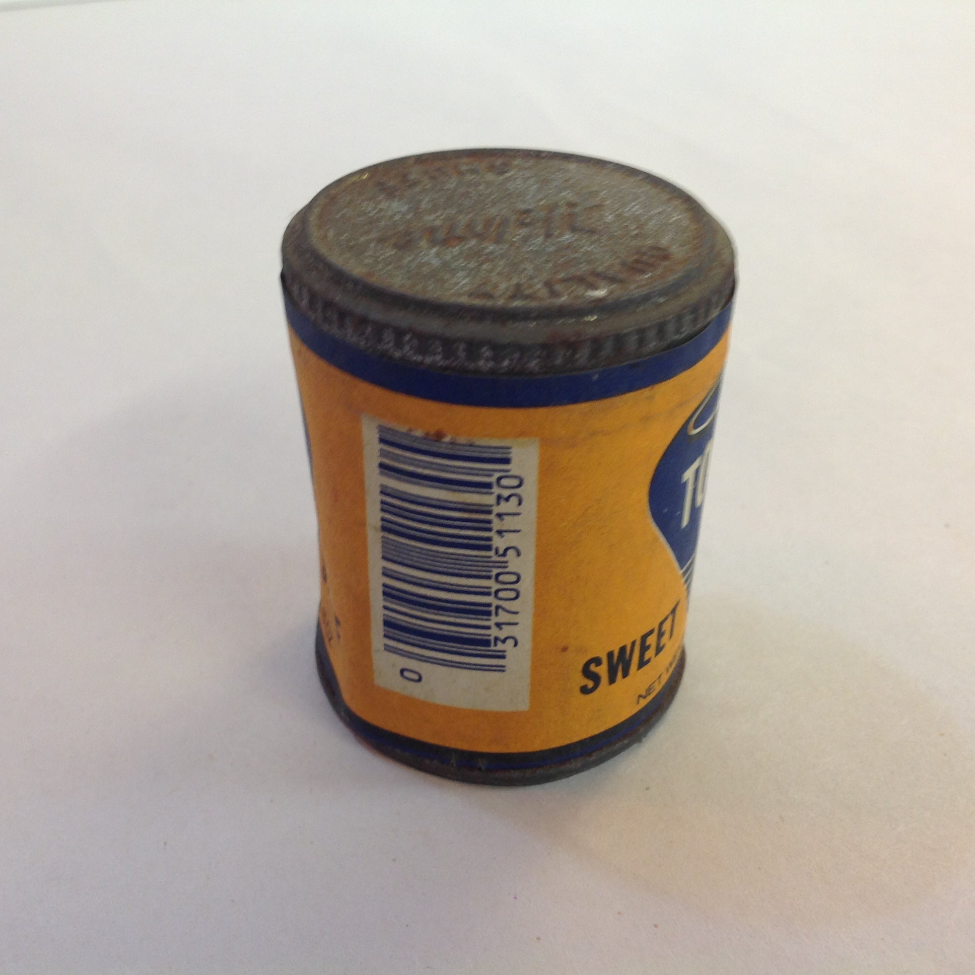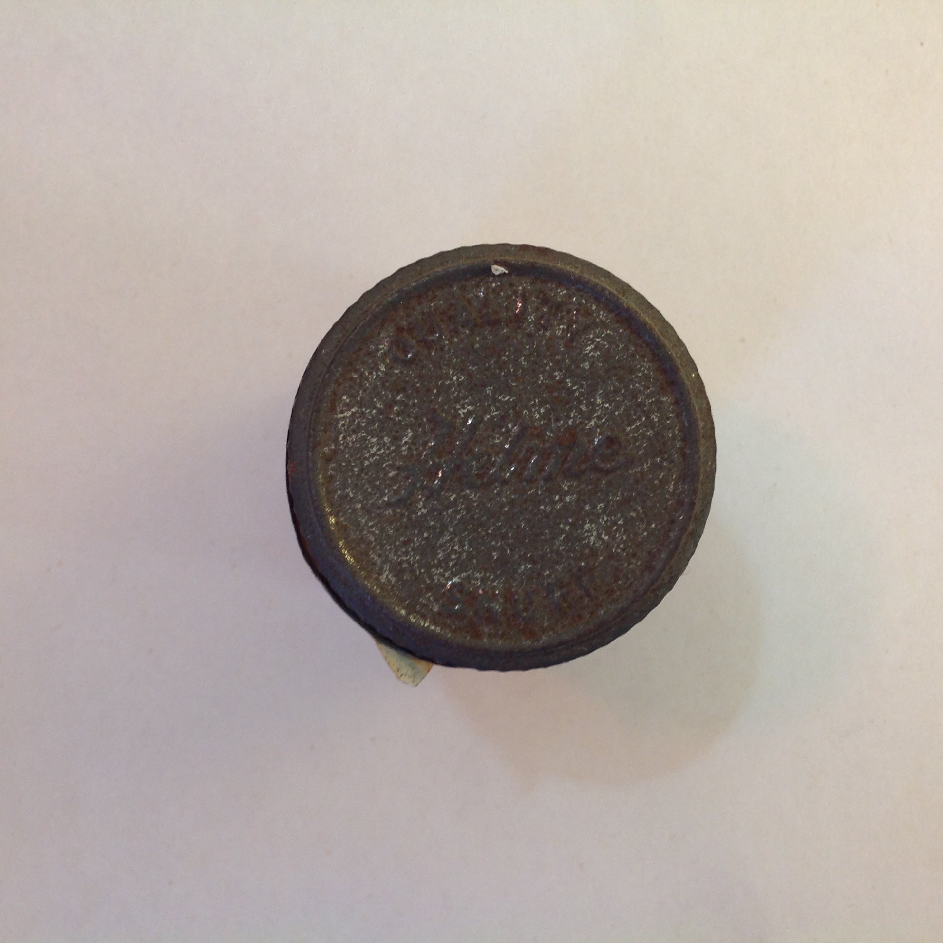 This is a vintage N(ew) O(ld) S(tock) item, in good NOS condition, with some signs of age/wear; there is light rubbing/scuffing to surface of tin, light fading/smudging to paper decal, wear along/about base and lid, patterns of tarnish/rusting to lid and base, minor points of blemish/distress, point of crushing to tin at base right of logo graphics. Overall quality is good; smooth/clean, with good preservation of color/sheen and graphics still sharp/clear. There are no excessive nicks, chips, scrapes, scratches, scuffs, cracks, breaks, stains, residue or repairs. The tin is labeled as 1.15oz and measures approx 2.25" tall, with a 1.75" lid and base.