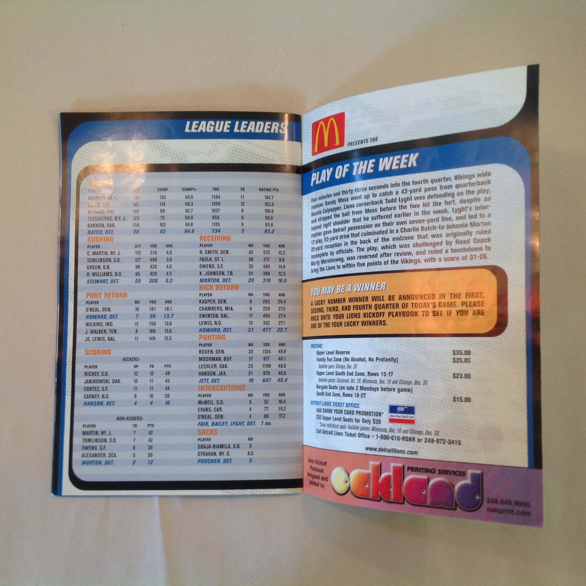 Vintage October 21 2001 Detroit Lions Presents: Kickoff Playbook Lions Vs. Tennessee Titans