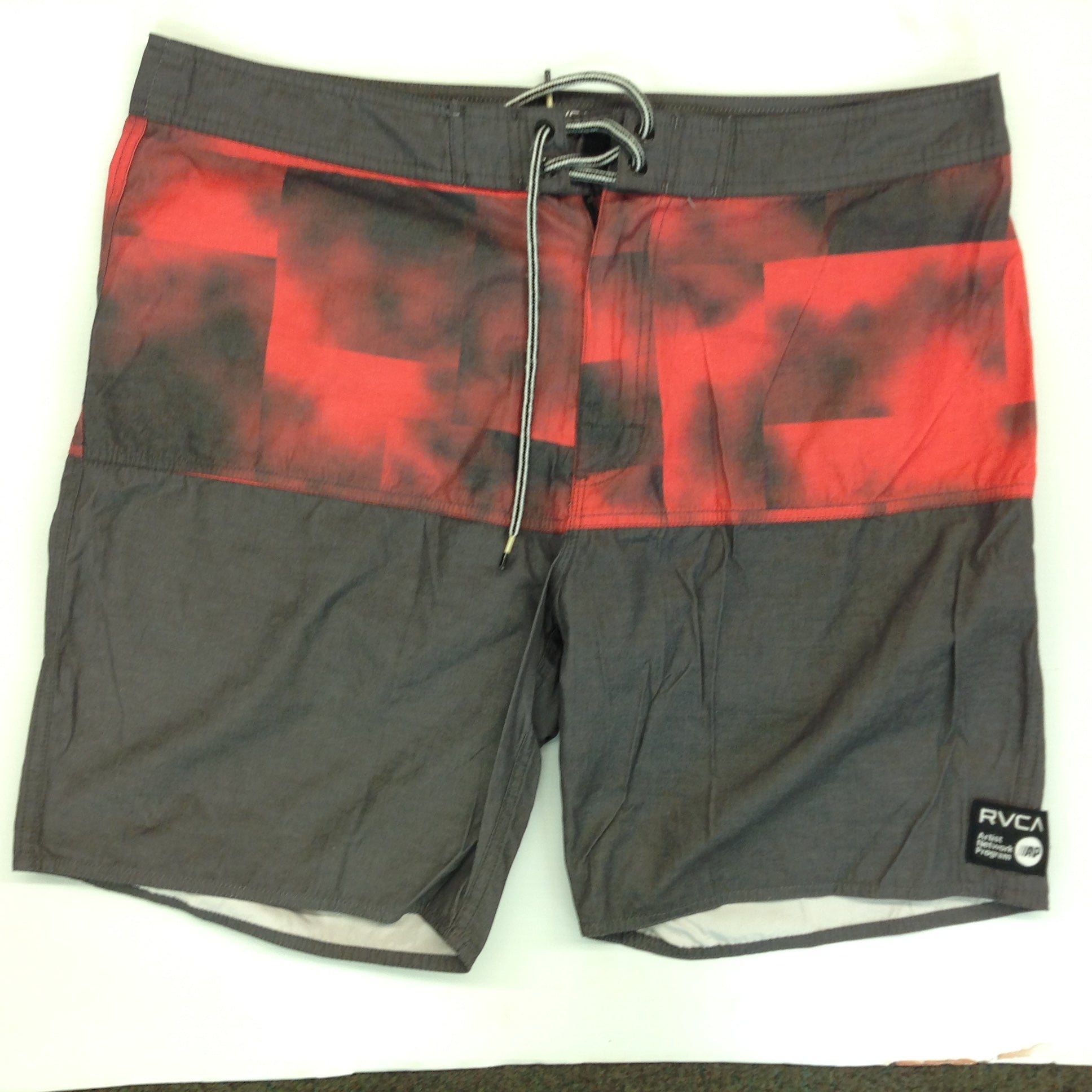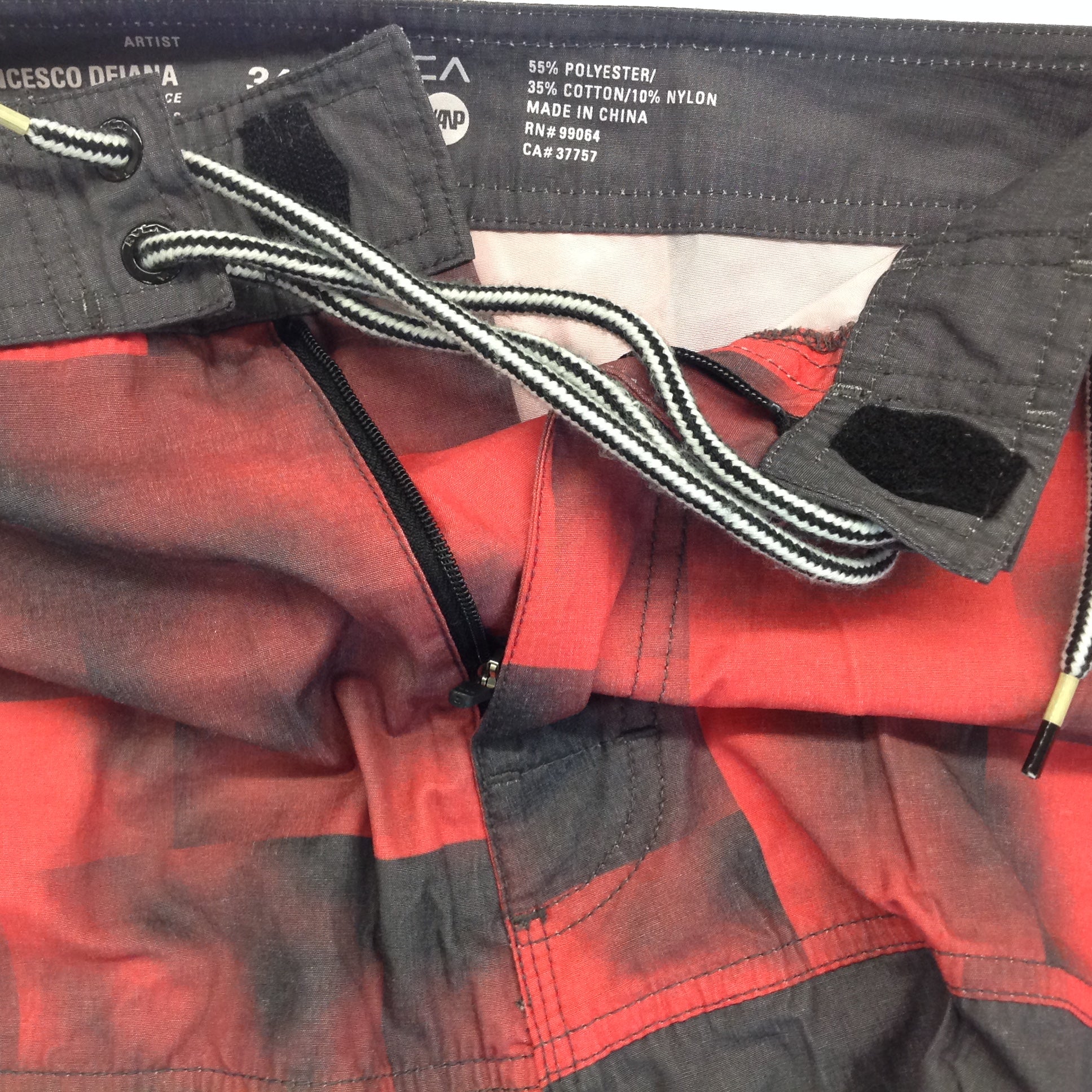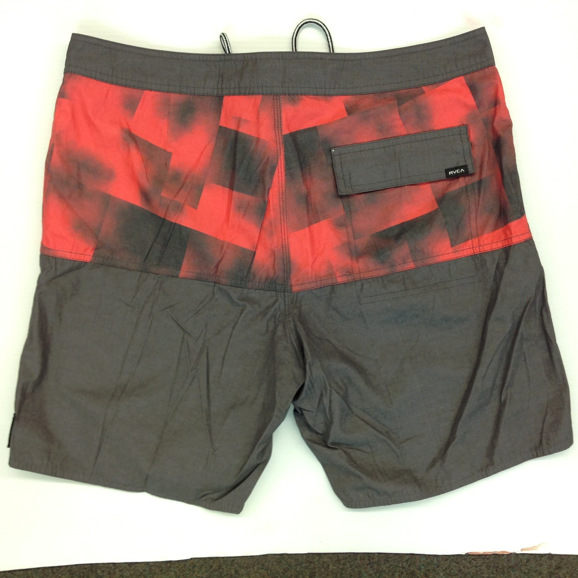These are used items, in good used condition, with little sign of age/wear; there is mild rubbing to surface of fabric. Overall fabric quality is good, smooth/clean, soft/supple, with excellent preservation of color/sheen and manufacturer tags still sharp/bright. There are no excessive rips, tears, perforations, loose threads, stains, residue or repairs. The shorts are labelled as a Men's 34 Waist, of 55% polyester and 35% cotton, 10% nylon and made in China. Overall board shorts measurements are approx: Waist: 36", Inseam: 9", Overall length: 19.5".