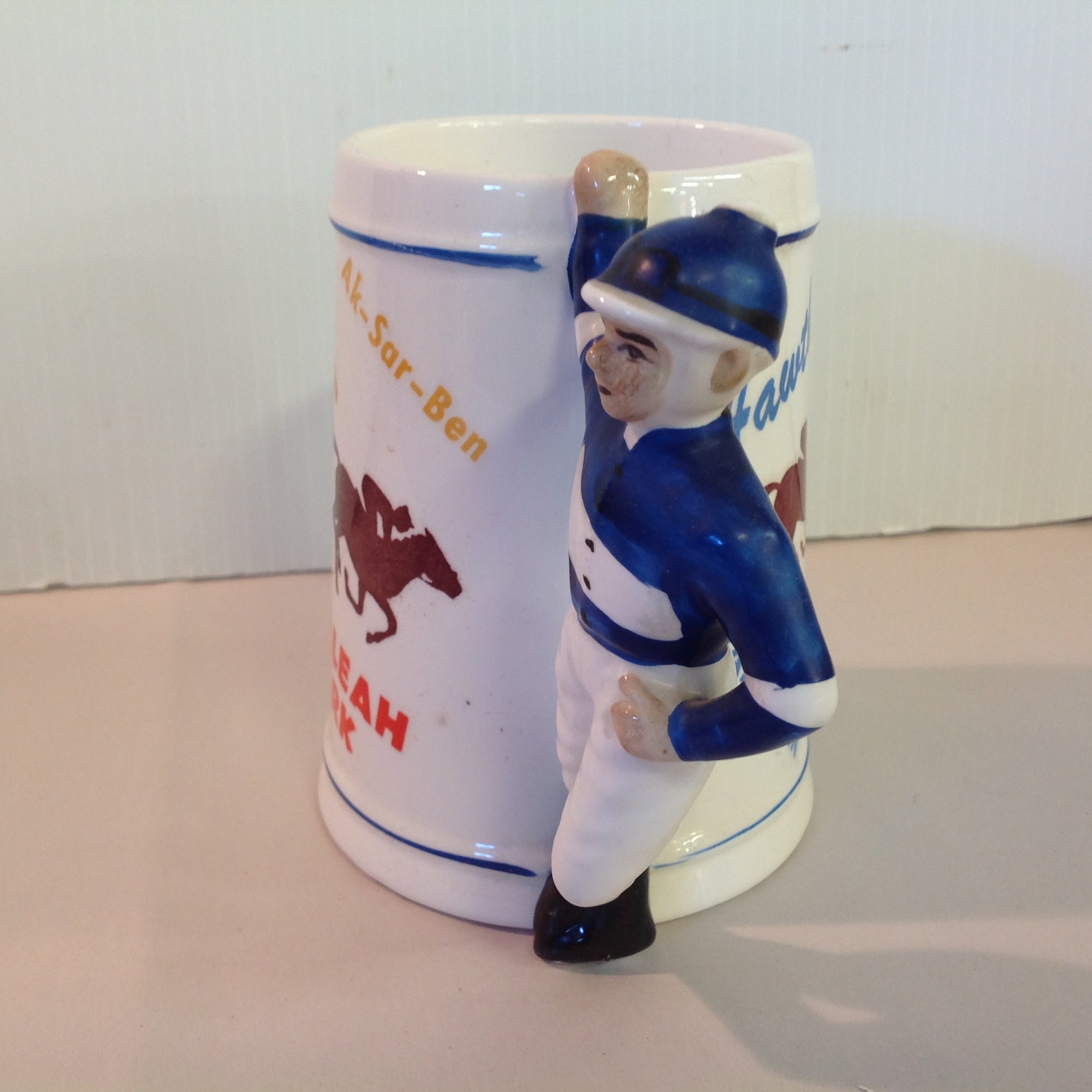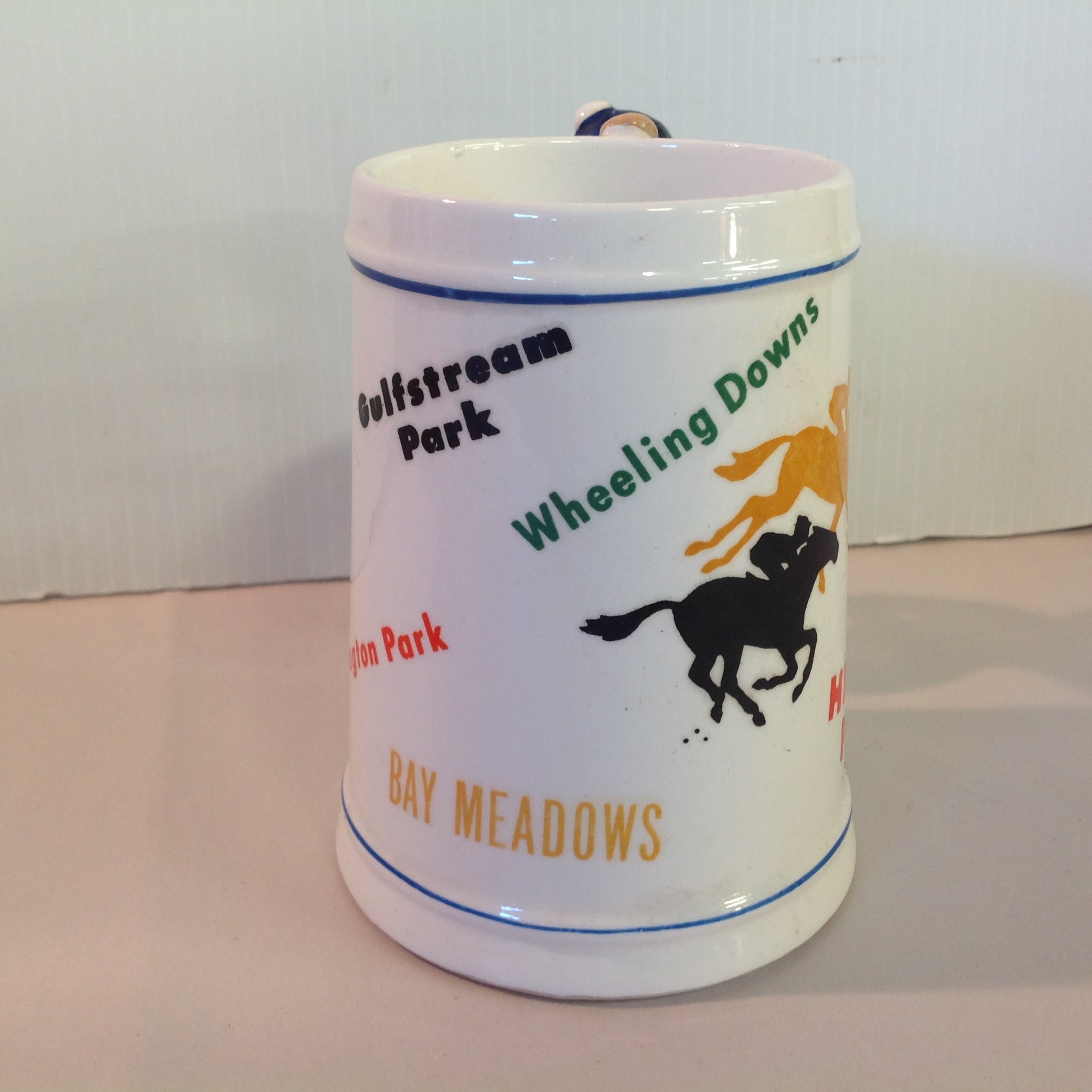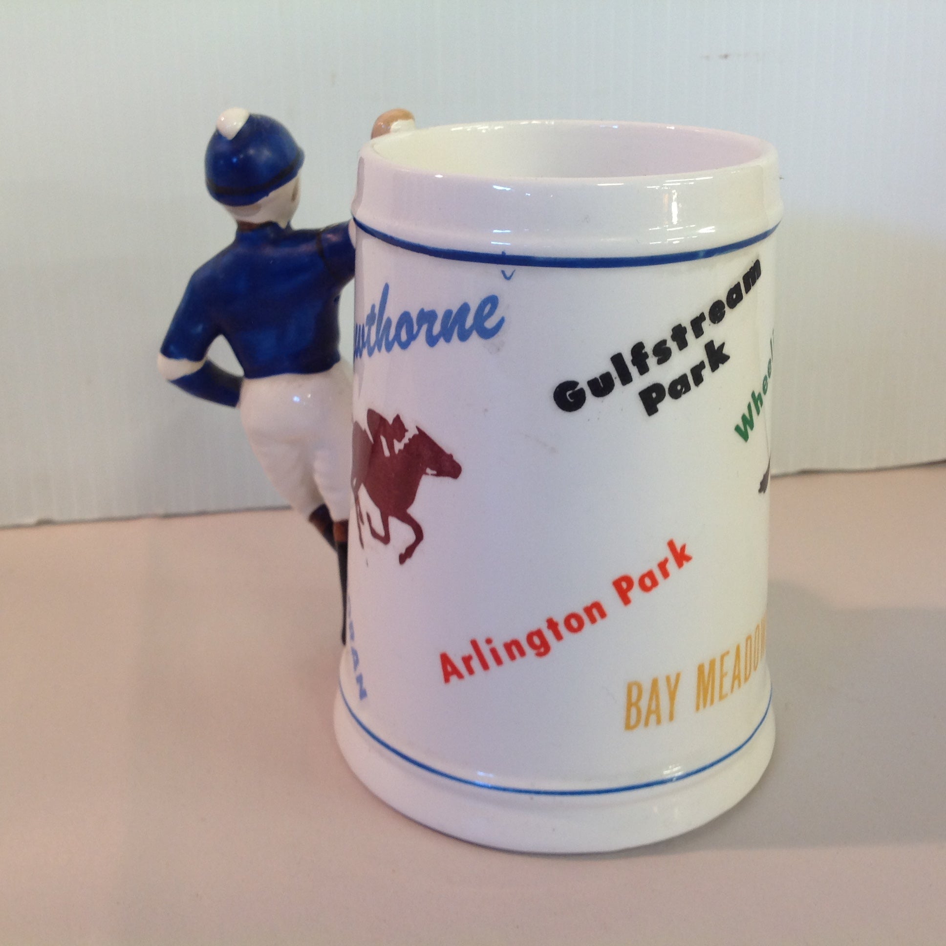 Vintage Souvenir Porcelain Horse Racing Mug Blue Jockey #4 Race Parks Logos