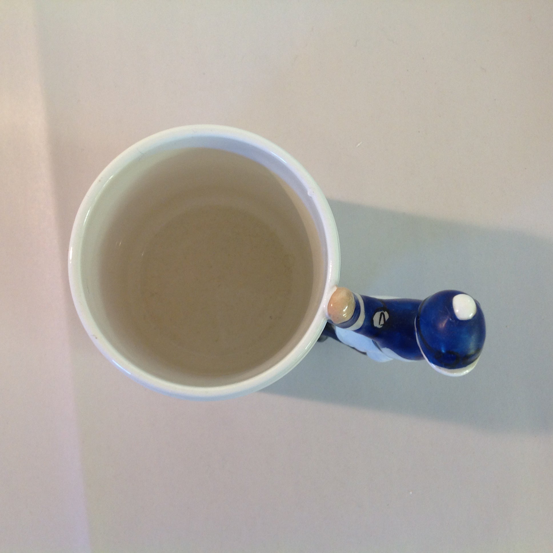 This is a vintage used item, in good used condition, with light signs of age/wear; there is mild rubbing to surface of mug, hint of wear to base, minor points of overpaint and glaze (manufacturer flaw), light wear to base, minor wear to graphics. Overall porcelain quality is good; smooth/glossy, with excellent preservation of color/sheen and graphics still sharp/vivid. There are no excessive nicks, chips, dents, divots, scrapes, scratches, scuffs, cracks, breaks, stains, residue or repairs. The mug measures approx 5" x 5.5" (to handle), with a 2.75" wide mouth and 3.5" wide base.