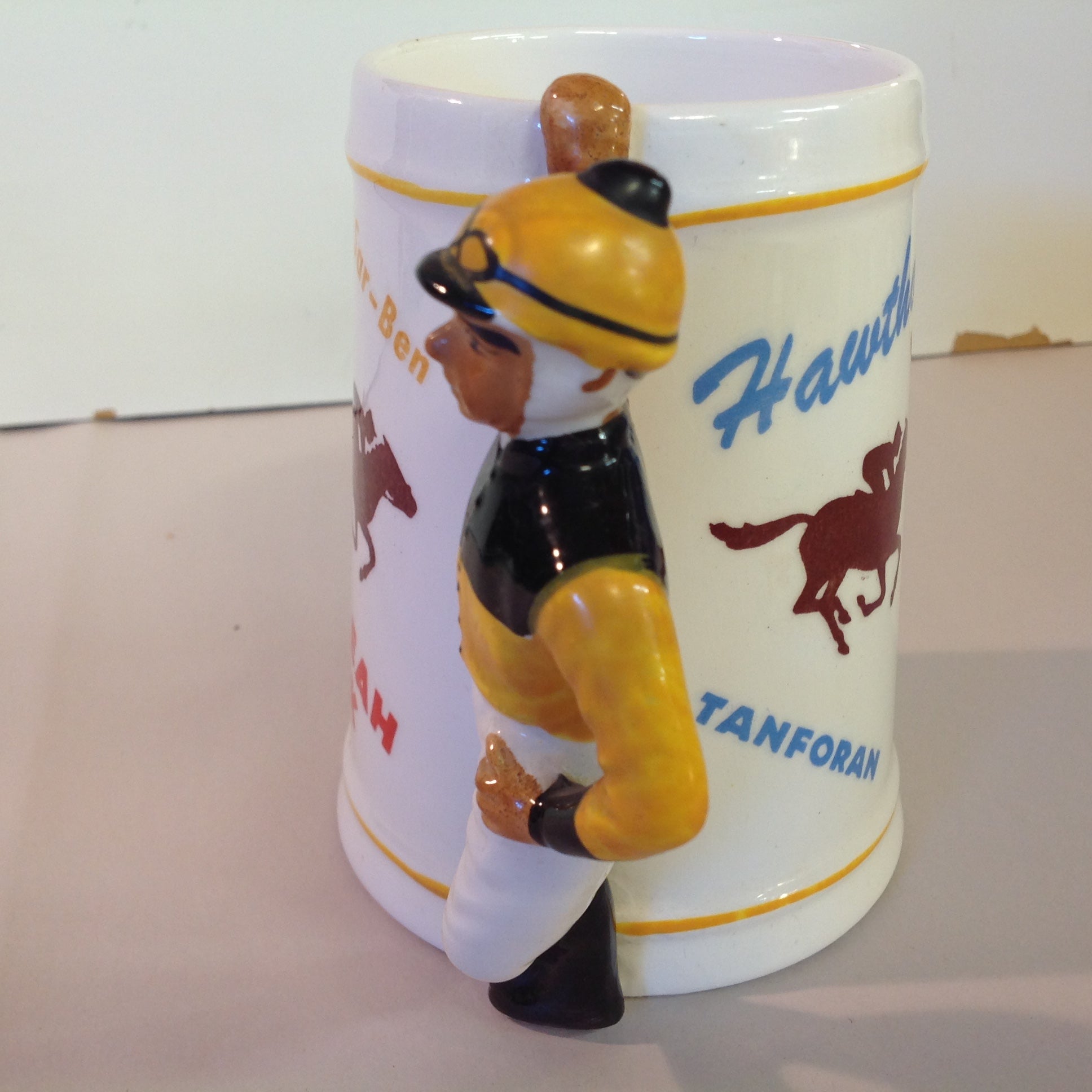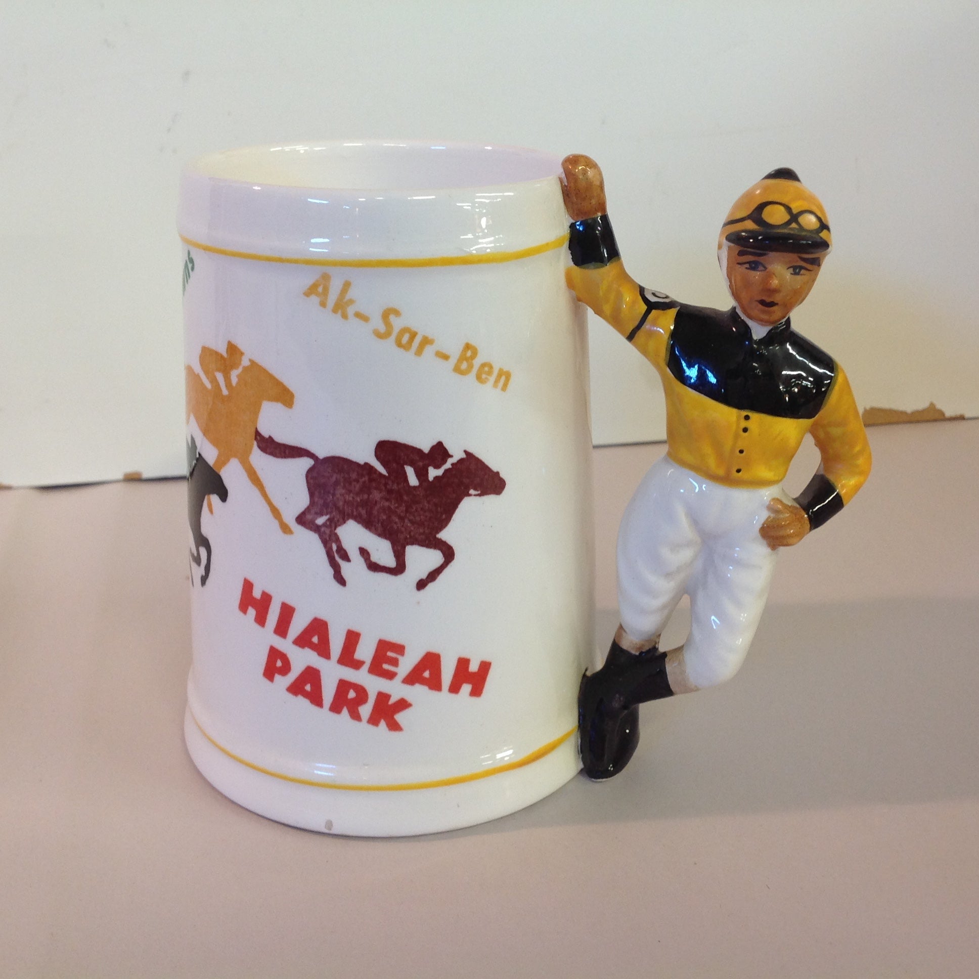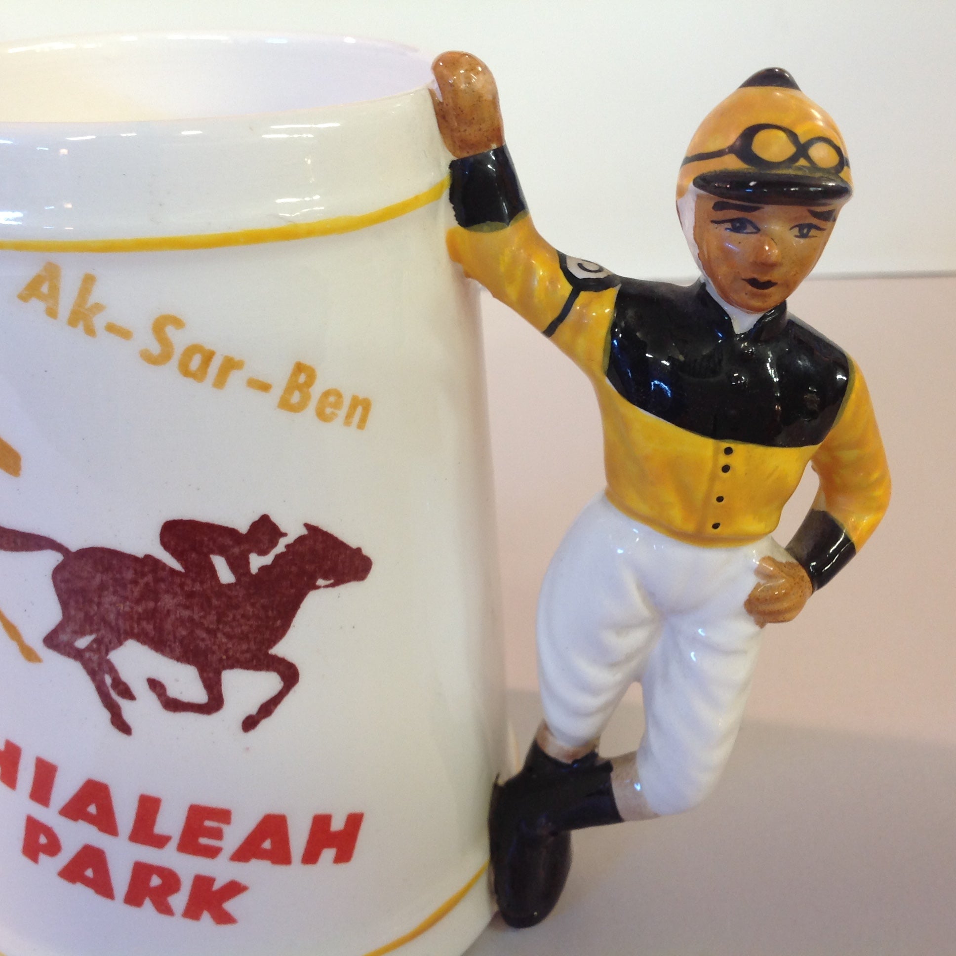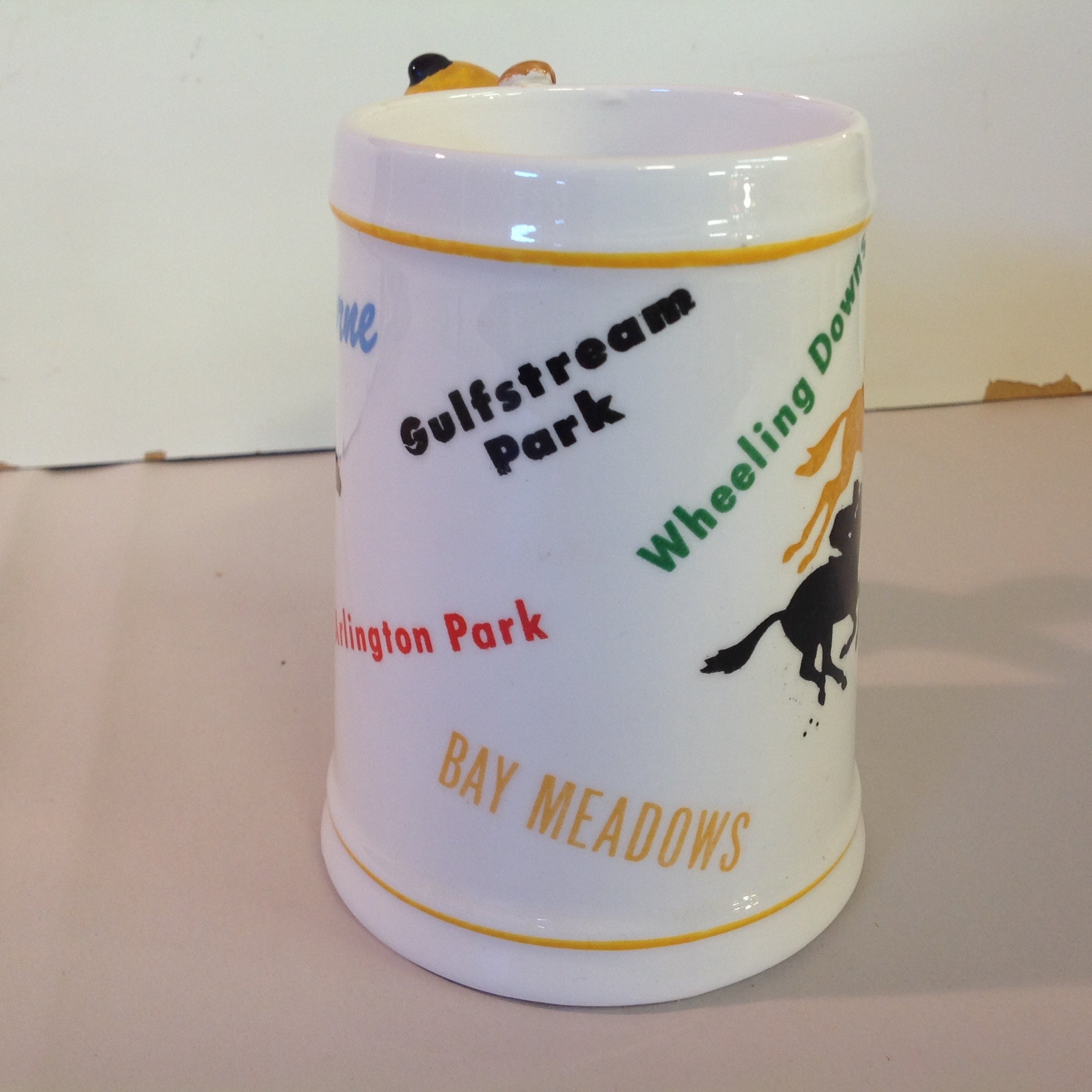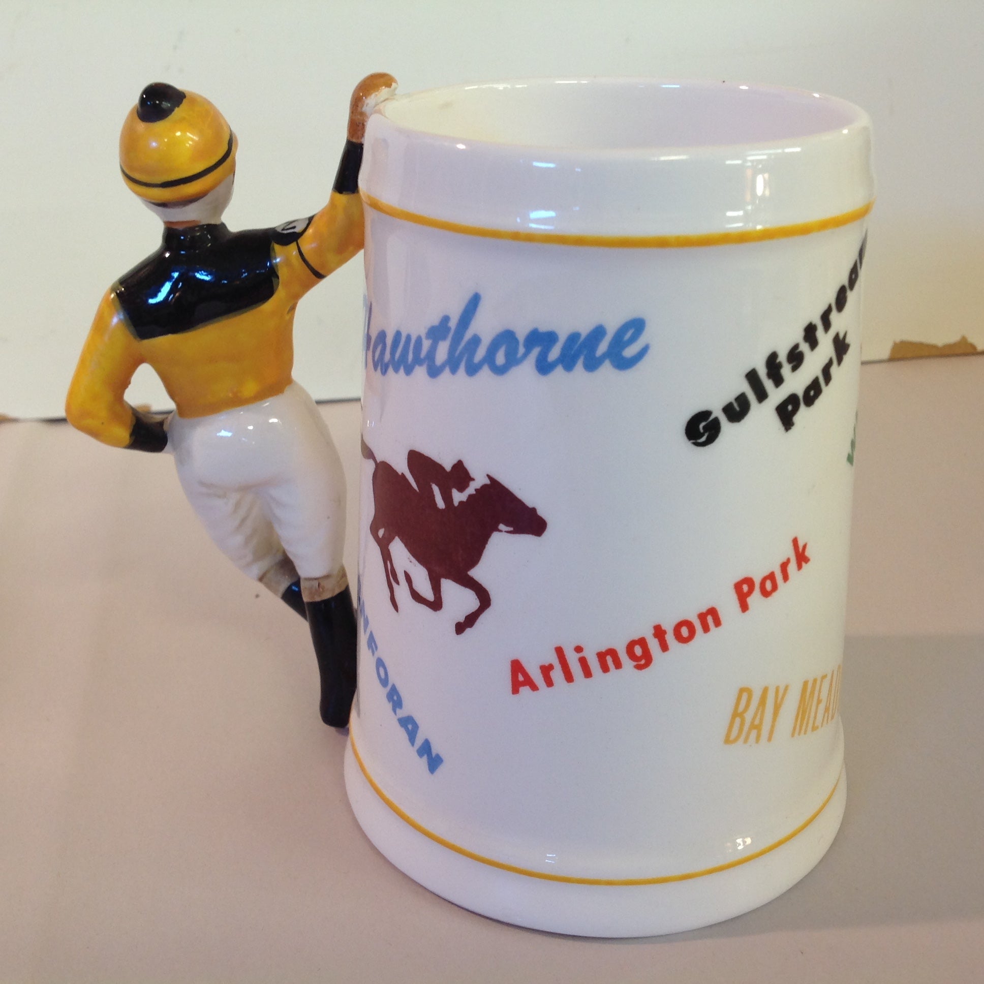 Vintage Souvenir Porcelain Horse Racing Mug Gold Jockey #3 Race Parks Logos