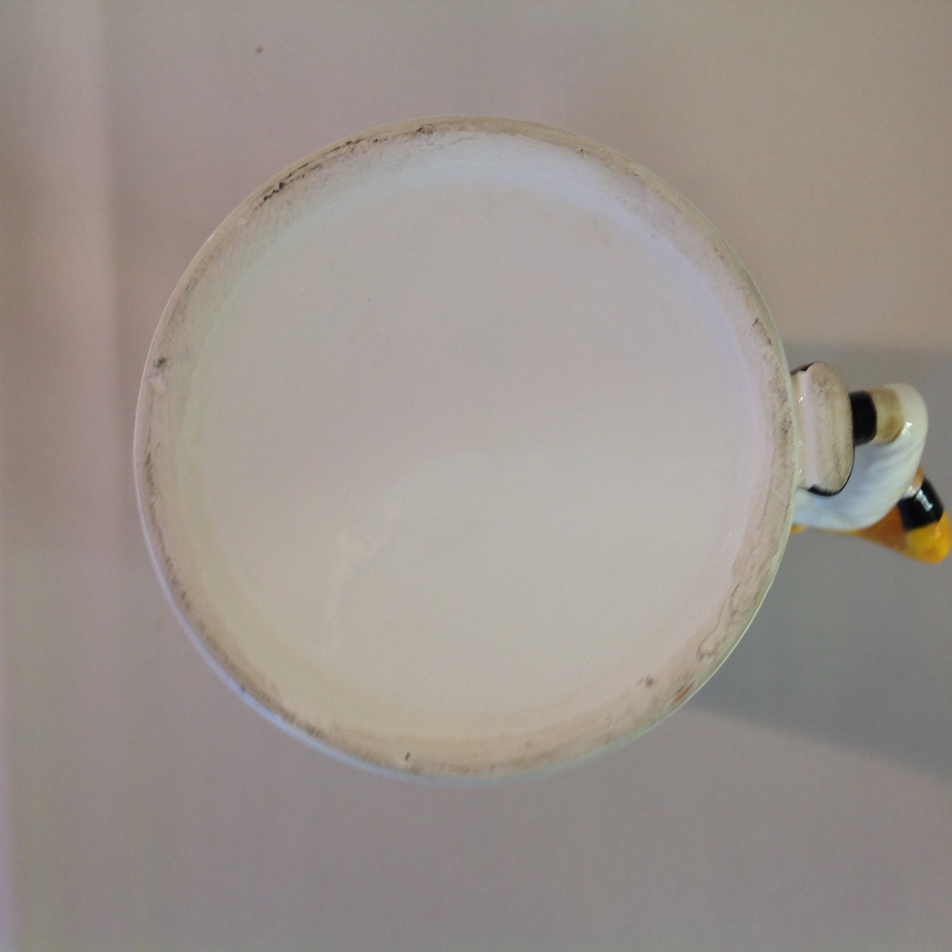 This is a vintage used item, in good used condition, with light signs of age/wear; there is mild rubbing to surface of mug, hint of wear to base, minor points of overpaint and glaze (manufacturer flaw), light wear to base, minor wear to graphics. Overall porcelain quality is good; smooth/glossy, with excellent preservation of color/sheen and graphics still sharp/vivid. There are no excessive nicks, chips, dents, divots, scrapes, scratches, scuffs, cracks, breaks, stains, residue or repairs. The mug measures approx 5" x 5.5" (to handle), with a 2.75" wide mouth and 3.5" wide base.