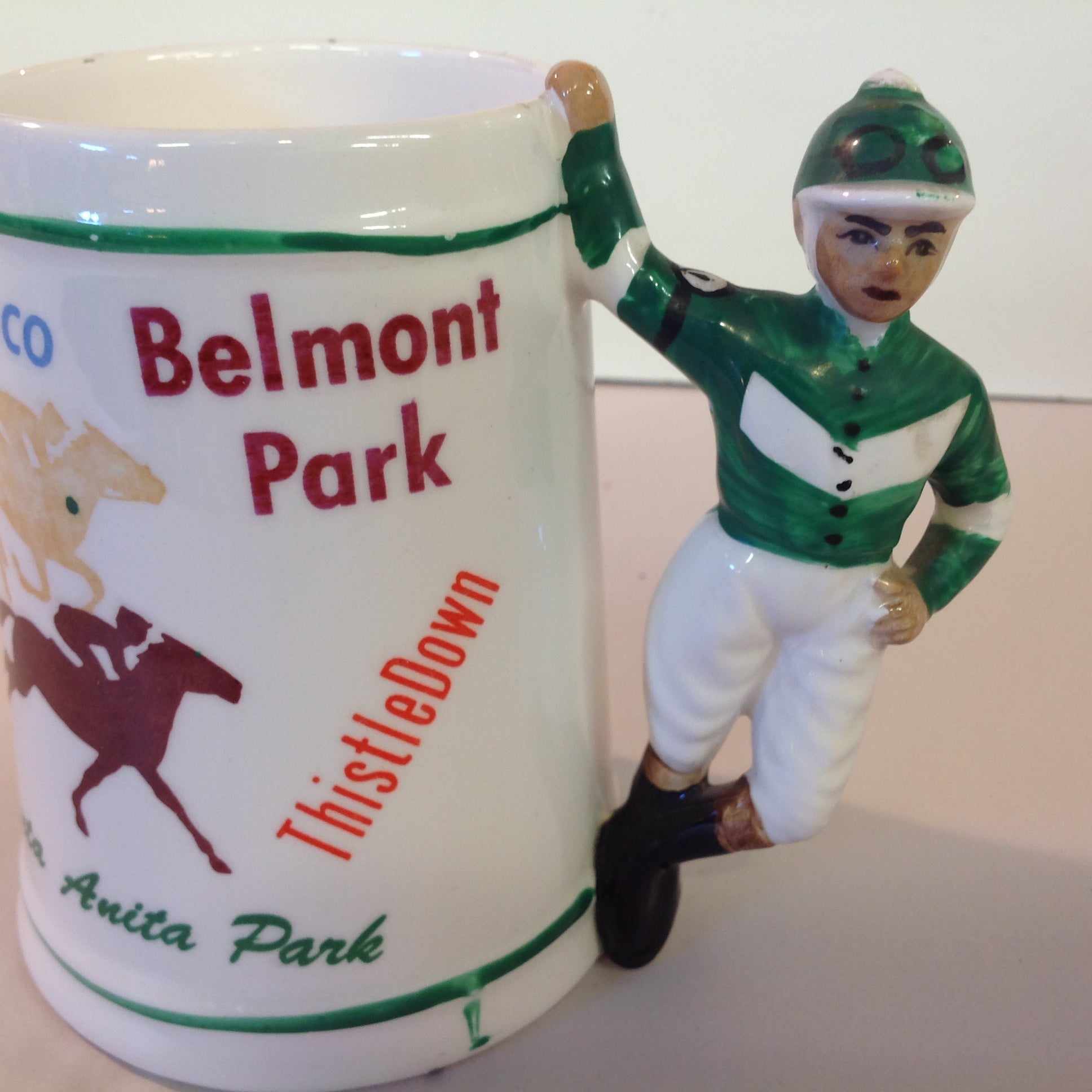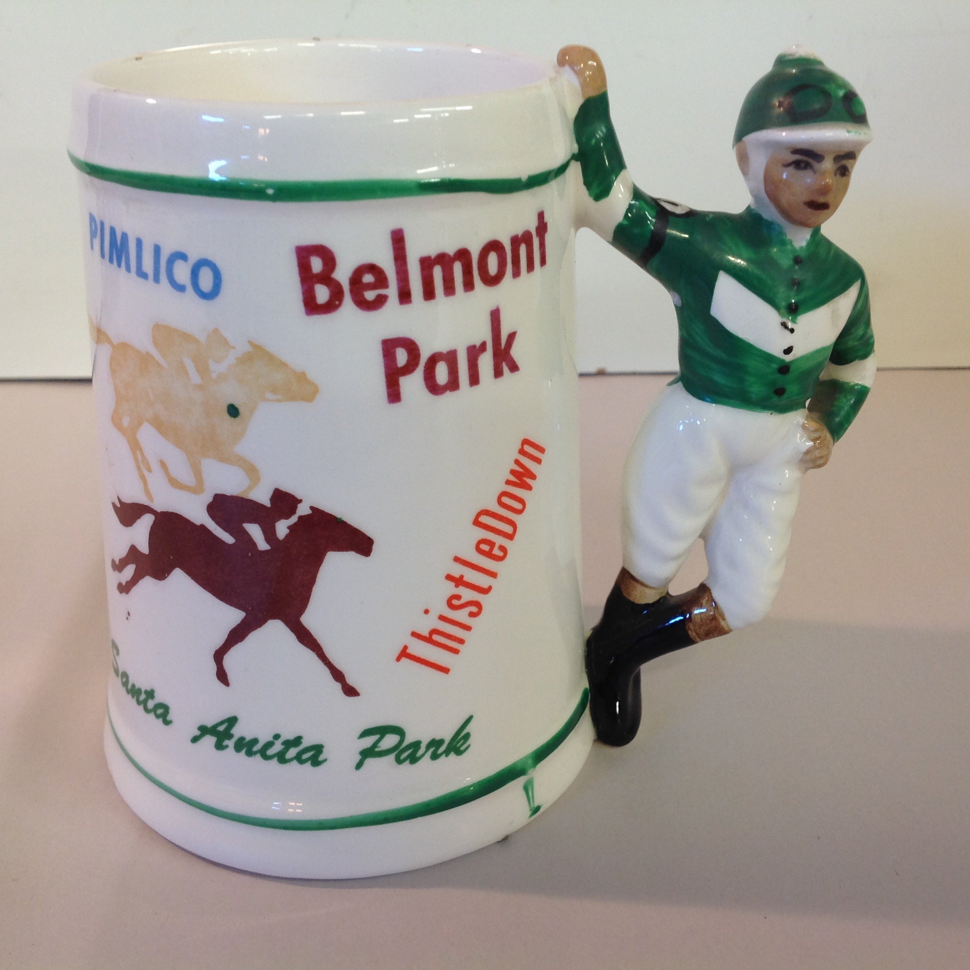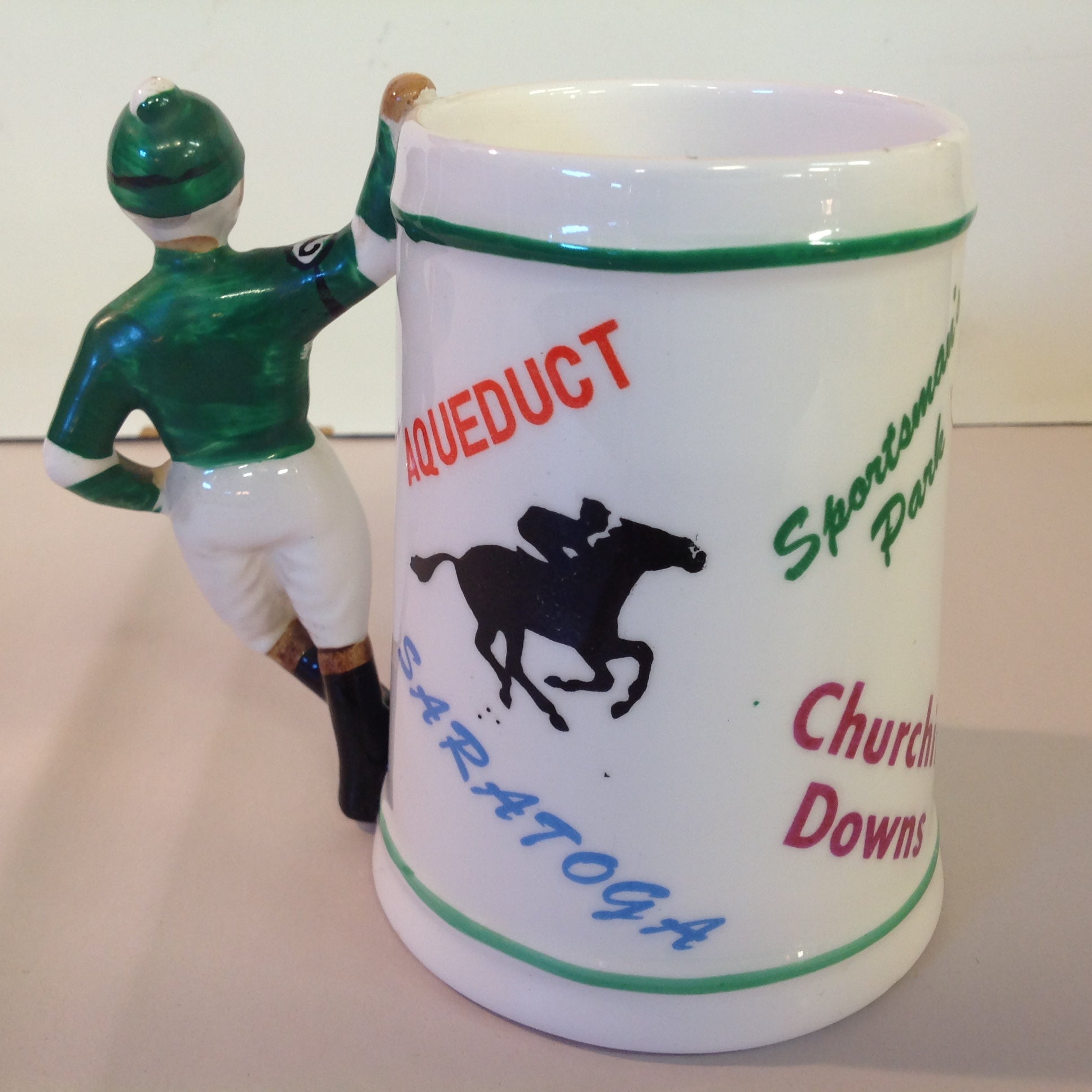 Vintage Souvenir Porcelain Horse Racing Mug Green Jockey #2 Race Parks Logos