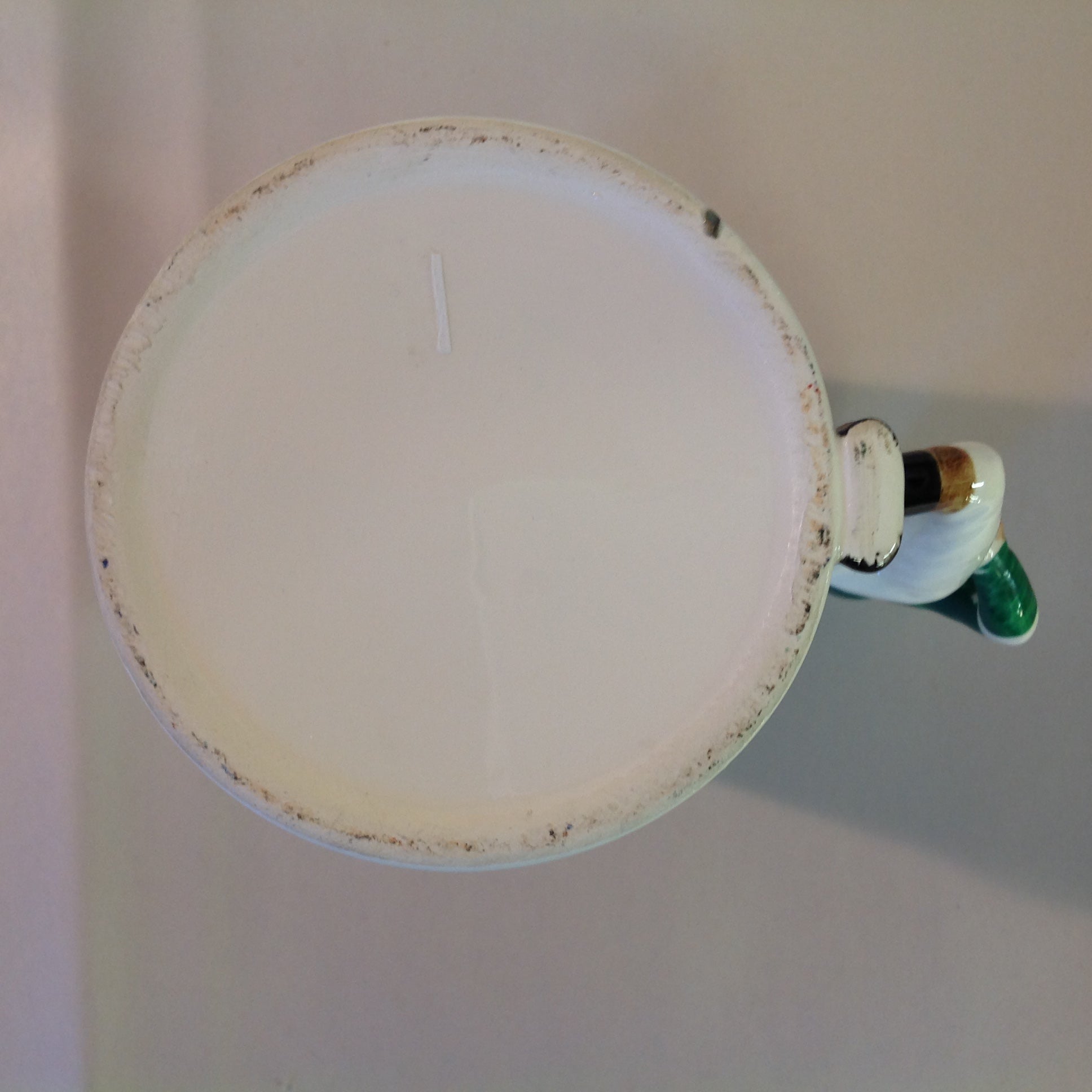 This is a vintage used item, in good used condition, with light signs of age/wear; there is mild rubbing to surface of mug, hint of wear to base, minor points of overpaint and glaze (manufacturer flaw), light wear to base, minor wear to graphics. Overall porcelain quality is good; smooth/glossy, with excellent preservation of color/sheen and graphics still sharp/vivid. There are no excessive nicks, chips, dents, divots, scrapes, scratches, scuffs, cracks, breaks, stains, residue or repairs. The mug measures approx 5" x 5.5" (to handle), with a 2.75" wide mouth and 3.5" wide base.