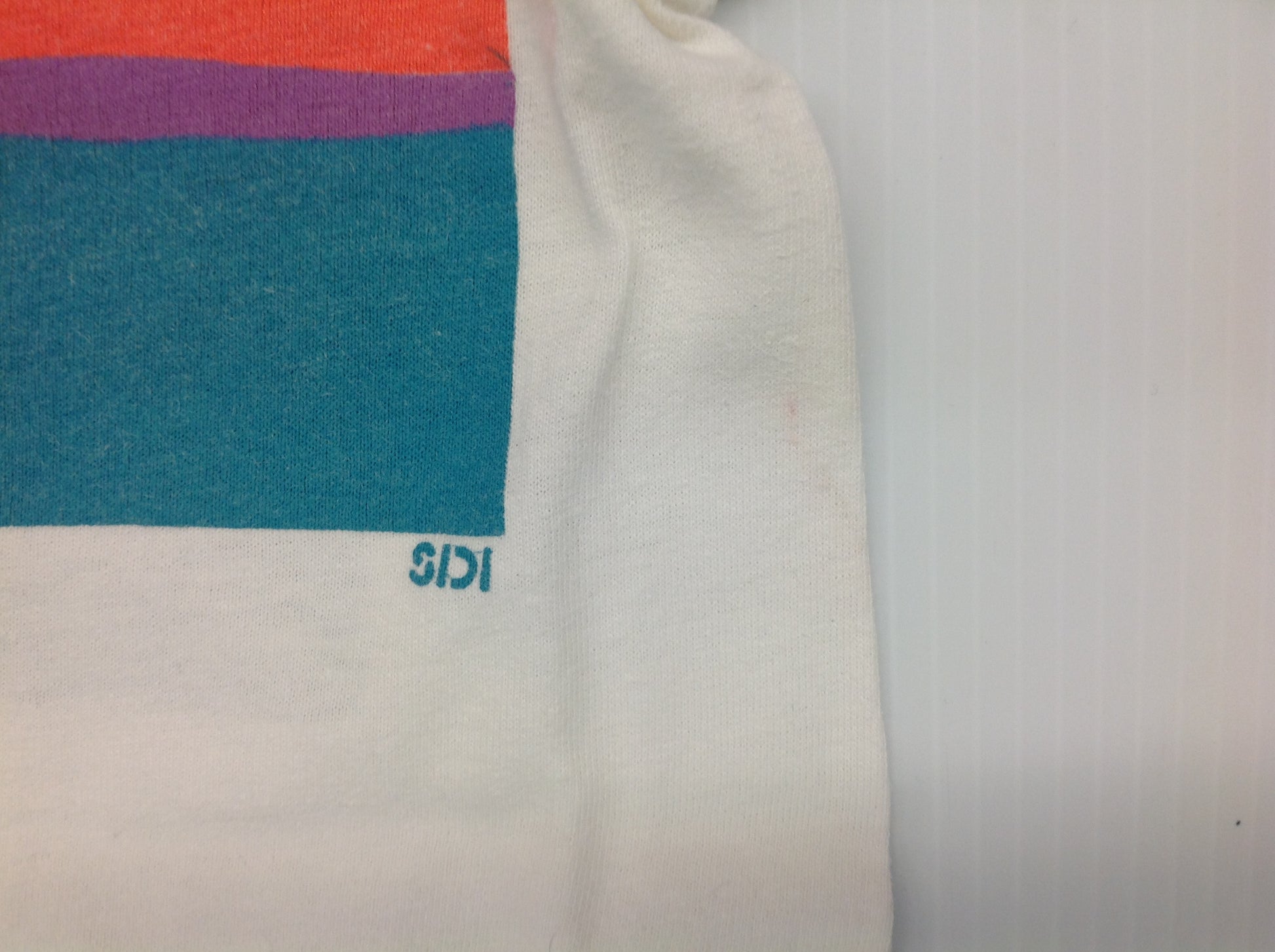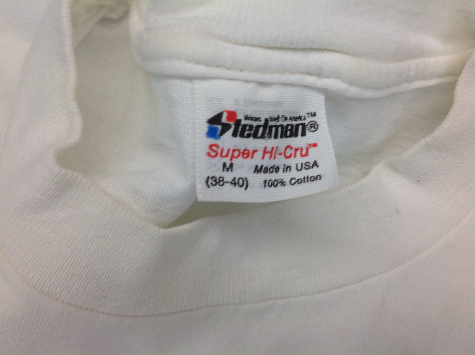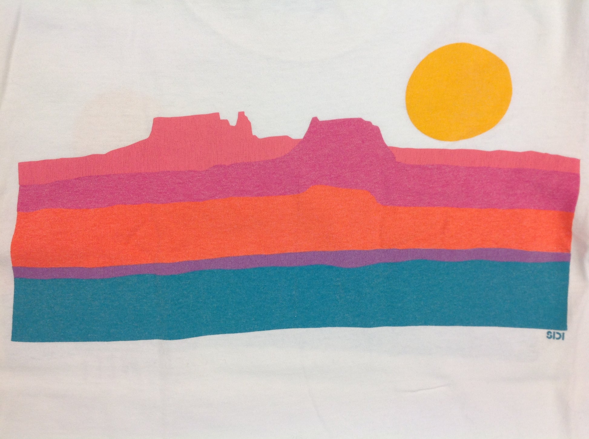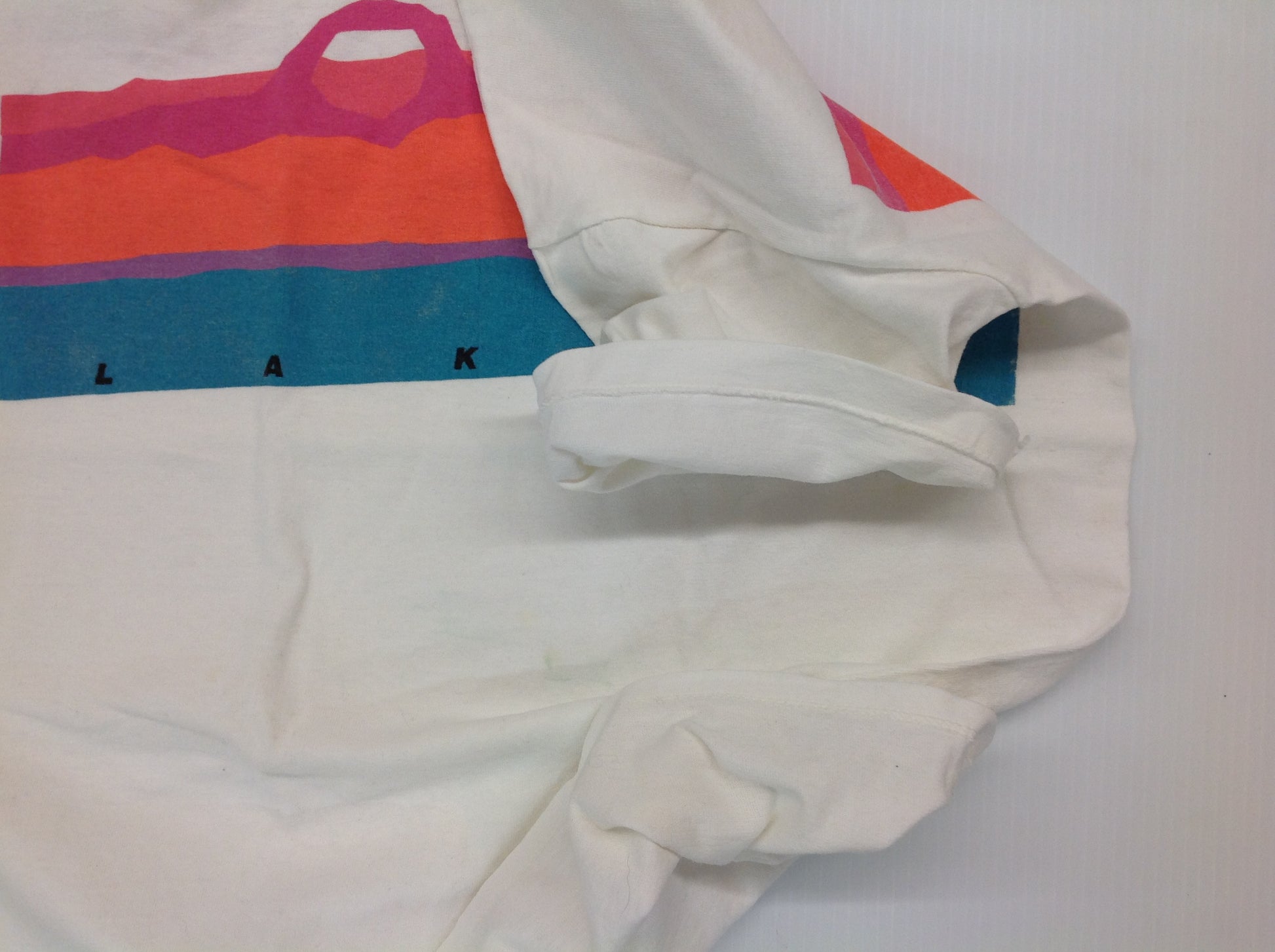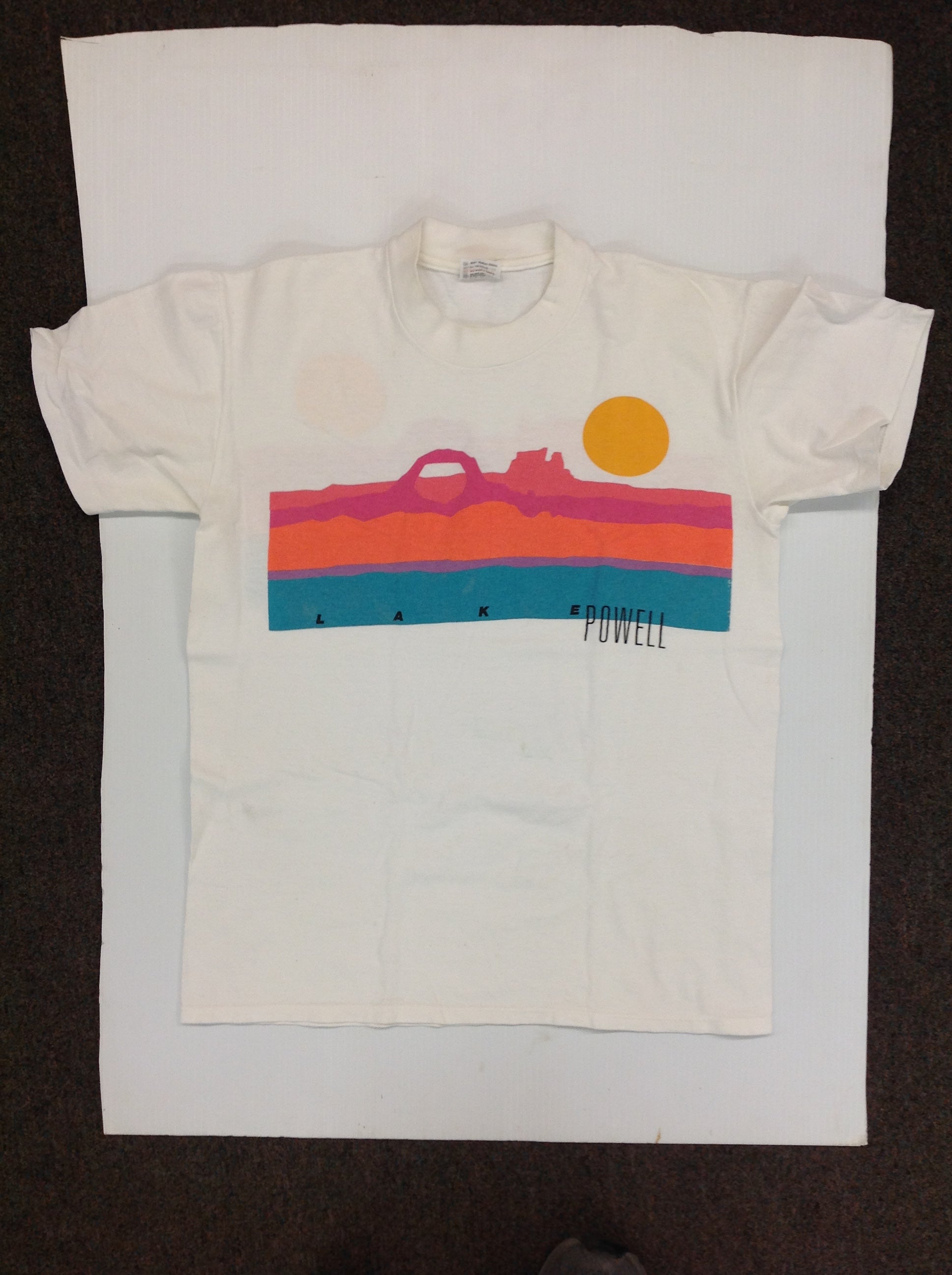 Here is a fun souvenir shirt from Stedman's Super Hi-Cru line of 100% cotton t-shirts featuring an abstract pastel shade sunset for Lake Powell in Utah and Arizona, in a men's medium (38-40). This is a vintage used item, in good used condition, with light signs of wear/age; there is minor rubbing to surface of shirt, mild wear to graphics, minor points of blemish (front right below logo/rear right center near sleeve). Overall 100% cotton quality remains good, soft/supple, with good preservation of color and graphics still warm/vivid. There are no excessive nicks, rips, tears, perforations, loose threads, stains, residue or repairs. The shirt is tagged as a Men's Medium (38-40) of 100% cotton, made in the USA. Overall shirt measurements are approx: Shoulder-to-shoulder: 18", Shoulder-to-sleeve: 7", Chest: 36", Overall length: 25"