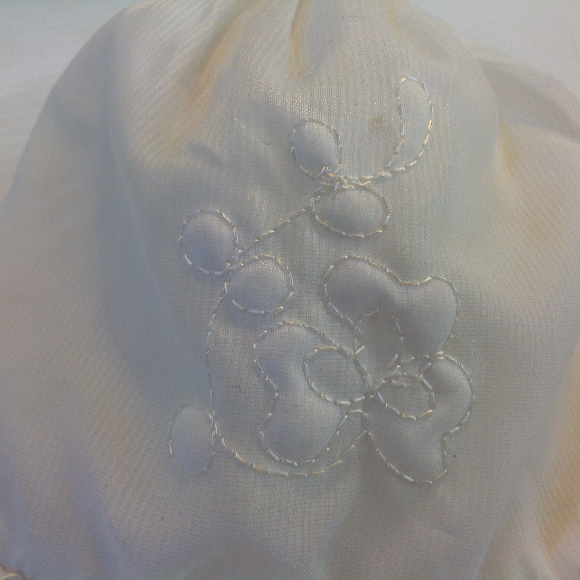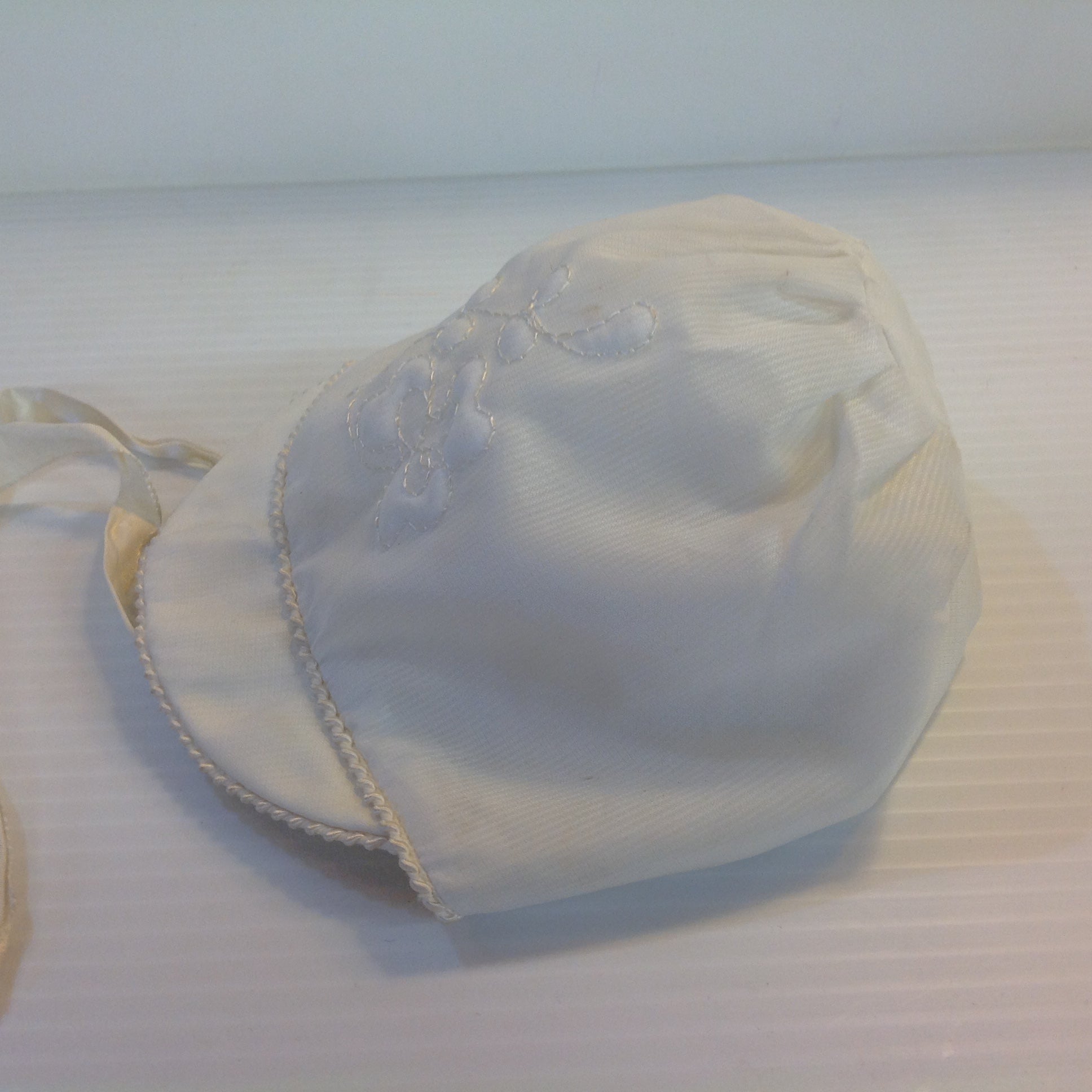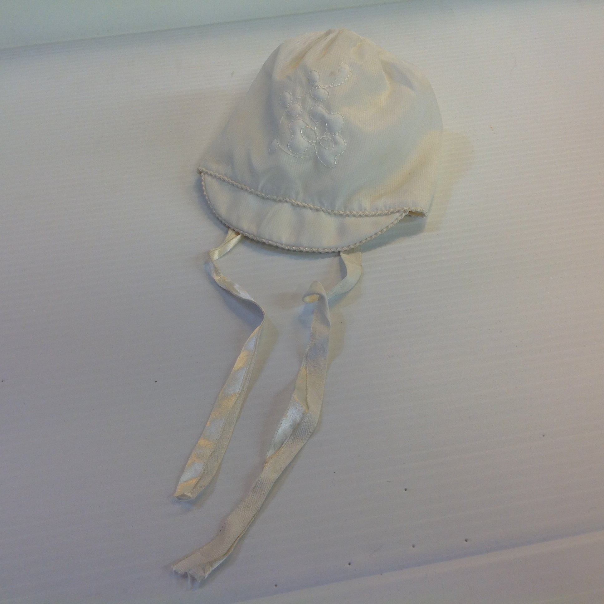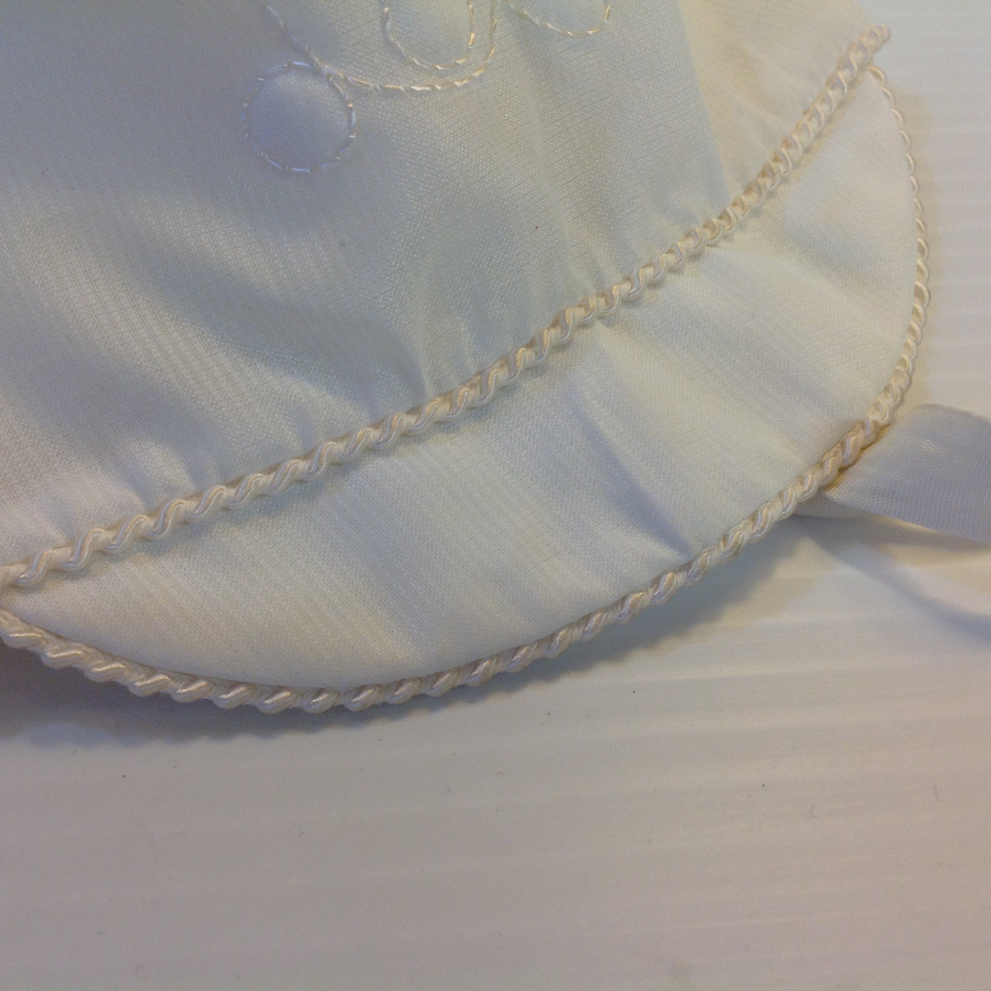 Vintage White Cotton Baby Cap Quilted Flower Satin Ribbons