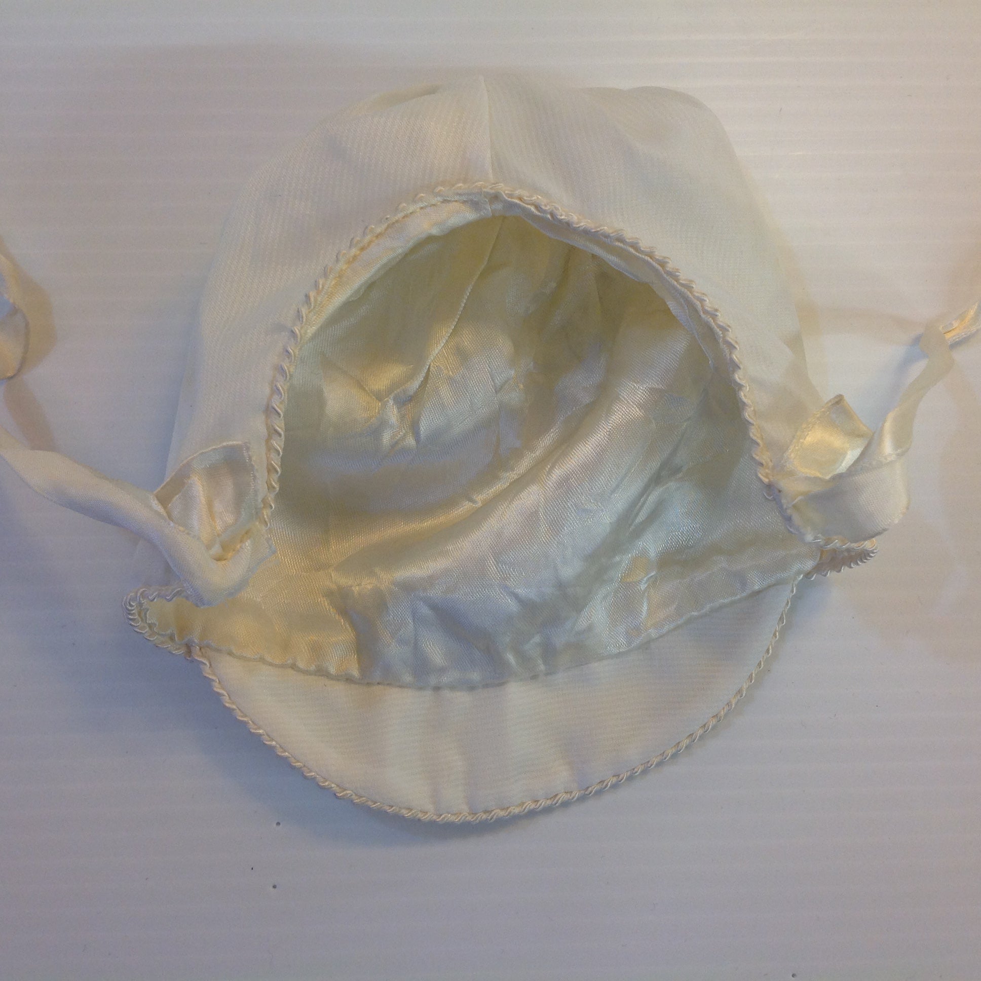 This is a vintage used item, in good used condition, with light signs of age/wear; there is mild rubbing to surface of fabric, light wear to ribbon closure, faint fading to fabric whites. Overall fabric quality is good; smooth/clean, soft/supple, with good preservation of color/sheen and embroidered embellishments still clear. There are no excessive nicks, rips, tears, perforations, stains, residue or repairs. The cap measures approx 5" round, with ribbons each approx 12.5" long.