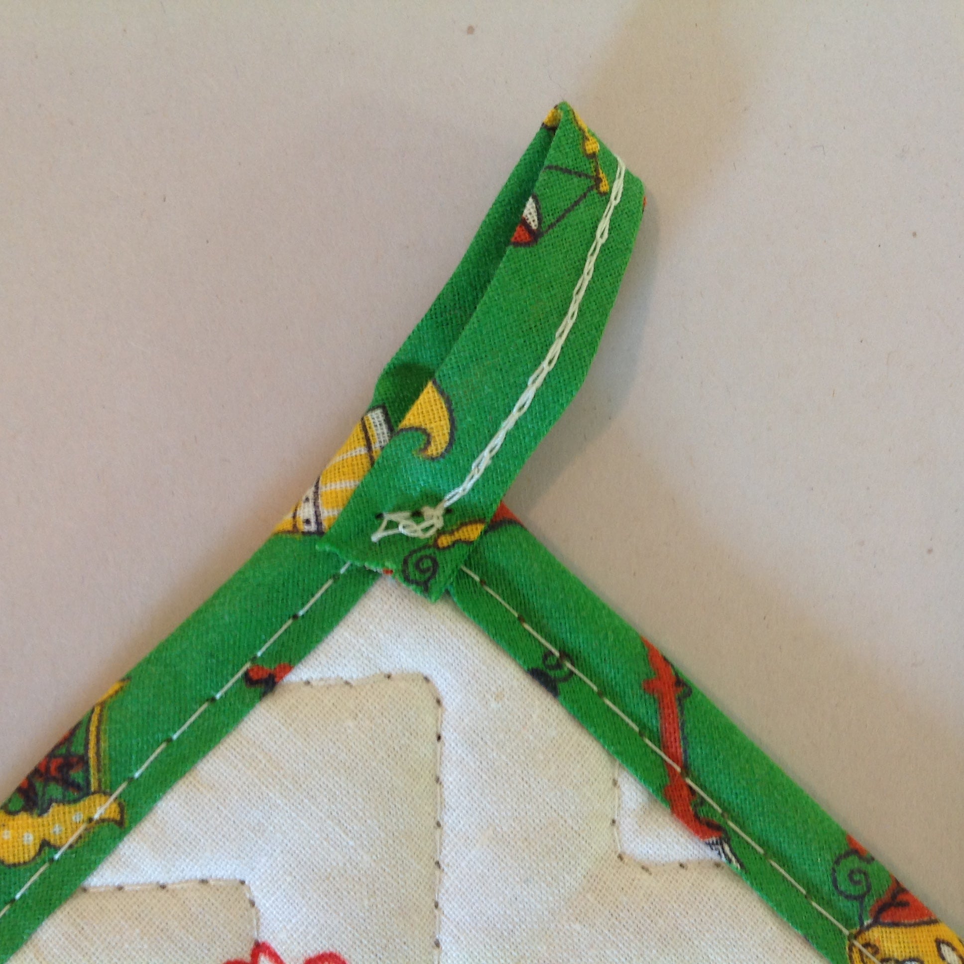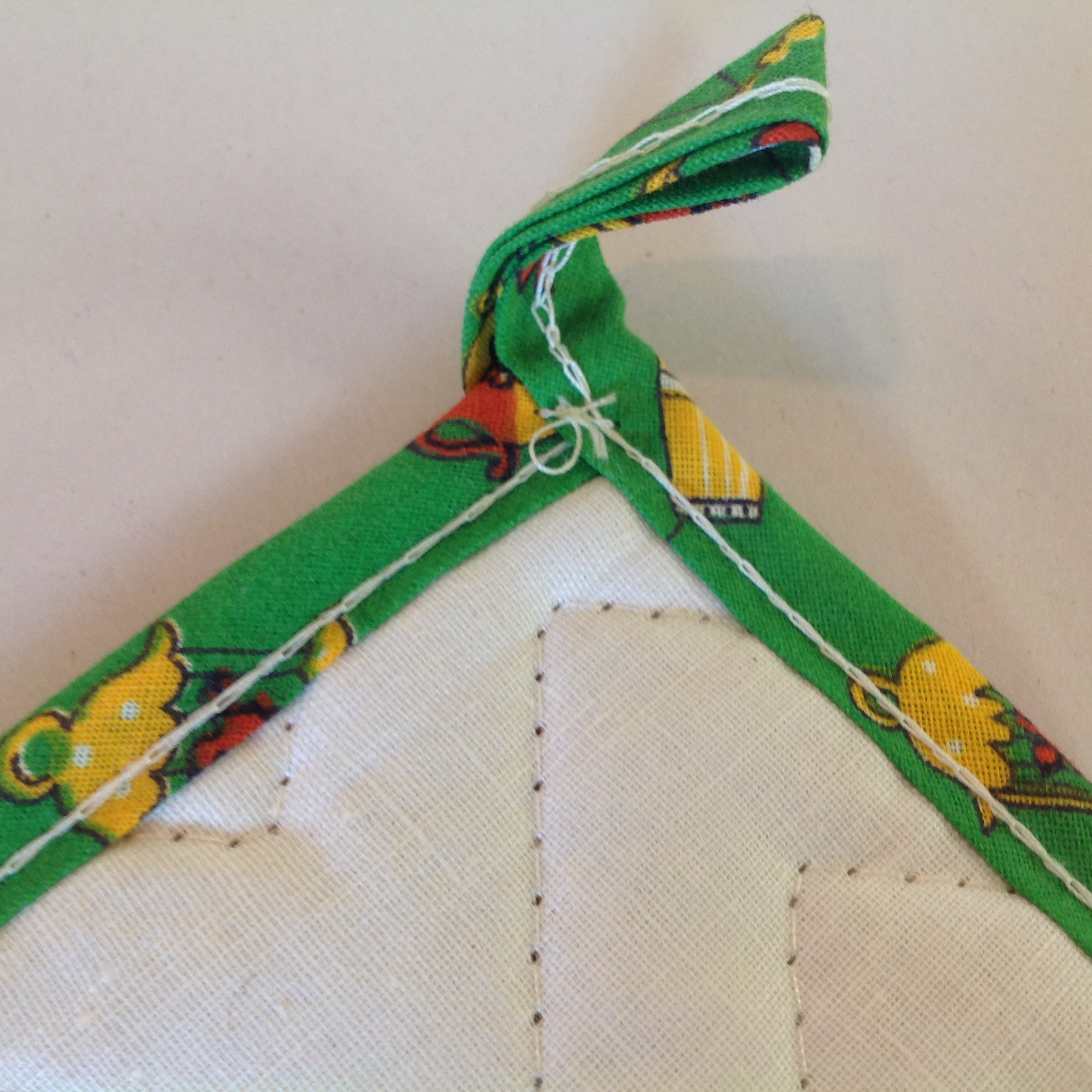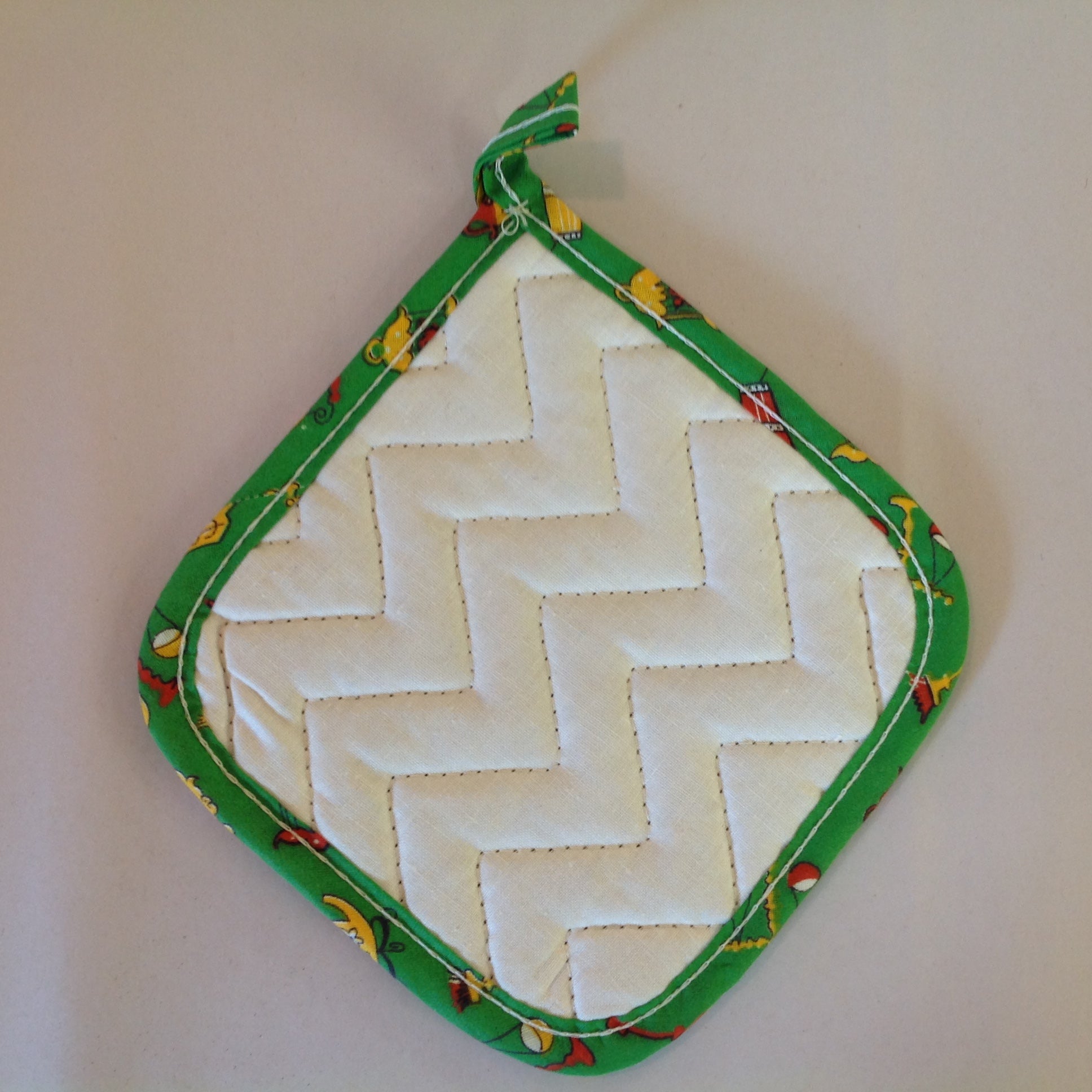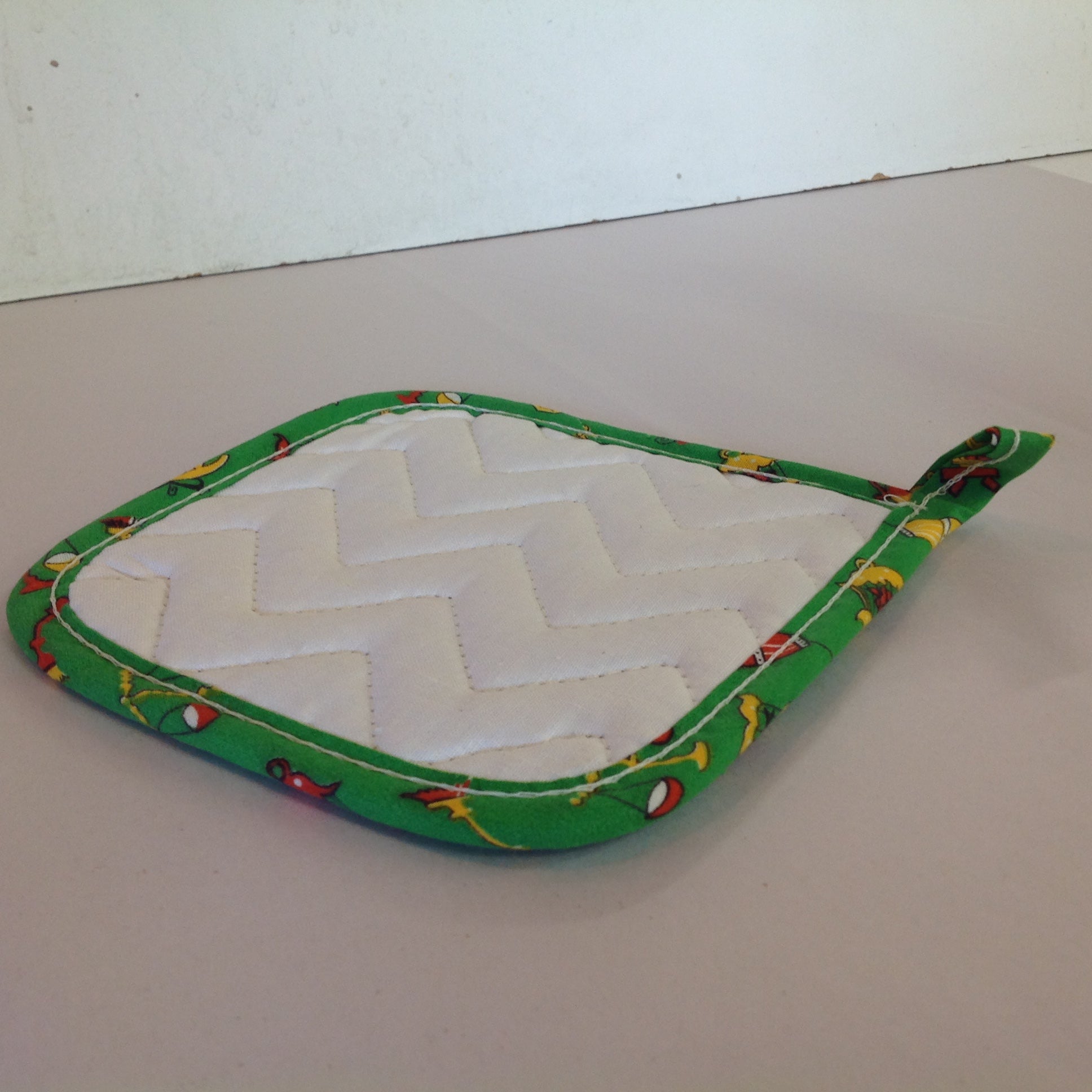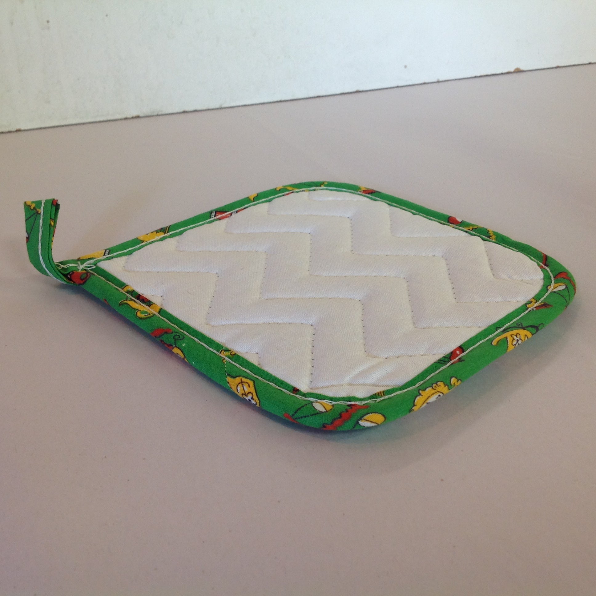 The pot holder measures approx 6" x 6", with 1.5" loop for hanging.